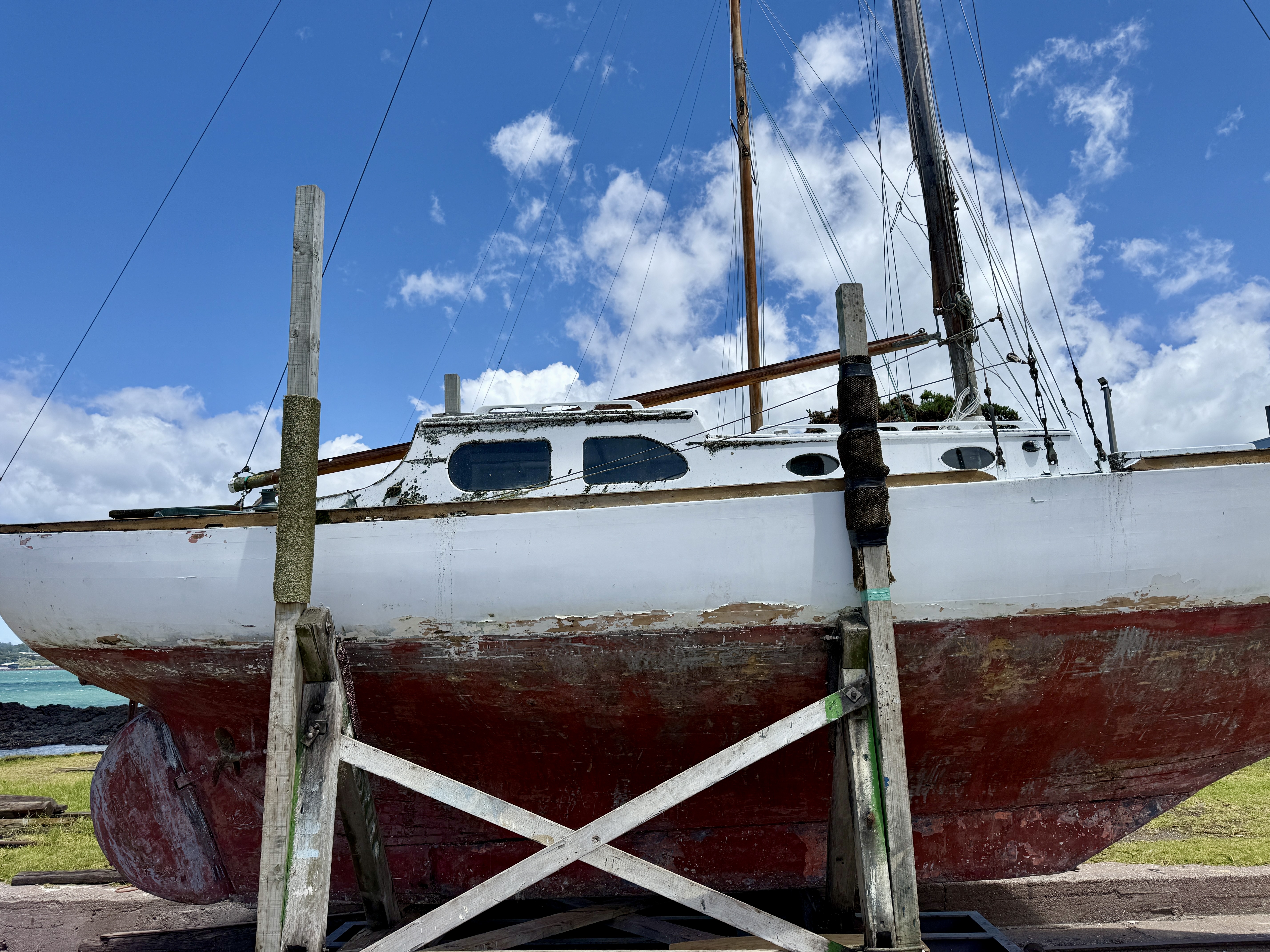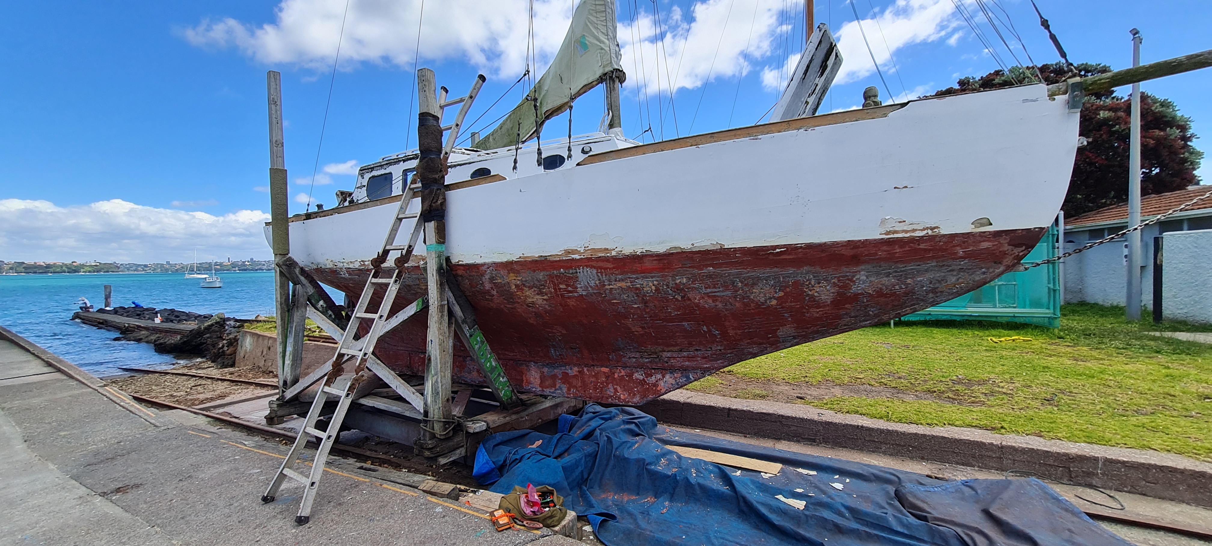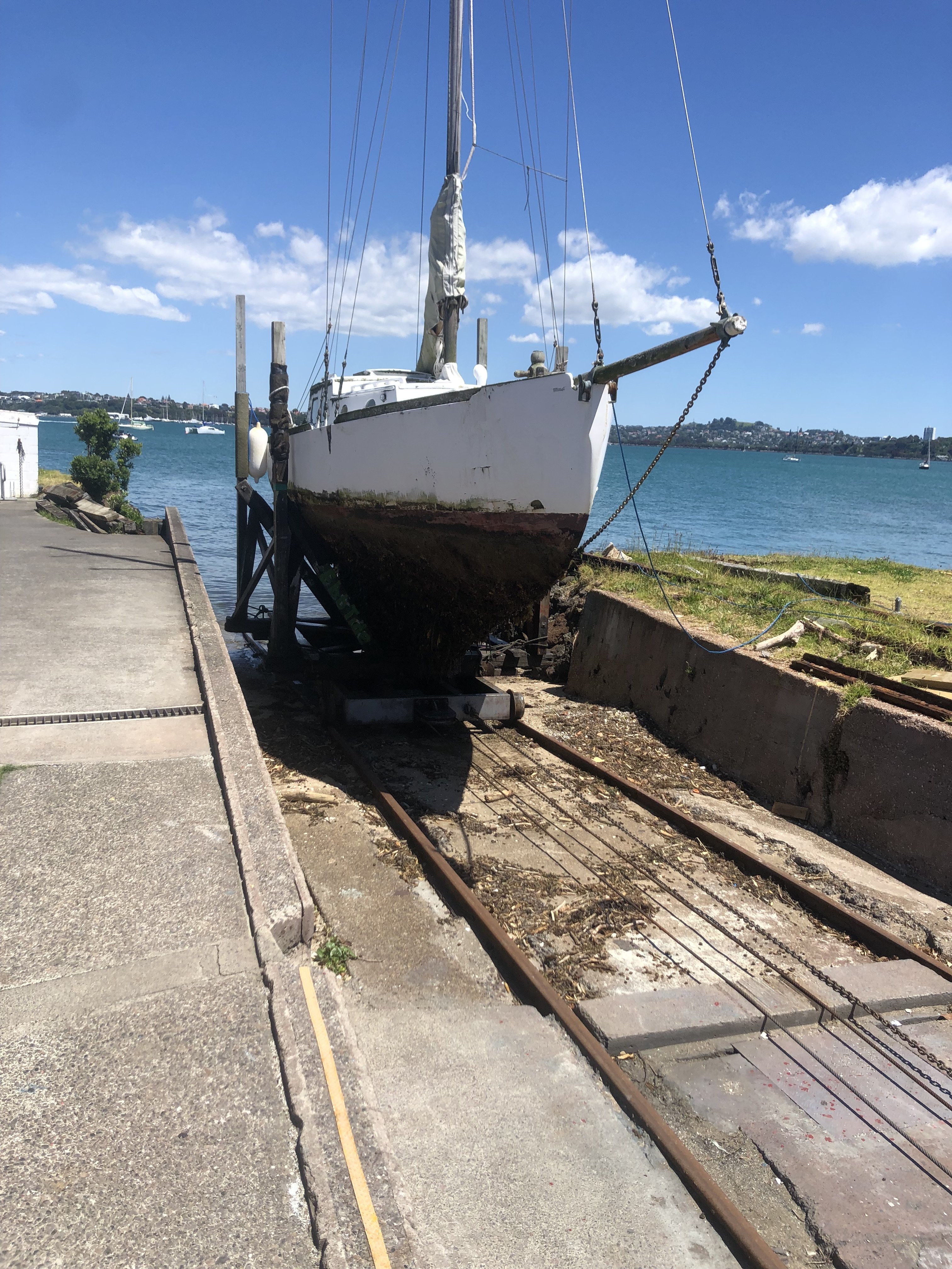 The Woollacott Association has hauled her out at the Devonport Yacht Club for approx. two weeks, as you’ll see in the photos the first step was to scrap the weed off and give it a good water blast. Then its onto sanding ready for anti-fouling. Then if possible i.e. spare hands and time permitting, it would be great to get the topside’s sanded and painted at the same time, along with working through getting the motor running.