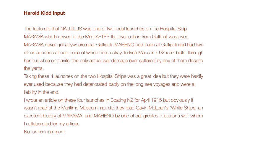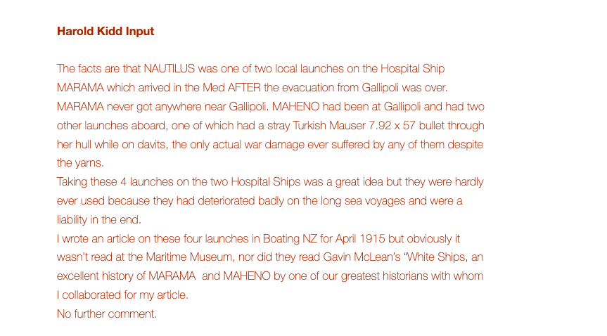 Now NAUTILUS has made many appearances and WW generated debate around her history. I have included below a past comment from marine historian Harold Kidd, who is the fountain of knowledge in your wooden boating community. My rule is unless there is rock solid proof of an opposing view – HDK is the single source of truth 🙂