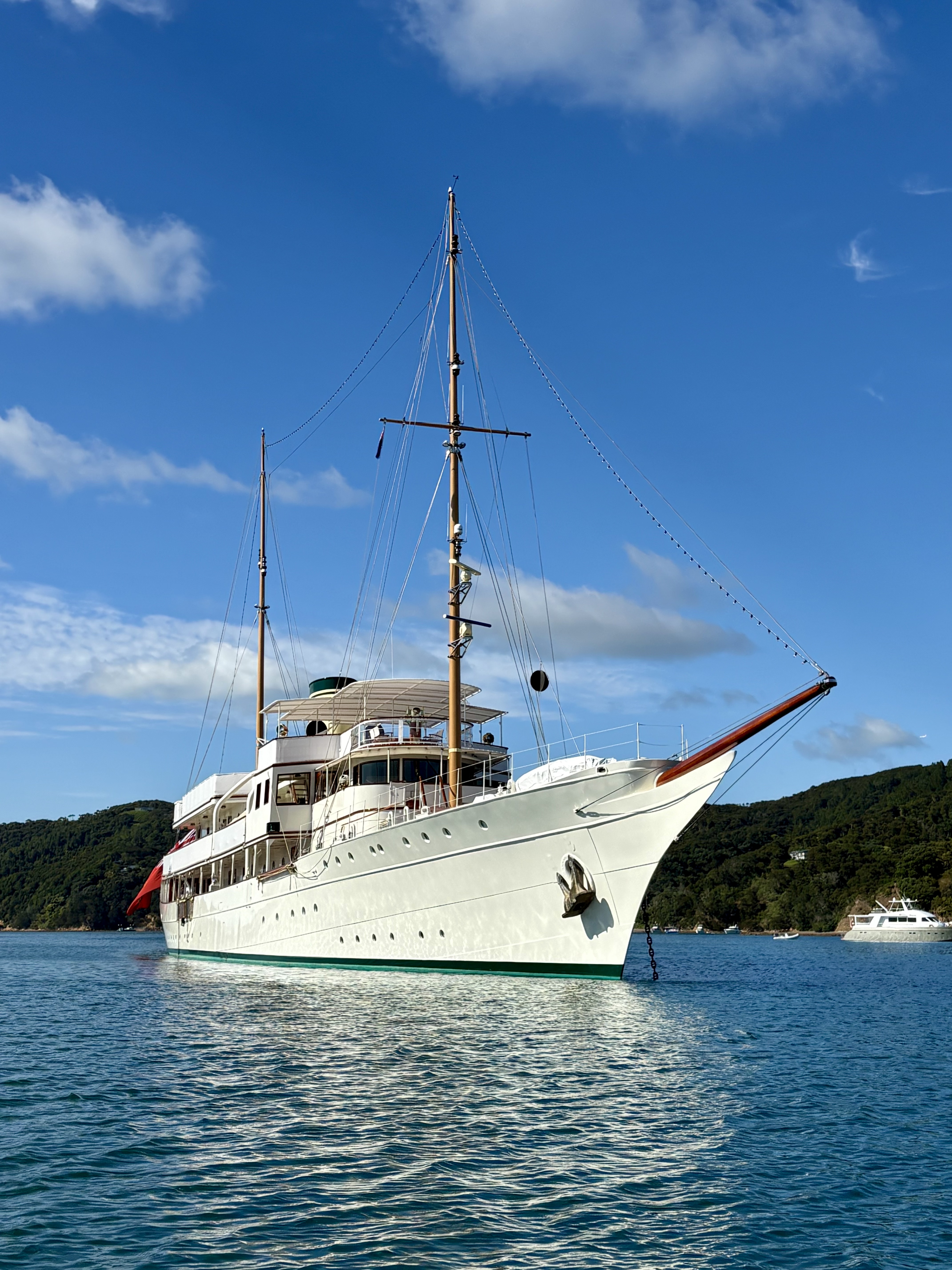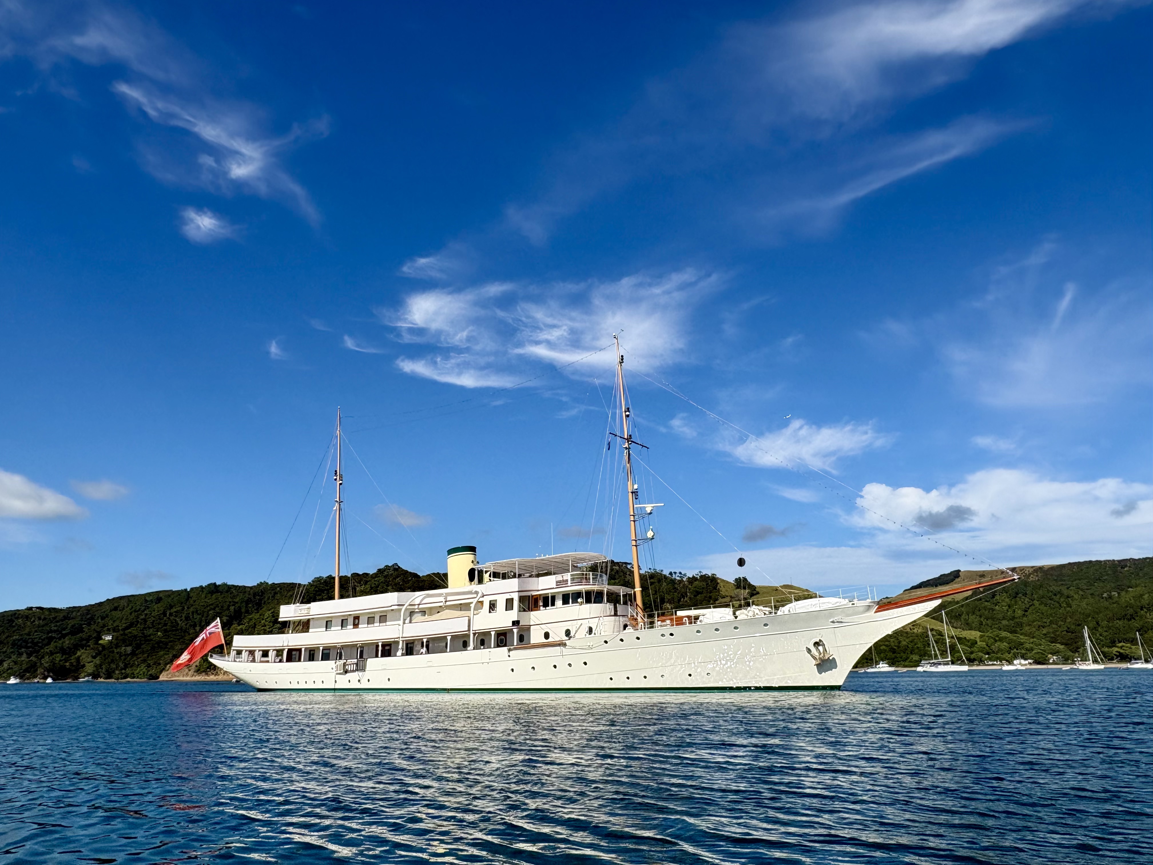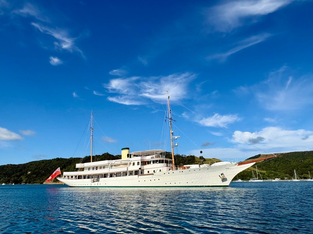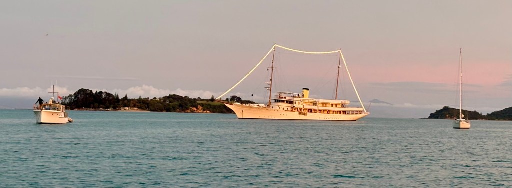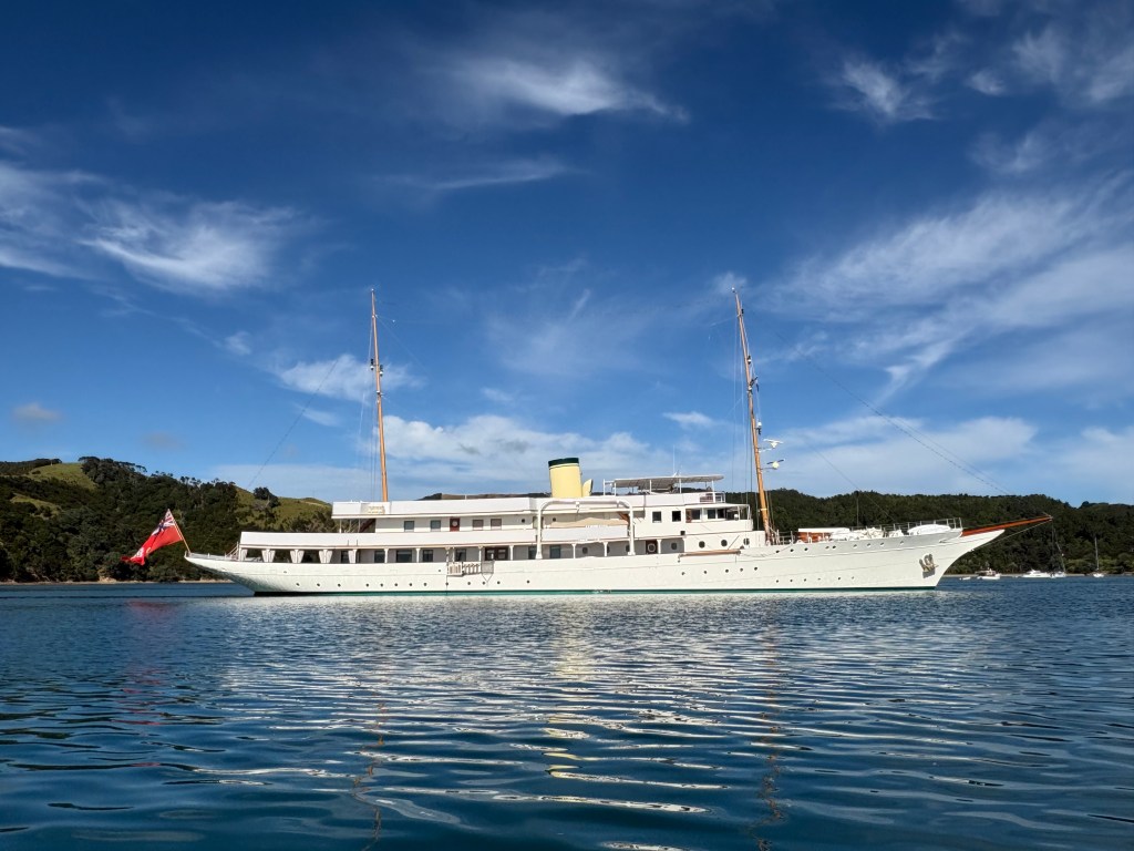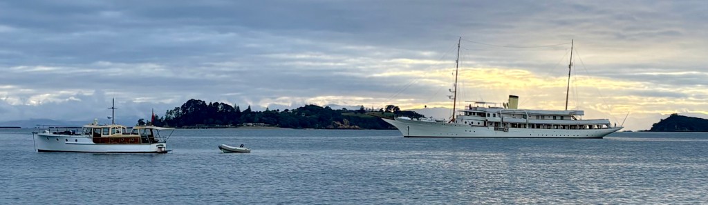 Angus was overnighting in Man ‘o’ War Bay, Waiheke Island and was sharing the anchorage with the 233’ majestic CLASSIC super yacht – HAIDA, built in 1929 (originally steam powered). When last in NZ, March 2014, she was owned by Sir James Dyson, the Dyson vacuum cleaner billionaire. Rumour has it these days owned by another billionaire from Hong Kong.