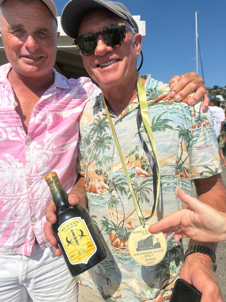 WINNERS ARE GRINNERS – The winner of the log rally was the Owen Woolley built launch – KORAWAI, owned by Tania and Matt Cooper. Photo below of Matt (R) and cabin boy Grant Gibbs. I suspect they won it fair and square – I know both well and both are luddites when it comes to technology 🙂