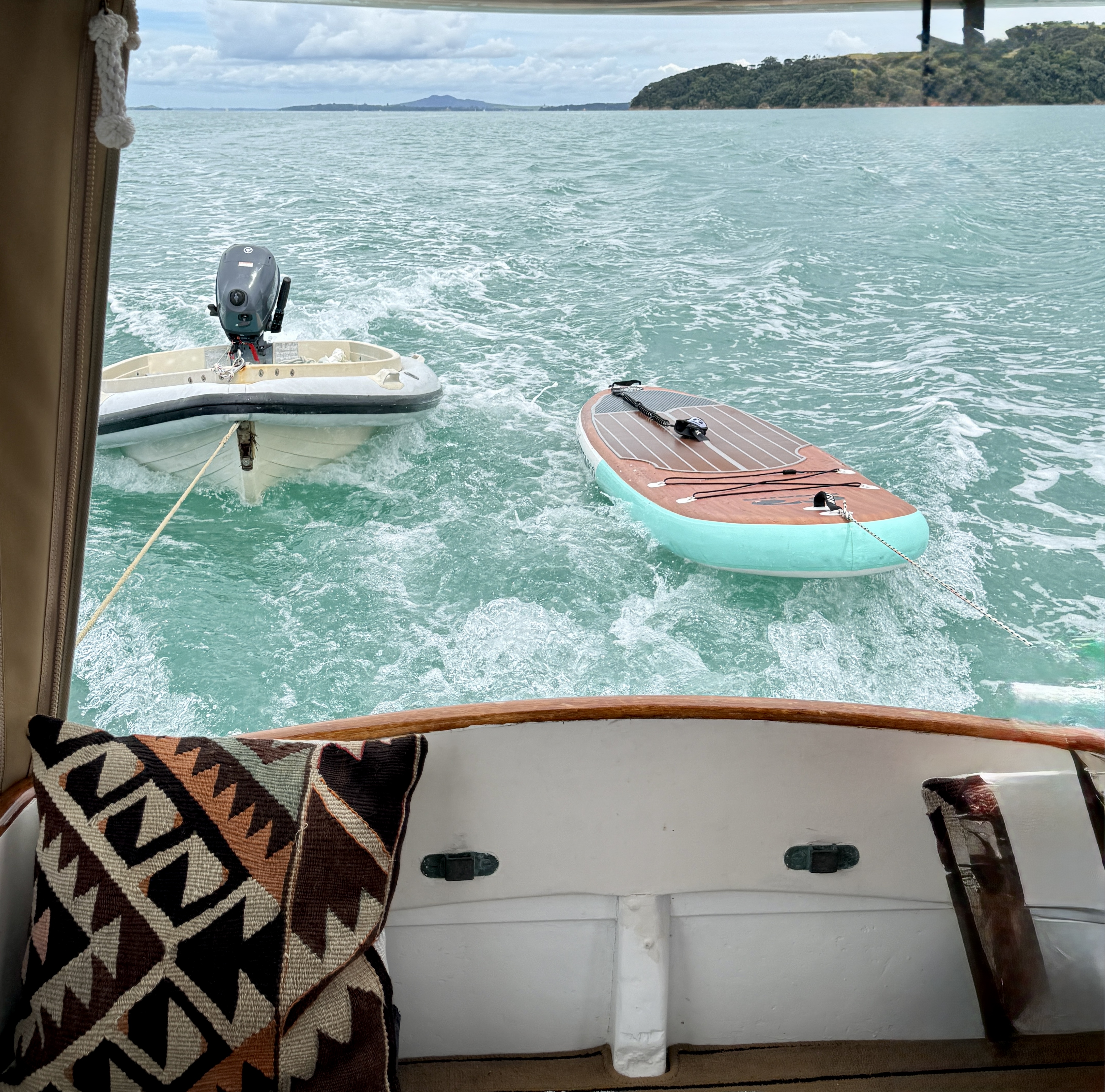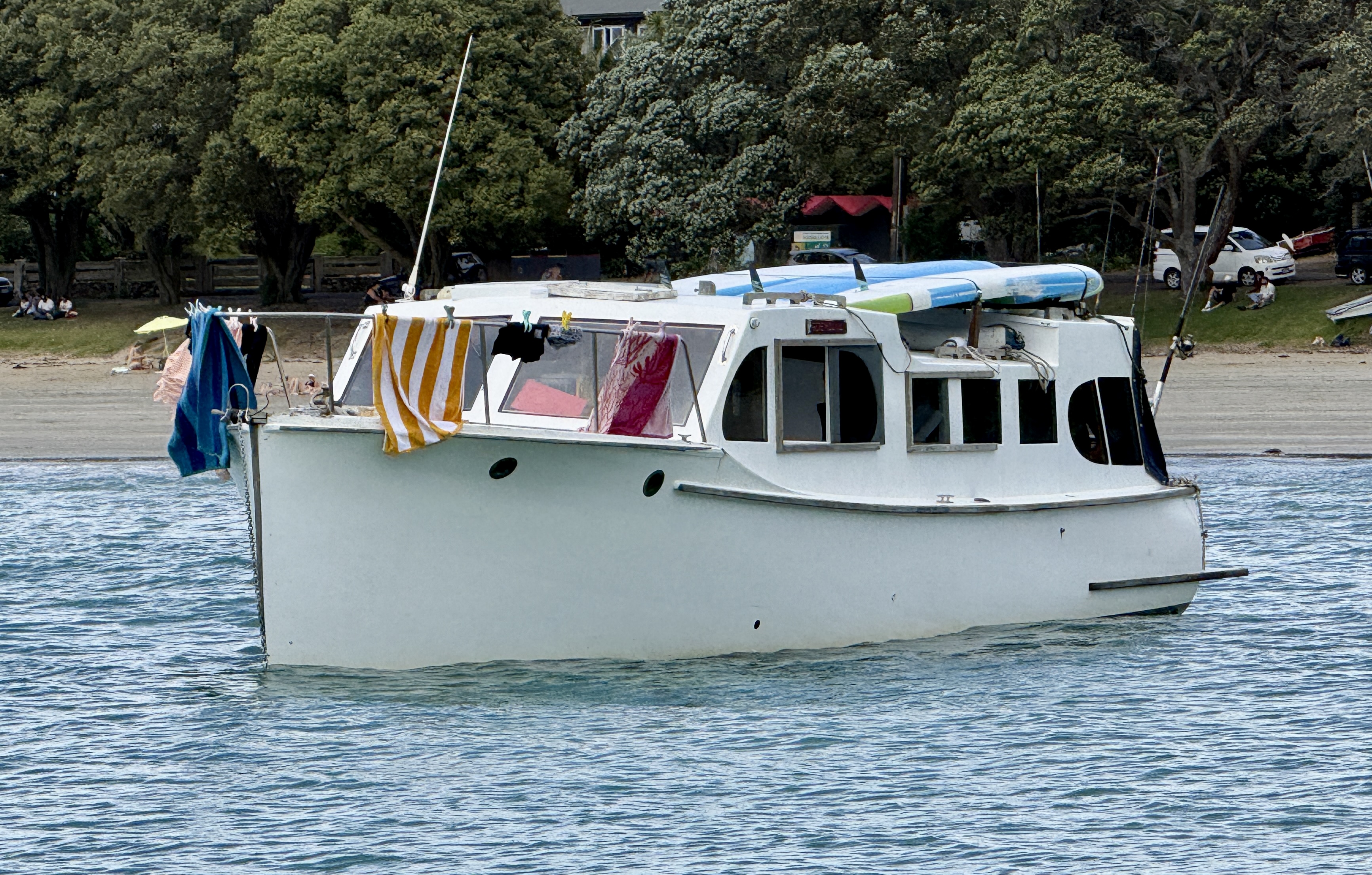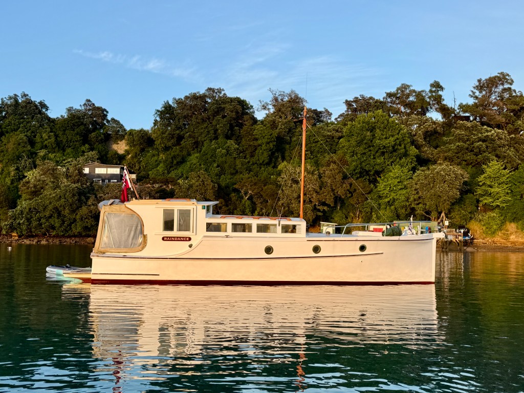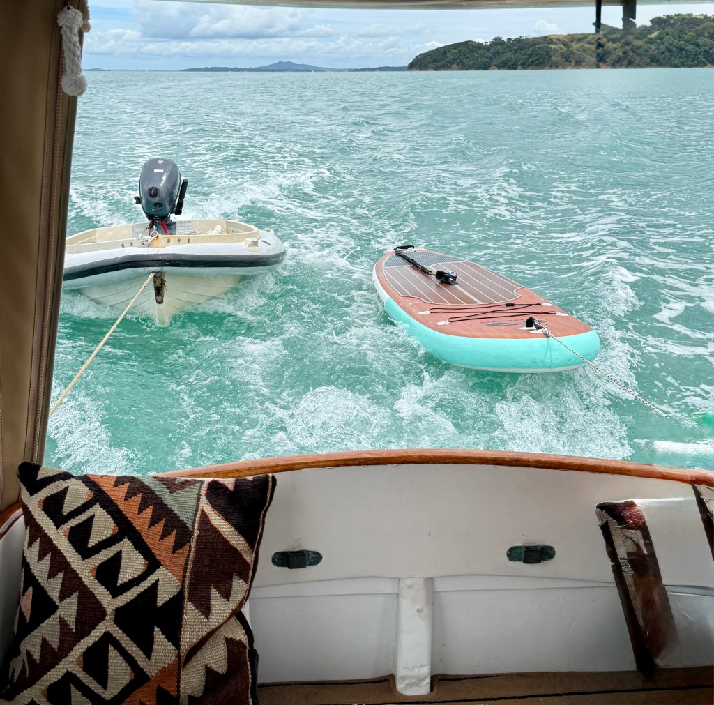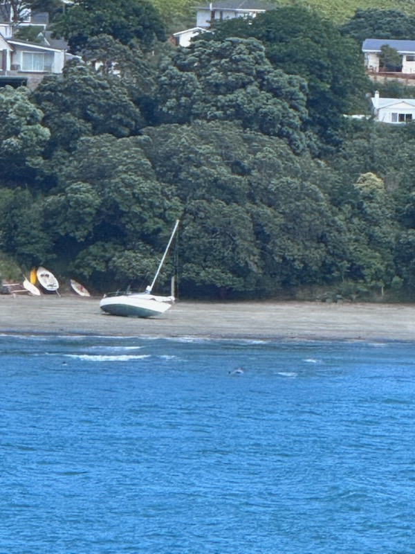 Life on a small launch with a wife, dog and a paddle board can be challenging – normally takes us 2>3 days to get used to living in close proximity, but we have managed this for 18+ years. The bad weather days / nights that include having to take the pooch ashore for a pee in 40+ knots at 6am are quickly replaced with good food, good books and good booze 🙂 One of the positives of evil weather forecasts is low boat numbers, when things improved and we moved to Oneroa for a supply stop, the only other craft in the bay was a yacht and that was ‘washed up’ on the beach.