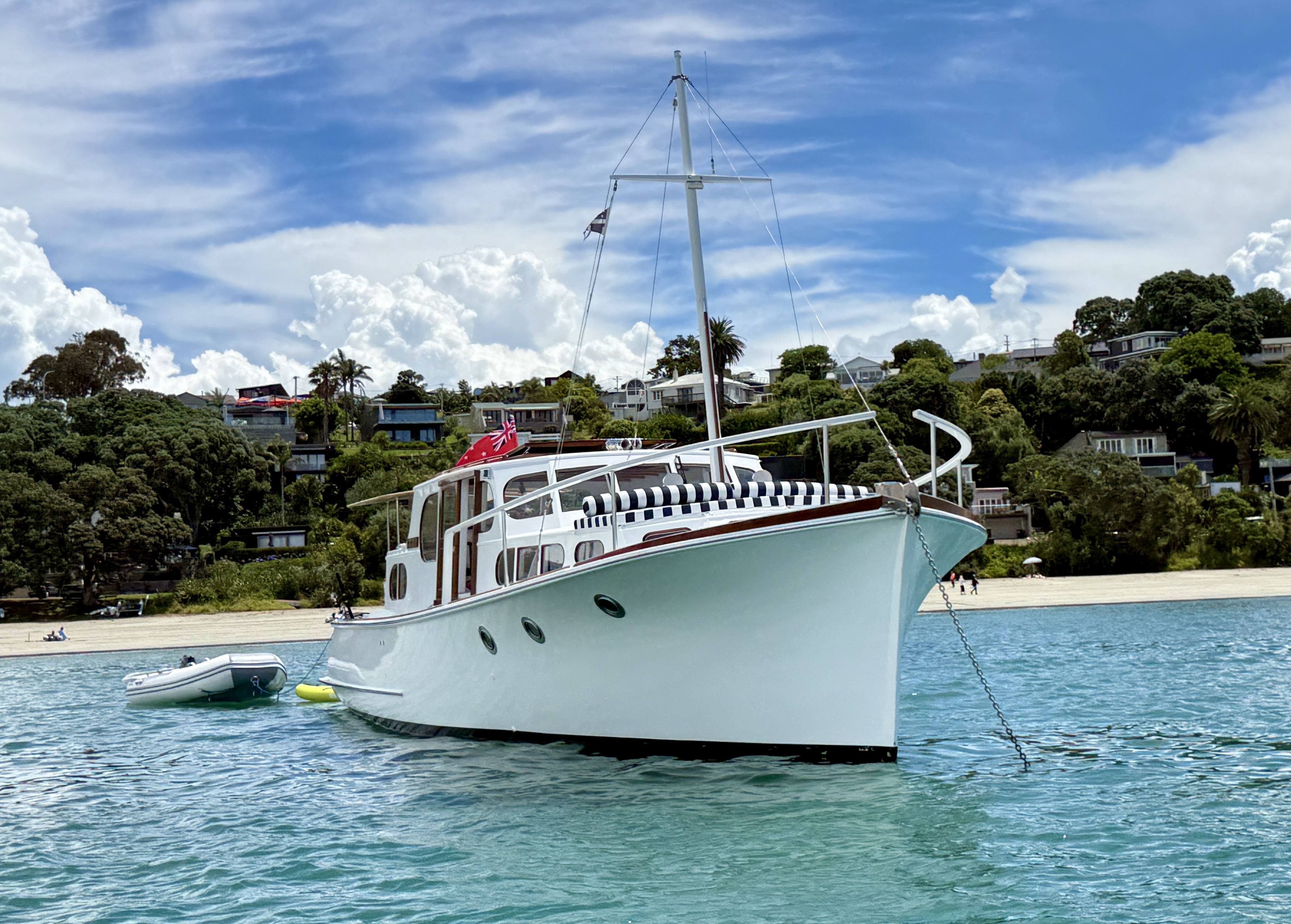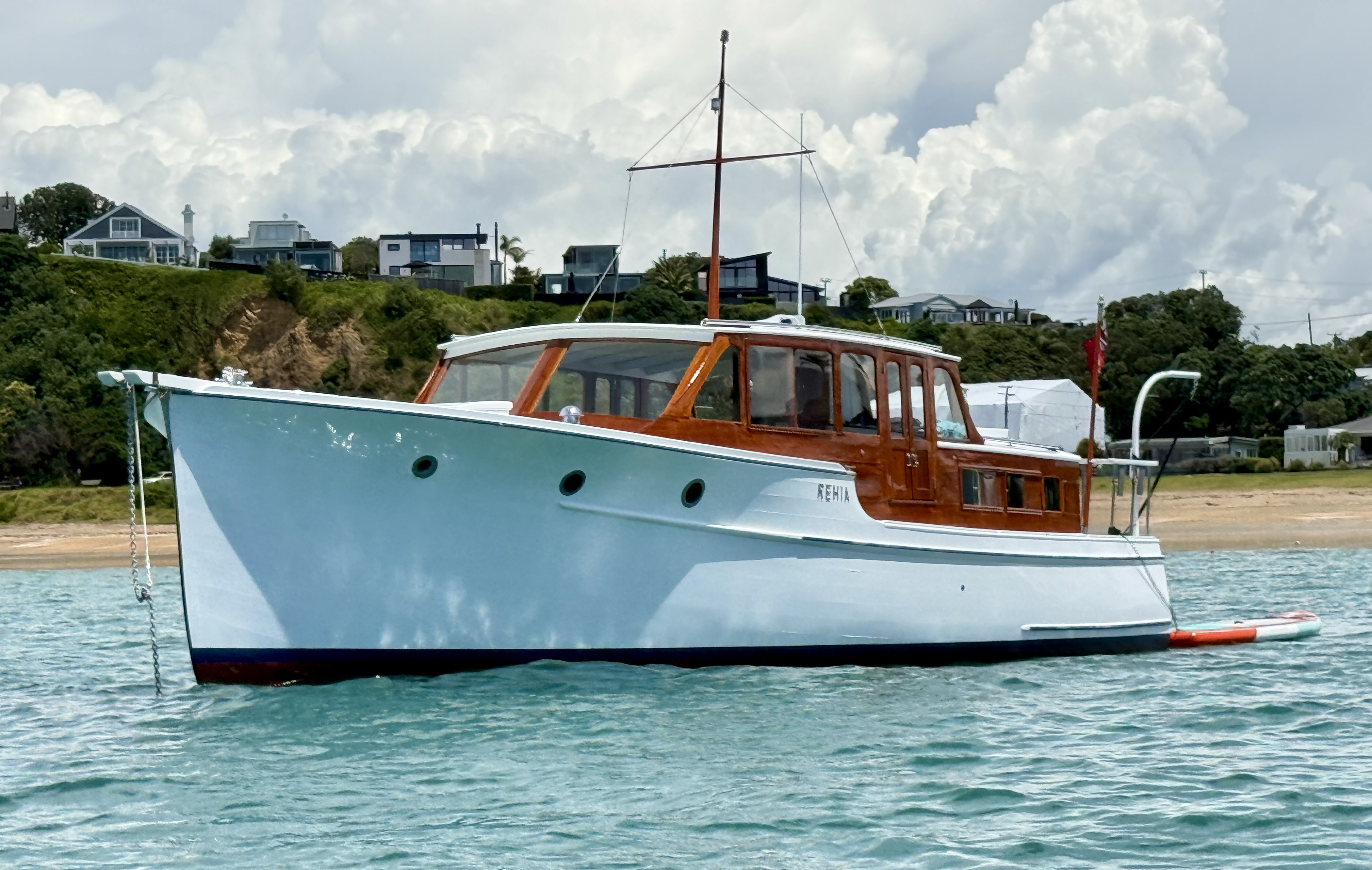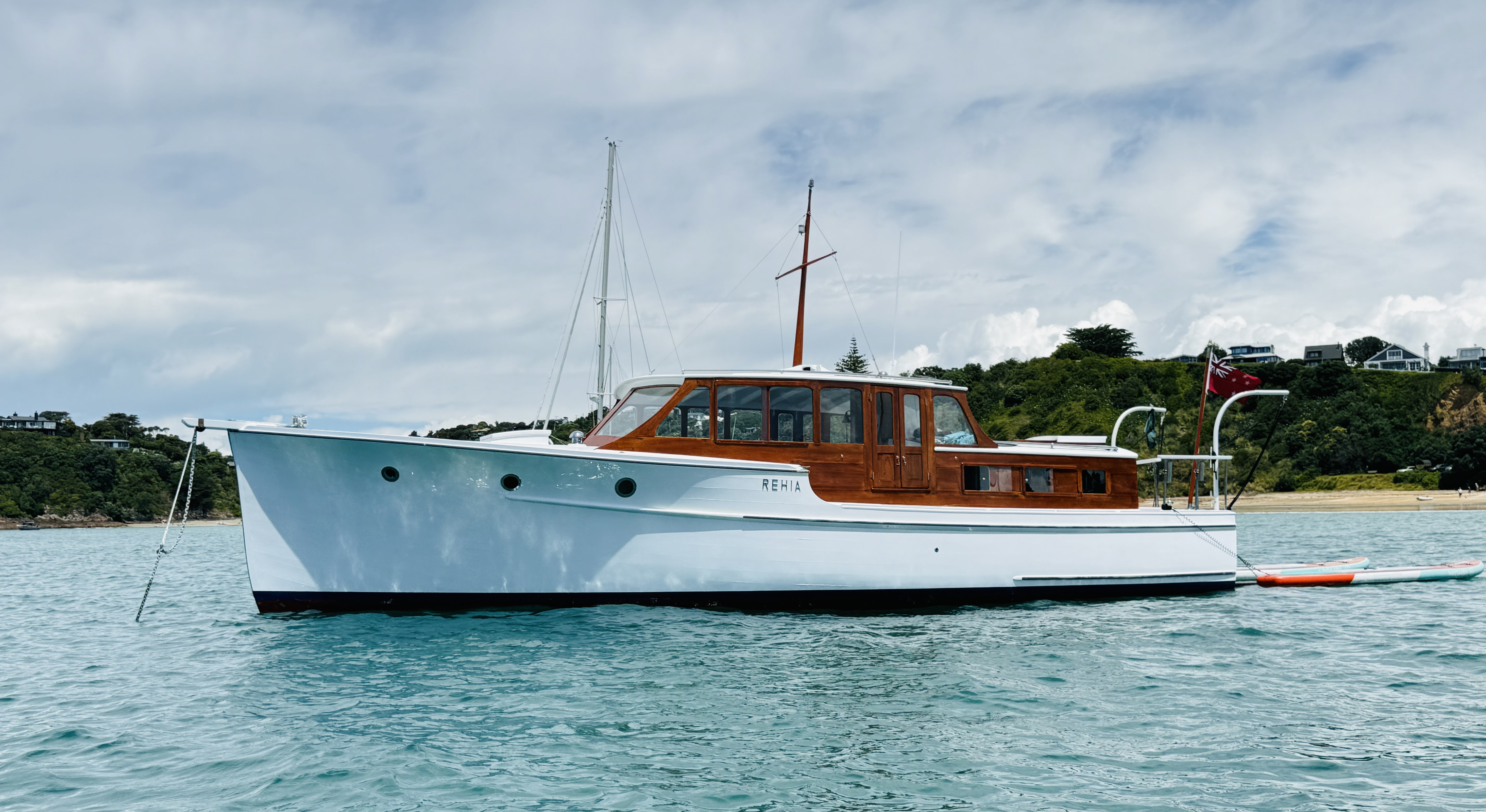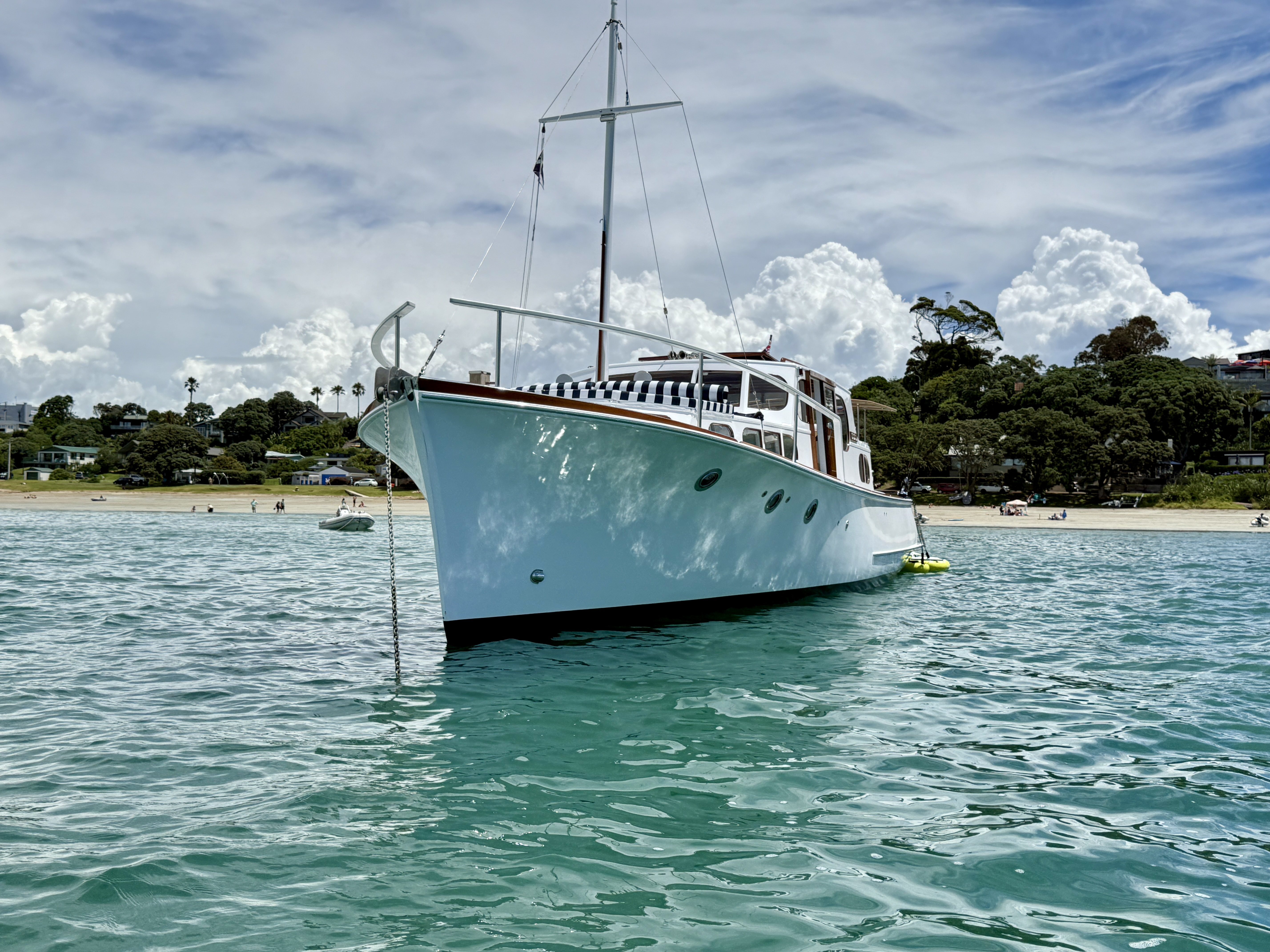 Life on a small launch with a wife, dog and a paddle board can be challenging – normally takes us 2>3 days to get used to living in close proximity, but we have managed this for 18+ years. The bad weather days / nights that include having to take the pooch ashore for a pee in 40+ knots at 6am are quickly replaced with good food, good books and good booze 🙂 One of the positives of evil weather forecasts is low boat numbers, when things improved and we moved to Oneroa for a supply stop, the only other craft in the bay was a yacht and that was ‘washed up’ on the beach.