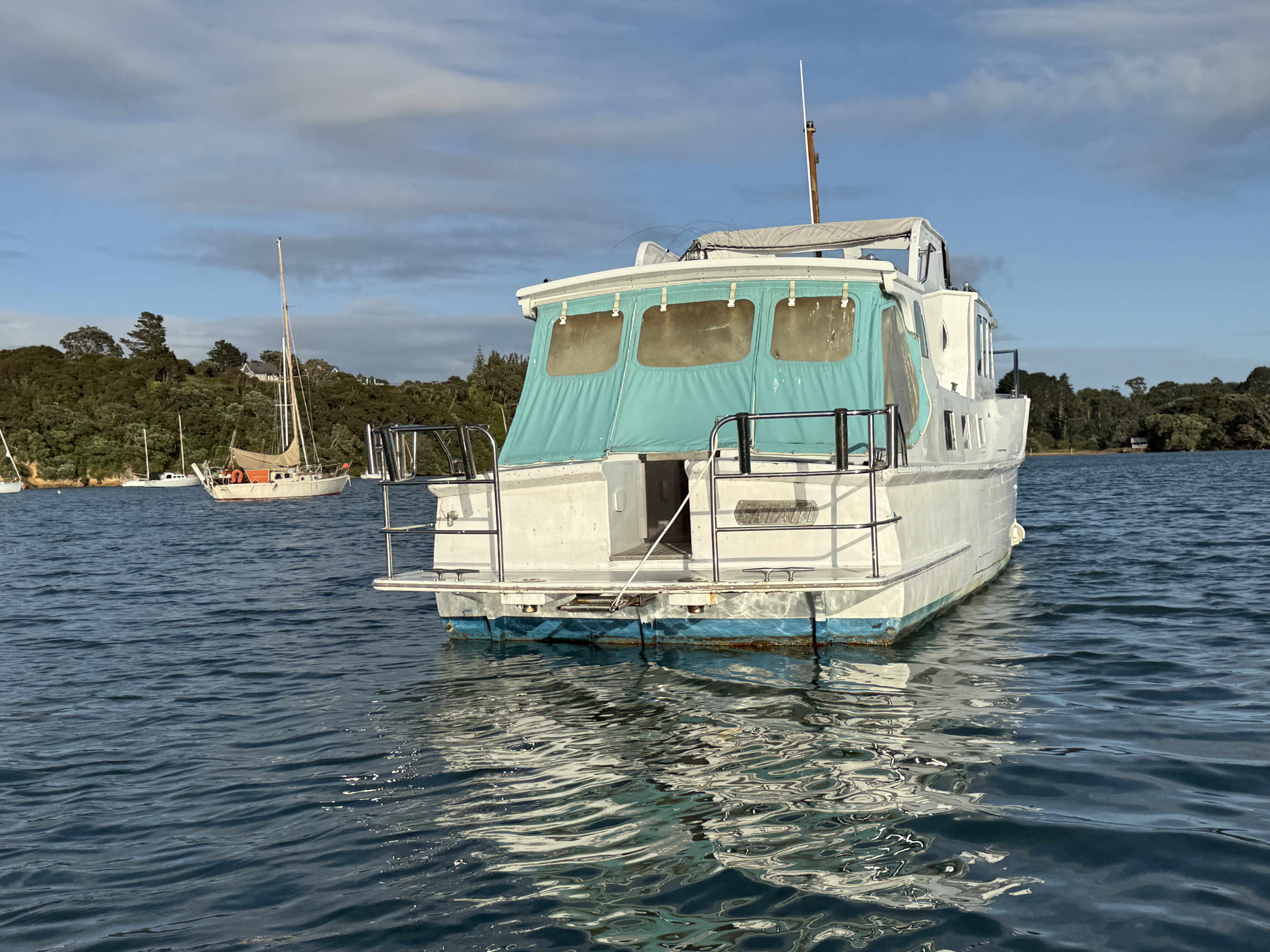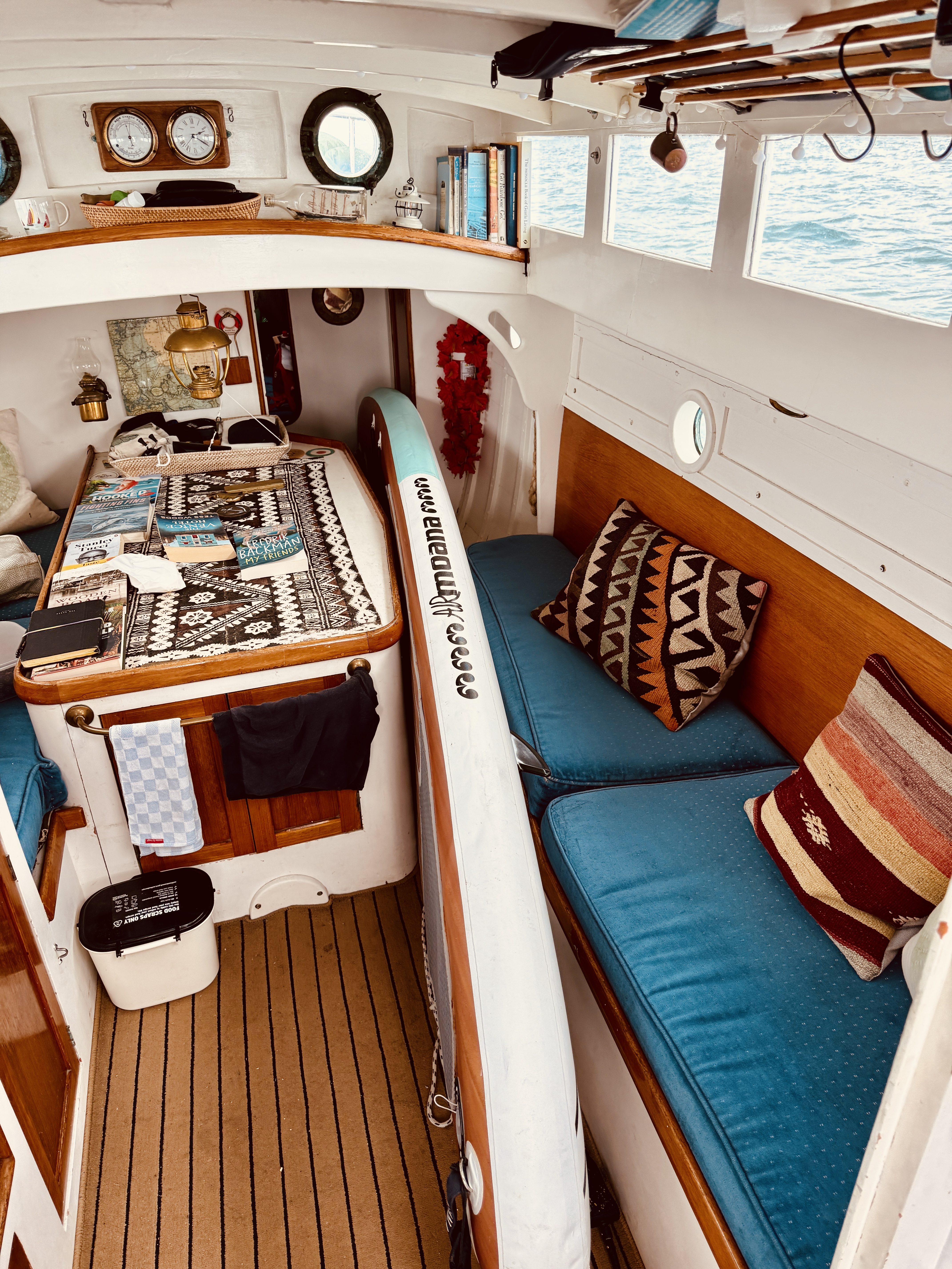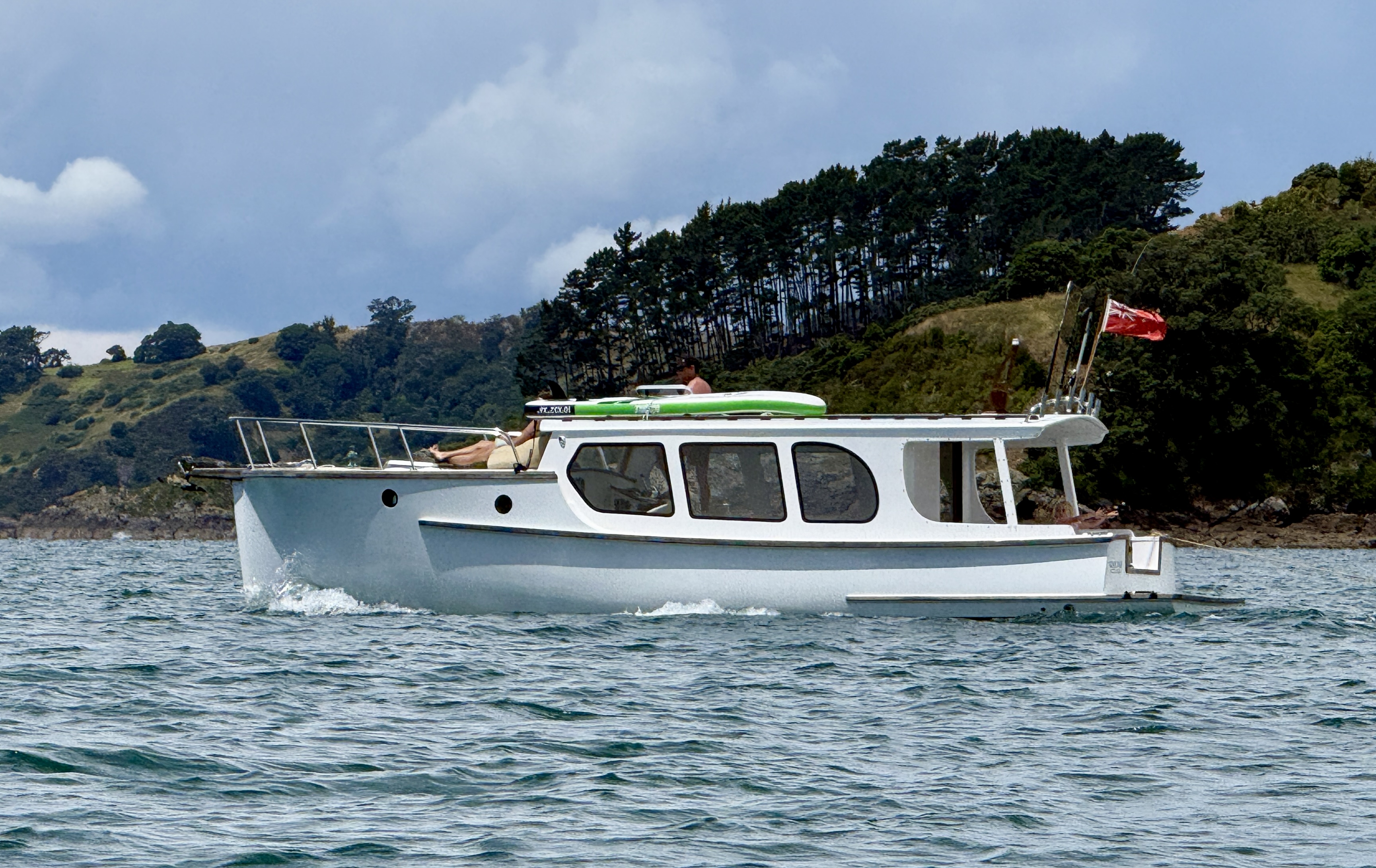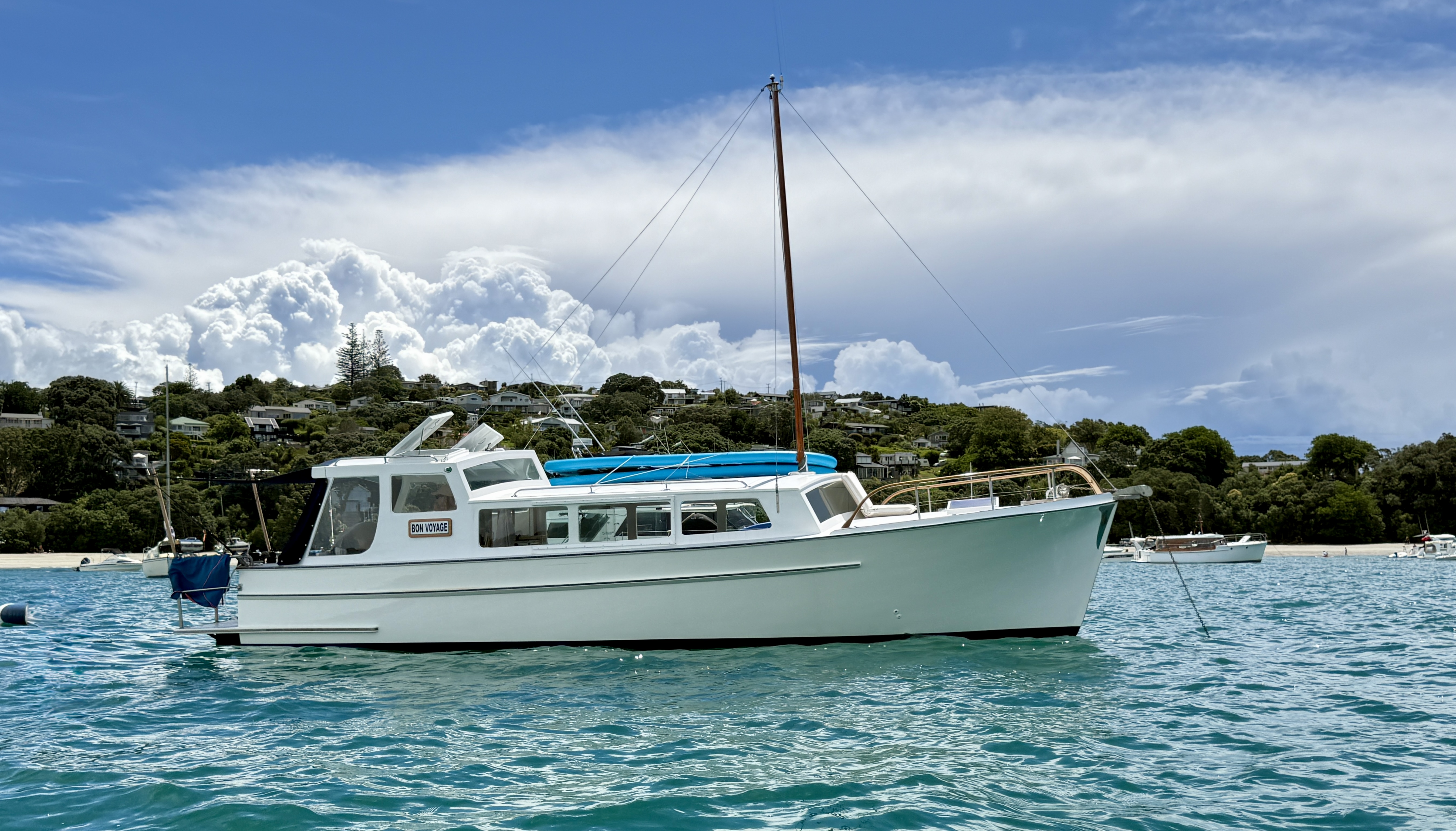 Life on a small launch with a wife, dog and a paddle board can be challenging – normally takes us 2>3 days to get used to living in close proximity, but we have managed this for 18+ years. The bad weather days / nights that include having to take the pooch ashore for a pee in 40+ knots at 6am are quickly replaced with good food, good books and good booze 🙂 One of the positives of evil weather forecasts is low boat numbers, when things improved and we moved to Oneroa for a supply stop, the only other craft in the bay was a yacht and that was ‘washed up’ on the beach.