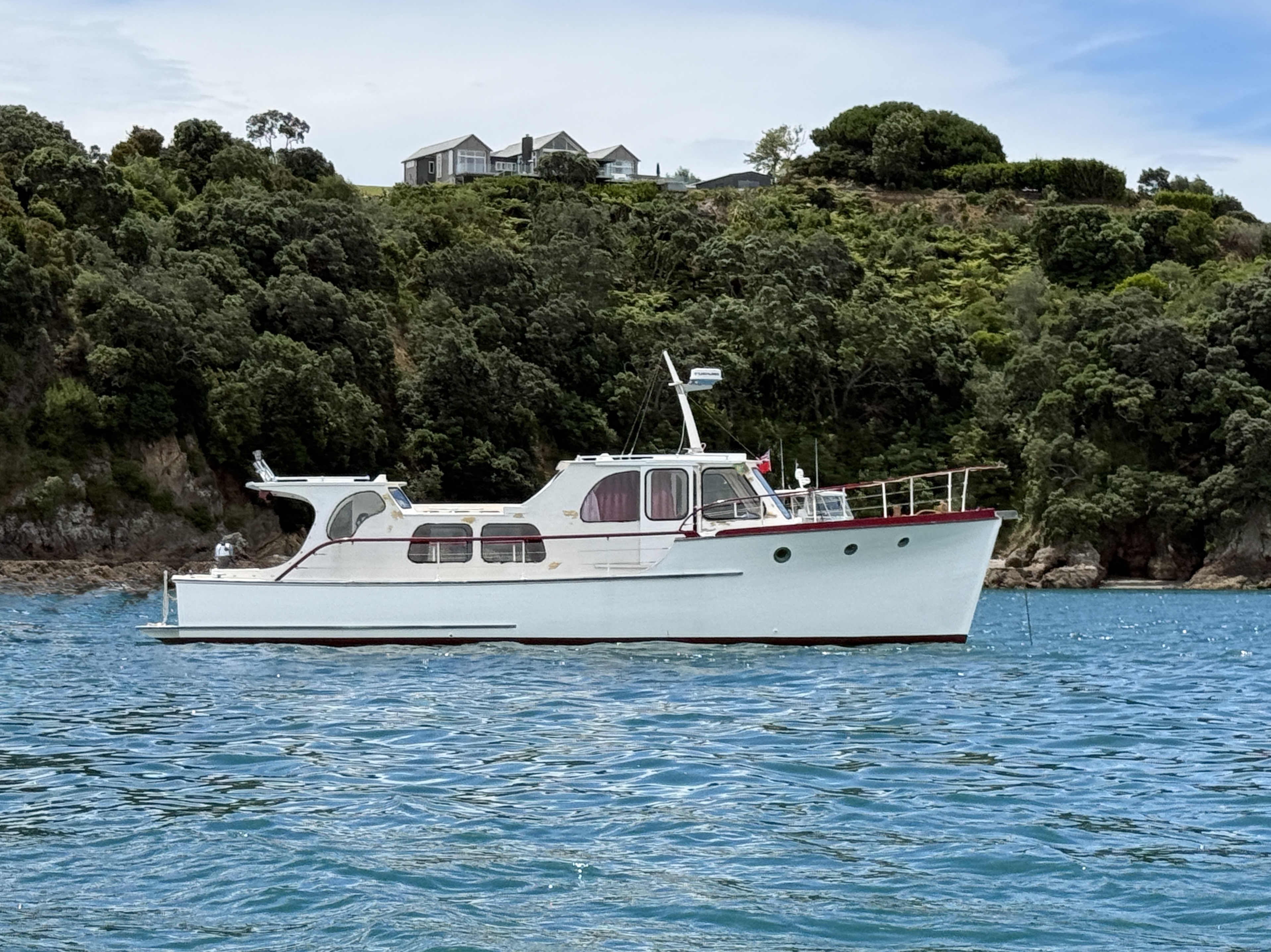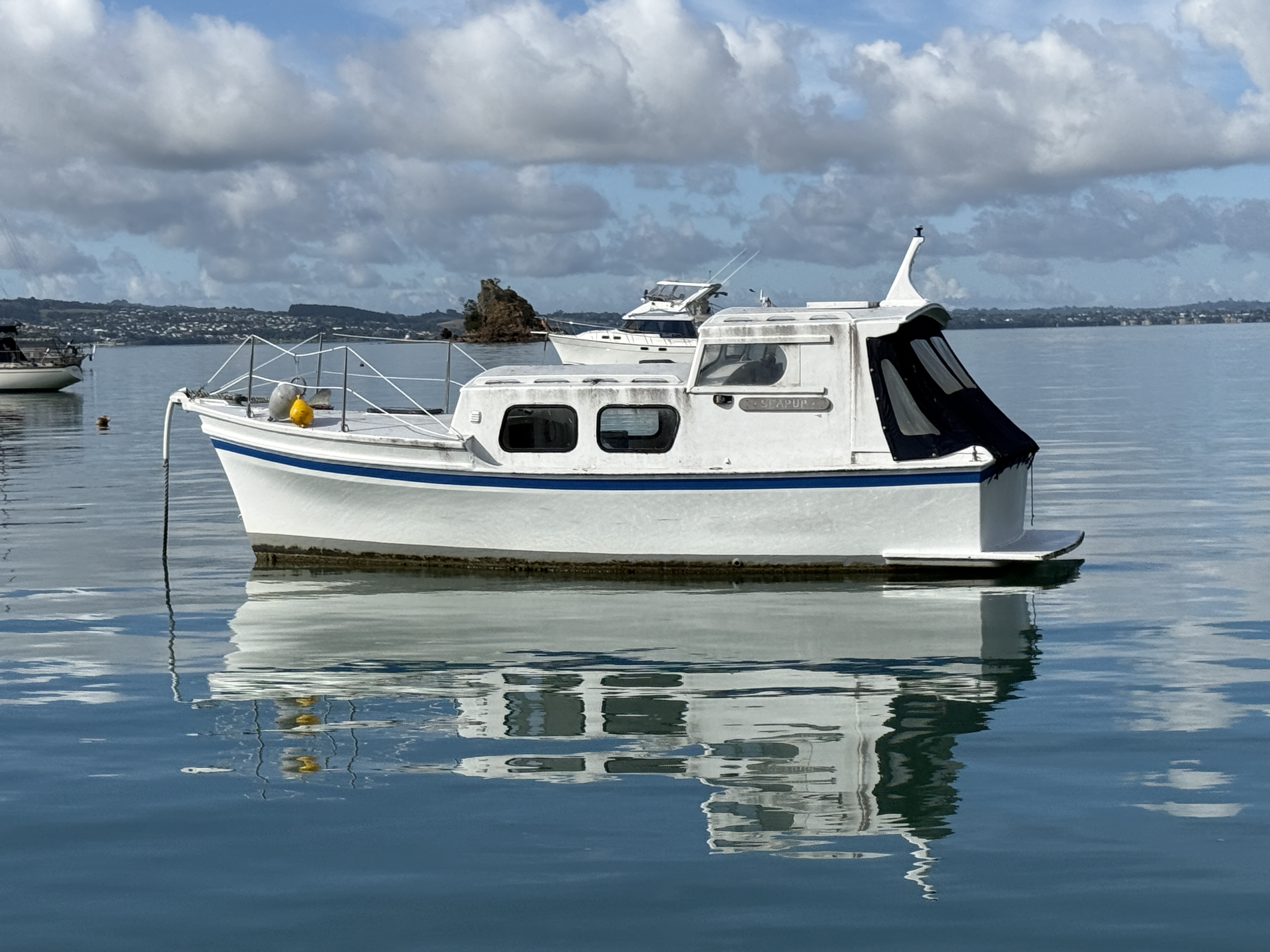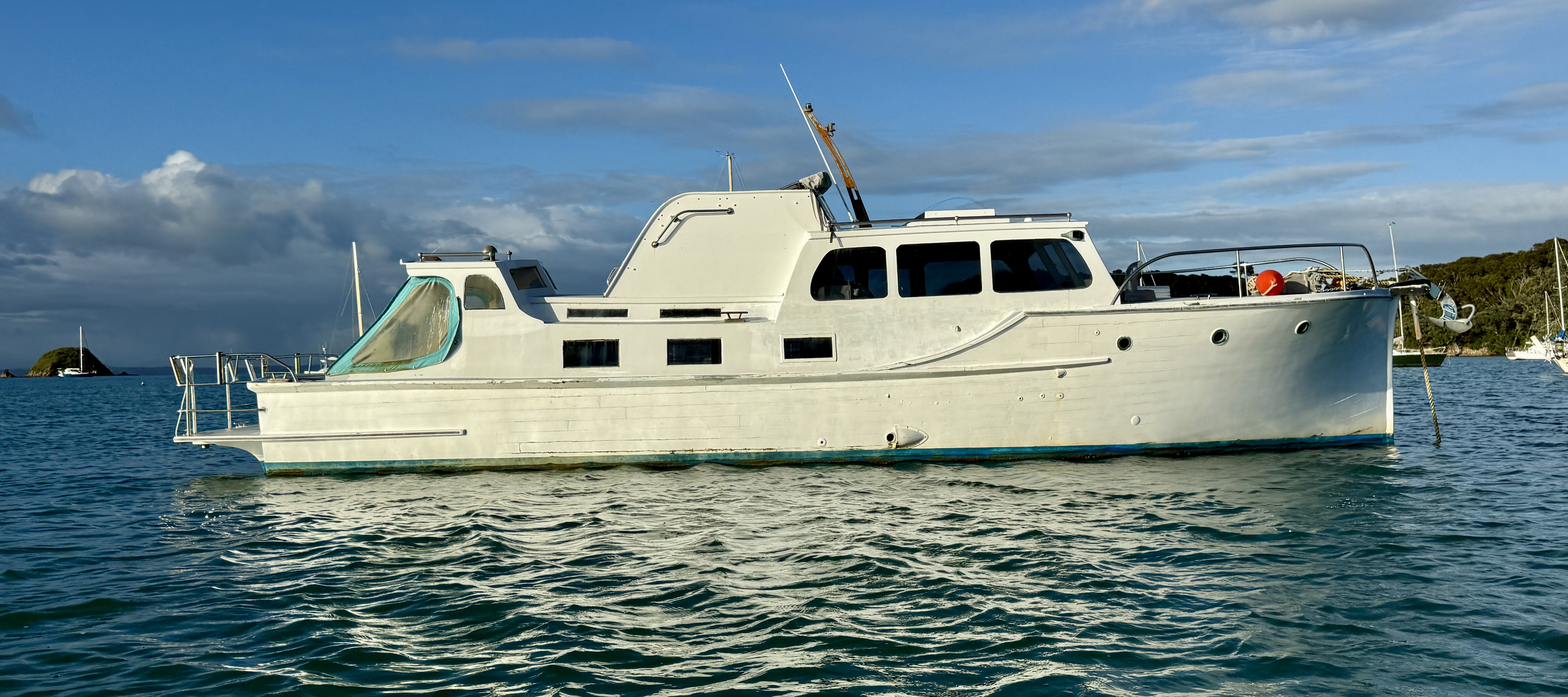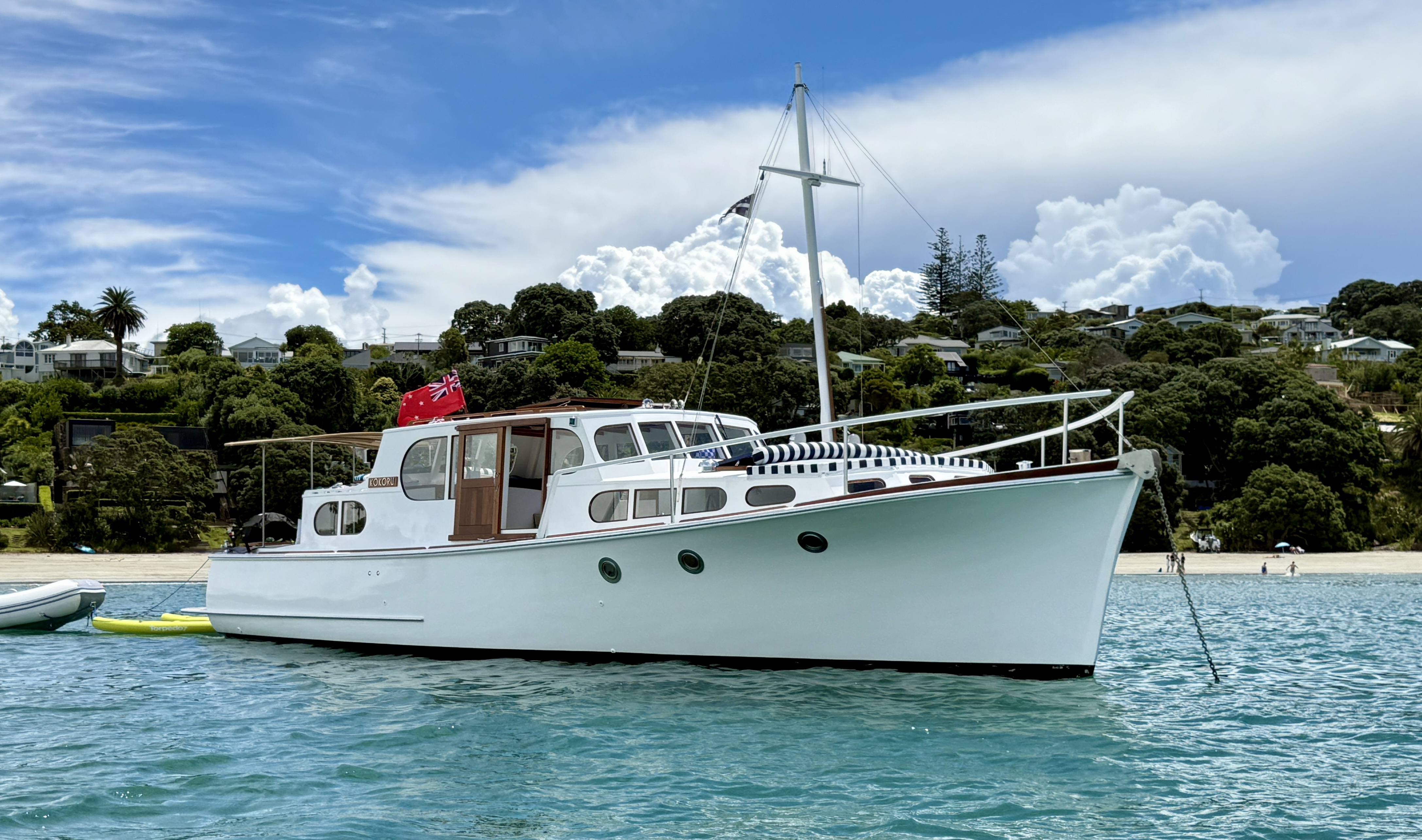 Life on a small launch with a wife, dog and a paddle board can be challenging – normally takes us 2>3 days to get used to living in close proximity, but we have managed this for 18+ years. The bad weather days / nights that include having to take the pooch ashore for a pee in 40+ knots at 6am are quickly replaced with good food, good books and good booze 🙂 One of the positives of evil weather forecasts is low boat numbers, when things improved and we moved to Oneroa for a supply stop, the only other craft in the bay was a yacht and that was ‘washed up’ on the beach.