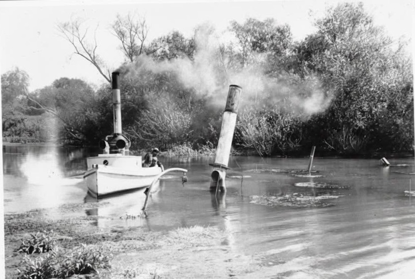 On the left is the steam launch PUKE, standing off the sunken paddle steamer KOPU. The location is the top end of the dead end channel, Puke Wharf, Paeroa (I assume).