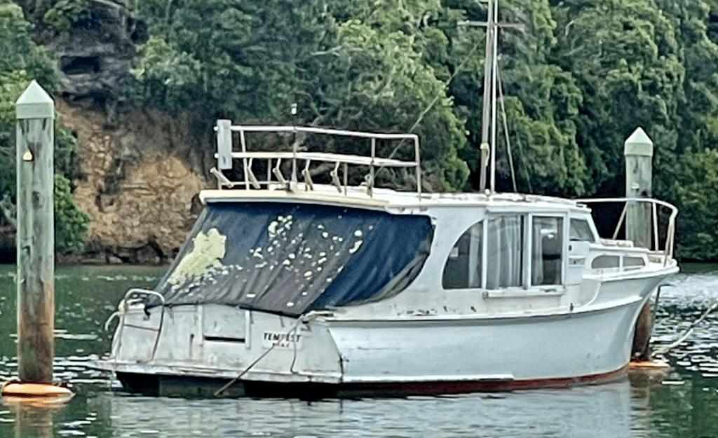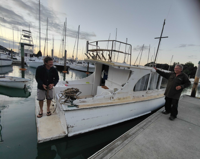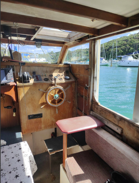 Her recent history is that her owner spent hundreds of hours restoring her and then during Cyclone Gabrielle she was struck and sunk on her mooring by a much larger floating foot path (concrete boat). Her owner also experienced a medical incident and the rebuild is beyond his physical resources and he has made the hard call to find a new custodian.