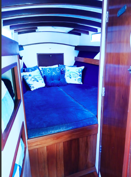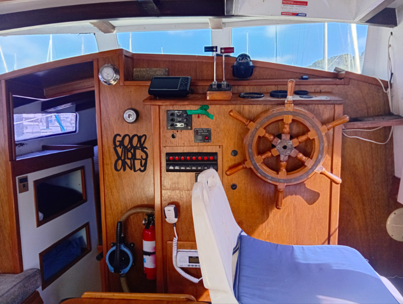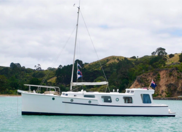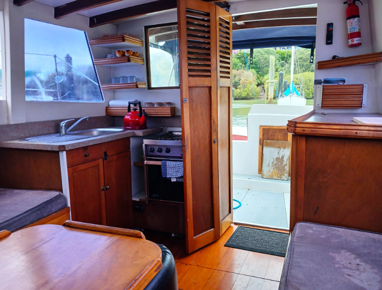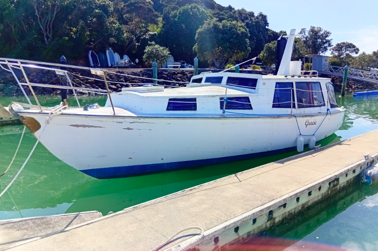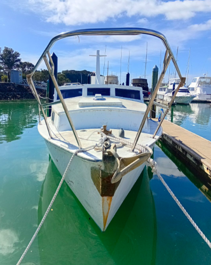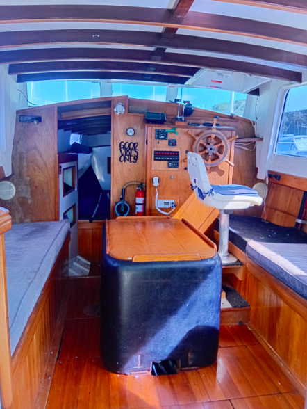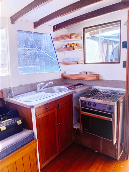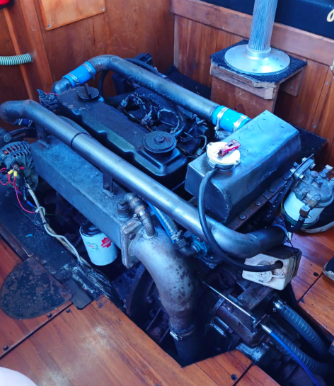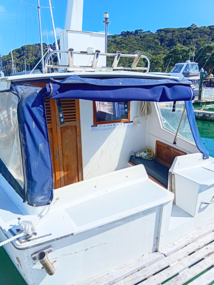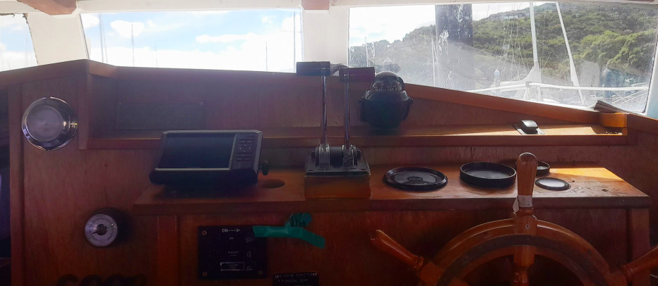 All the above aside she is constructed from kauri carvel planking, has a beam of 10’9’ and draws 4’3”, built c.1970’s. Her forward motion is from a Nissan 2.7L diesel engine giving her a top speed of 8 knots.