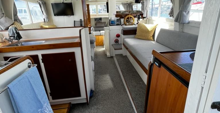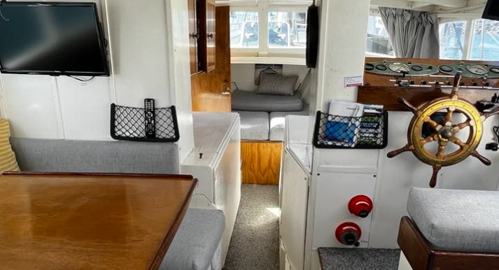 A serious lack of exterior photos, hard to get a good look at the boat, bow on isn’t her best angle. Quite a smart woody down below, juries out on the second story addition……..