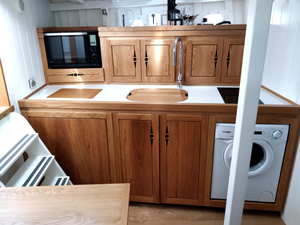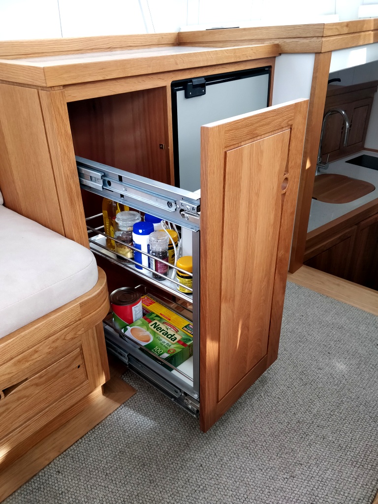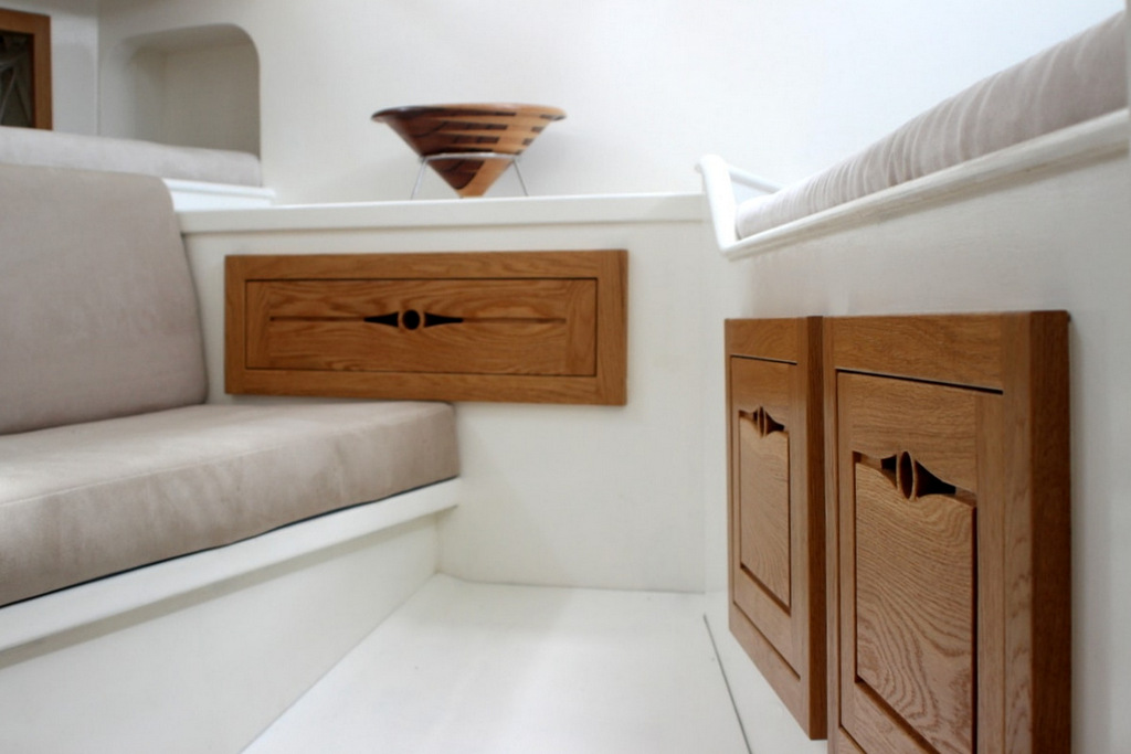 The team a CMC Design completed all the white oak cabinetry including full galley refit, trims and latches, saloon table, console instrument panels and other interior elements.