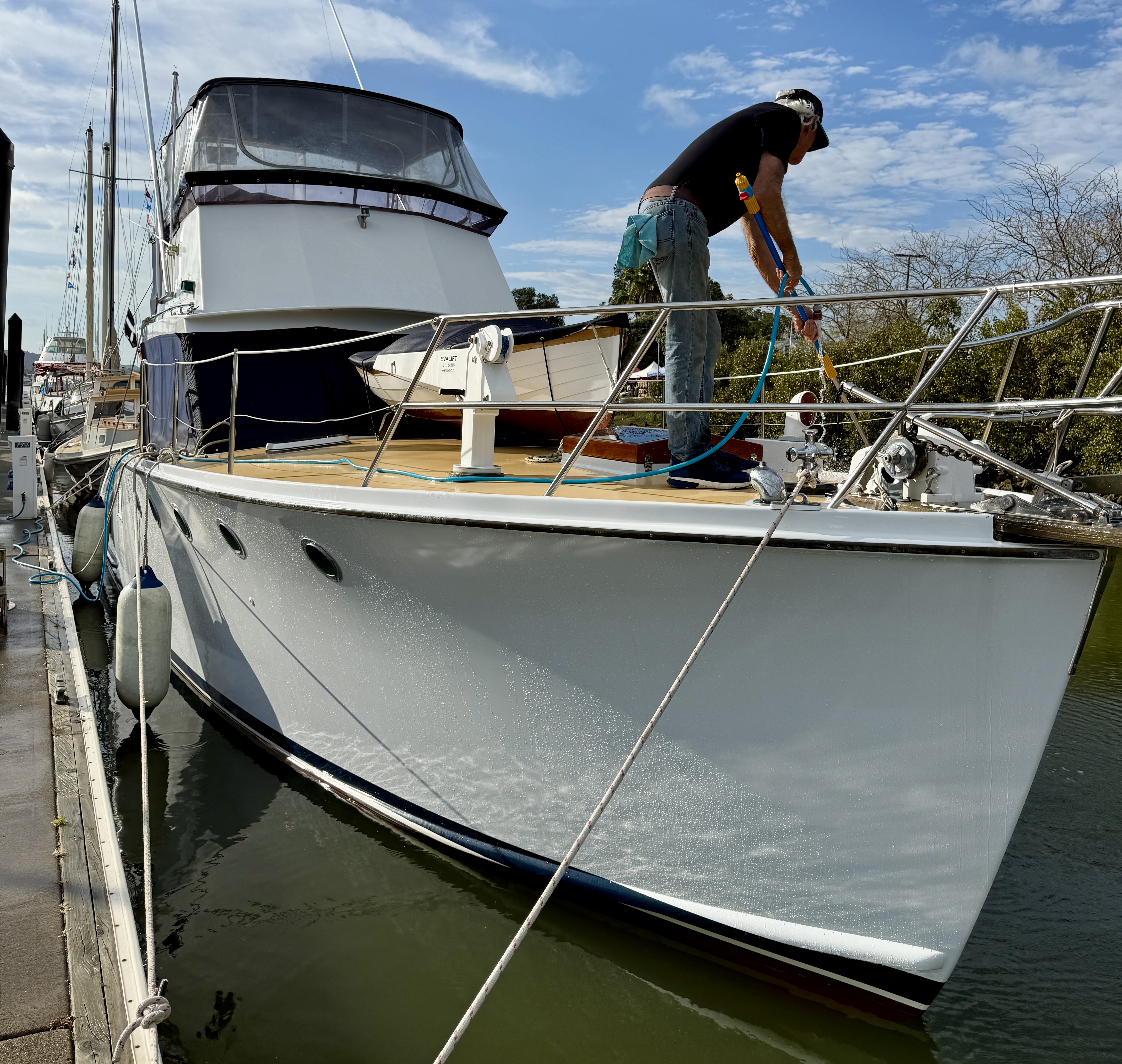 Monterey is currently hauled out at the Slipway Milford for a Jason Prew Paint Job (JPPJ) and removing the decades of built up antifoam from her bottom. While out some of the systems and thru-hulls will be upgraded.