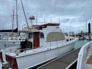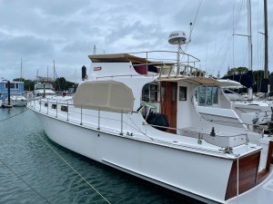 In 1988 she underwent a refit with new windows, stainless rails, re-glassing of cabin tops. Then in 1995 replaced decks with ply, & glassed them. She was extended at the stern in 1998, by .9 of a metre to 42 feet. In 2004 Morrie added 3′ to her stern & a 3′ duck board. 2008 saw her get a major out of boat, engine overhaul.