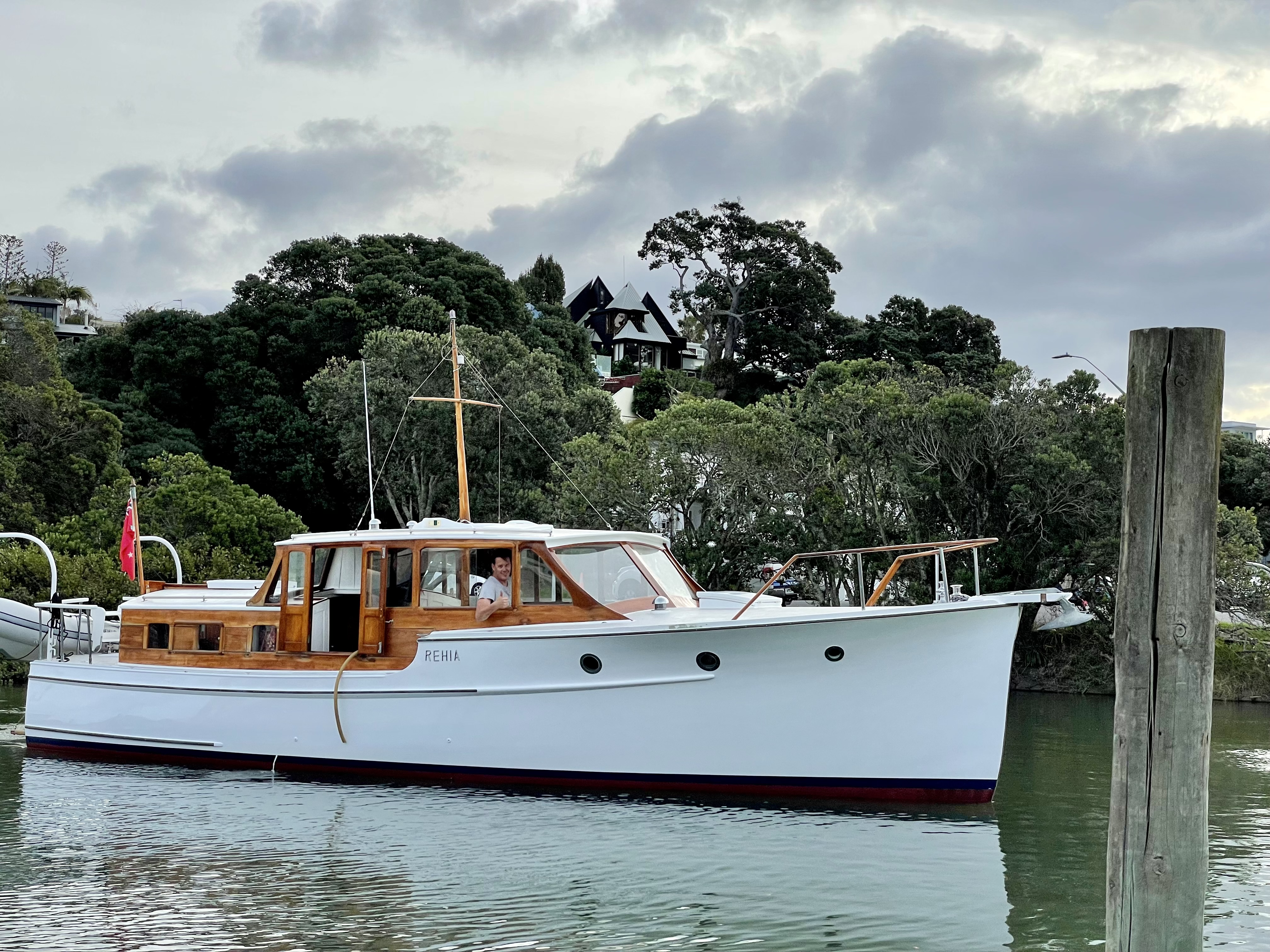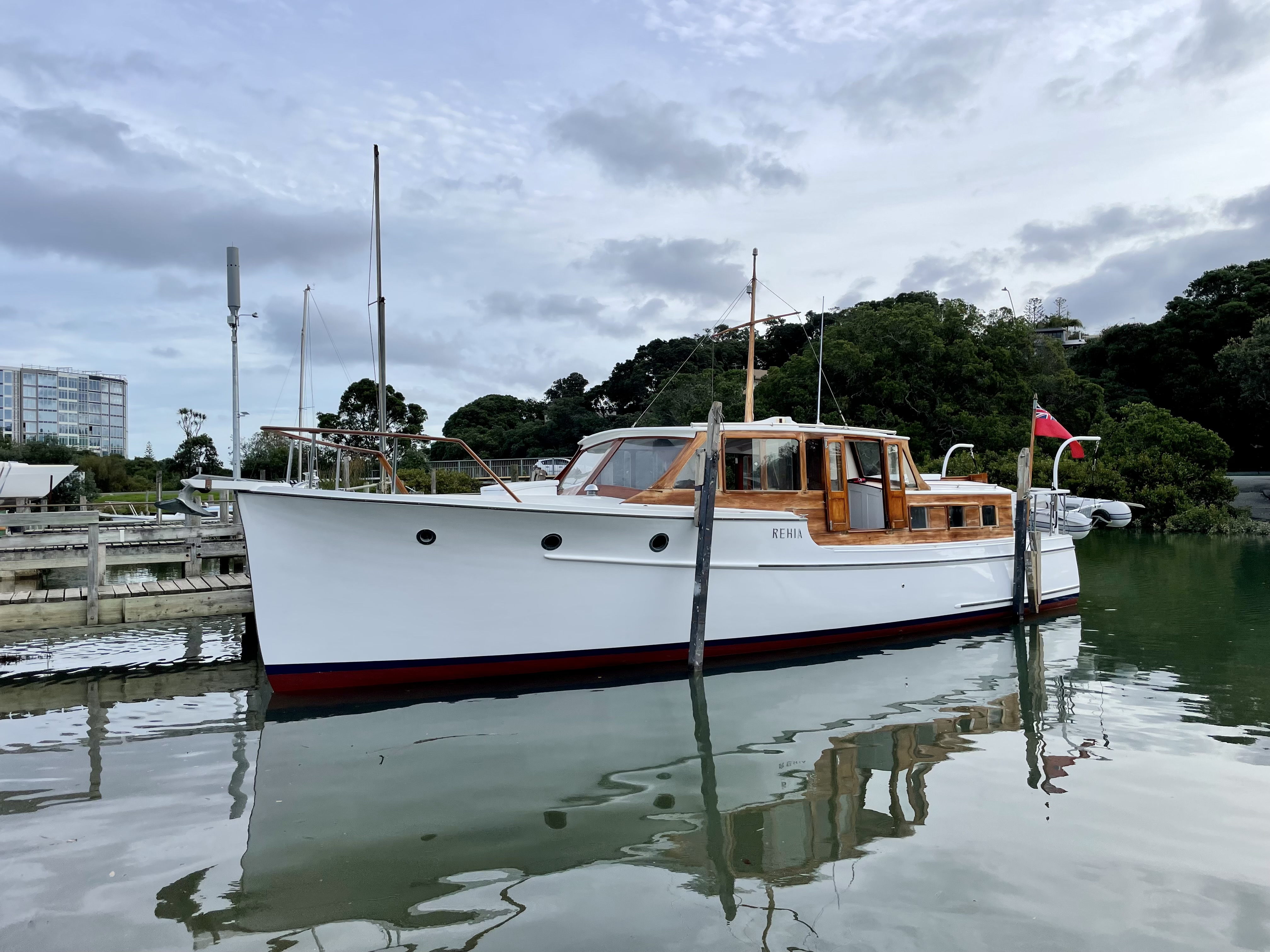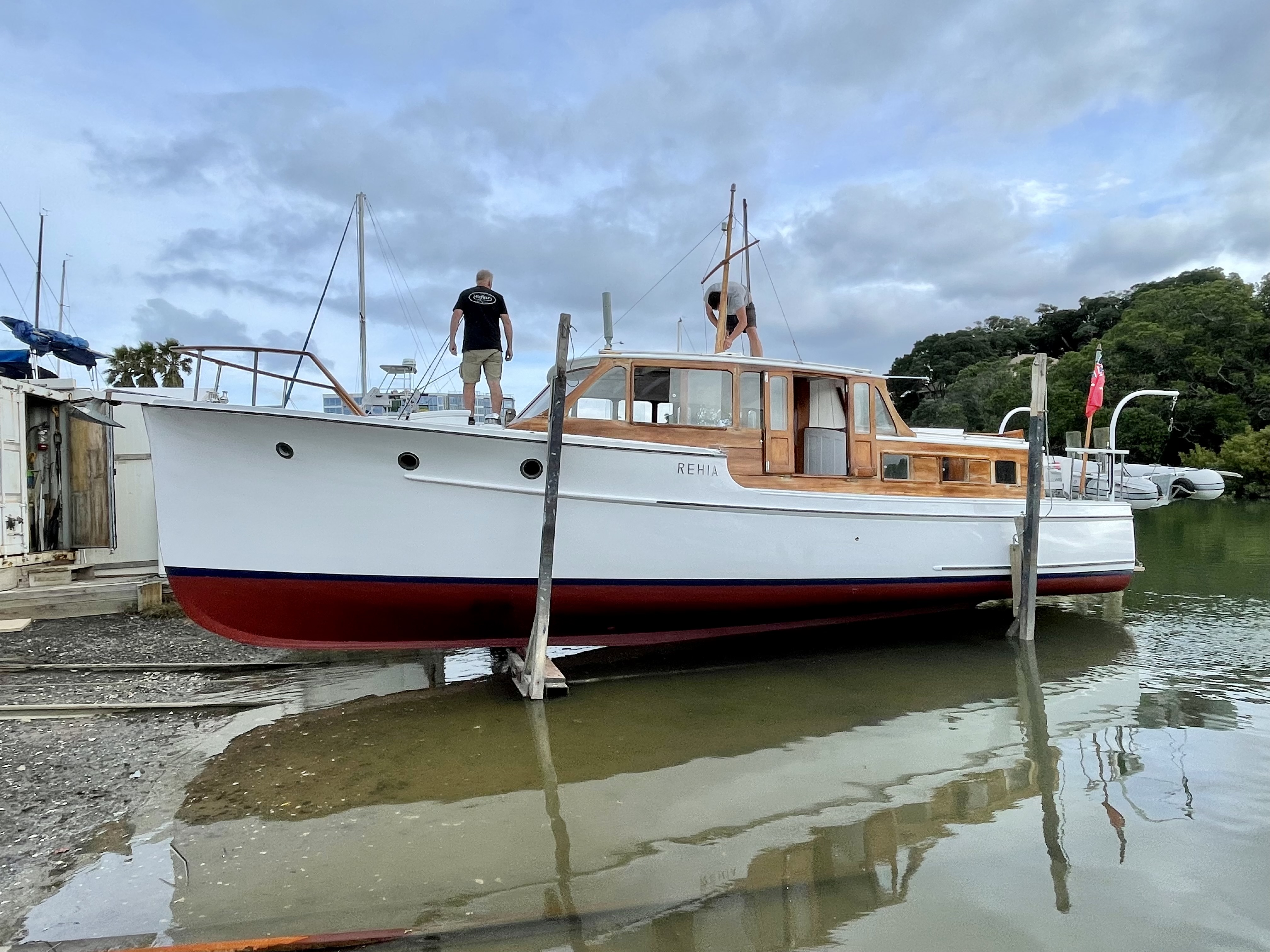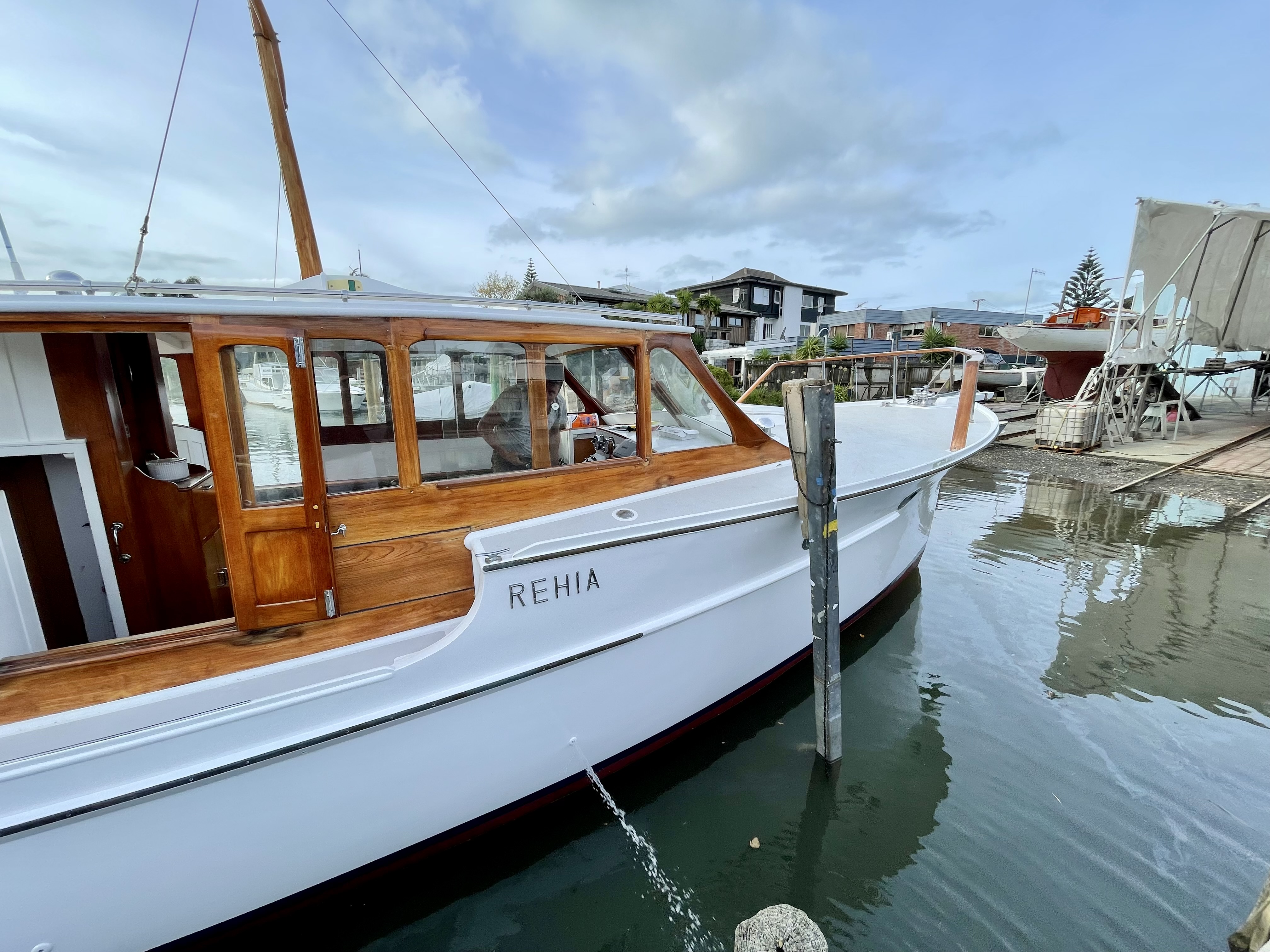 Back in Dec 2021 we advised that the 1939 Colin Wild launch – Rehia had a new owner and that she was hauled out at the Slipway Milford for some pressing systems work before her summer cruise. Link here to that story. https://waitematawoodys.com/2021/12/18/rehia-finds-a-new-home/