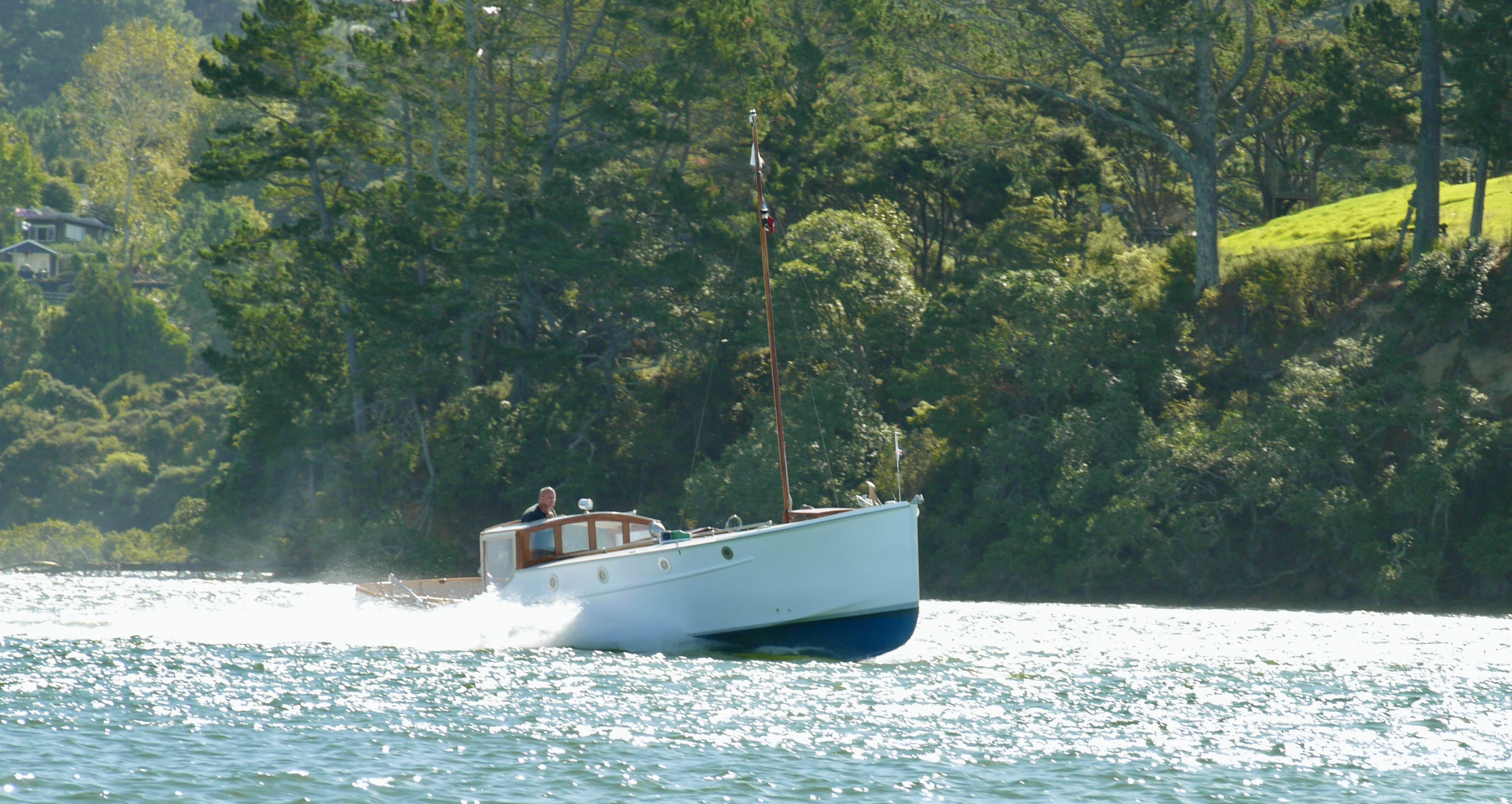 At the recent CYA round Rangitoto race > cake day > BBQ one of the participating launches was the c.1953 Bill Waters built 34′ bridge decker – Gay Dawn. Gay Dawn has made several appearances on WW, links below, but today we get to also see her underway. Gay Dawn is built like a brick outhouse – carvel planked kauri, hardwood ribs and a pohutukawa stem.