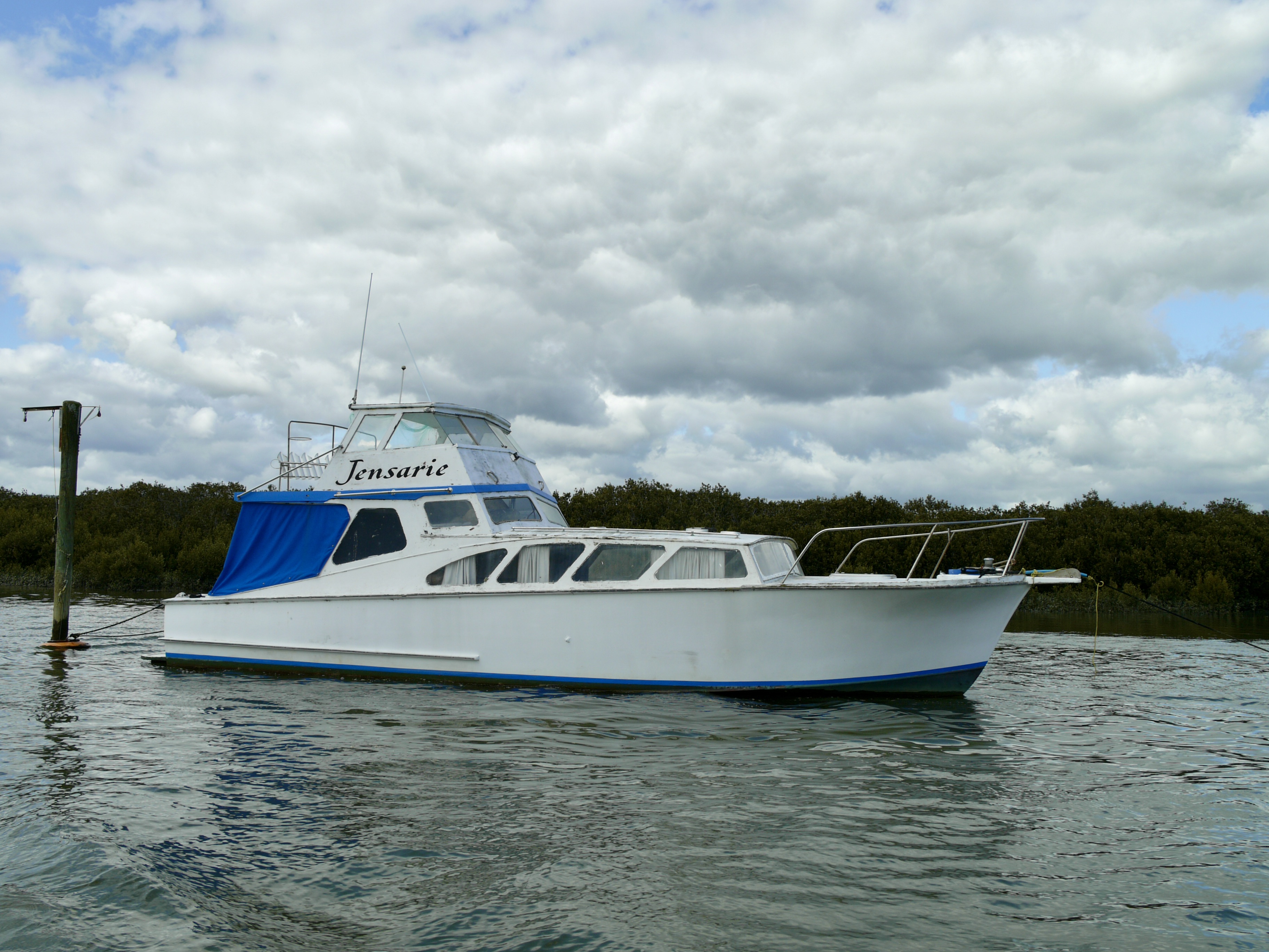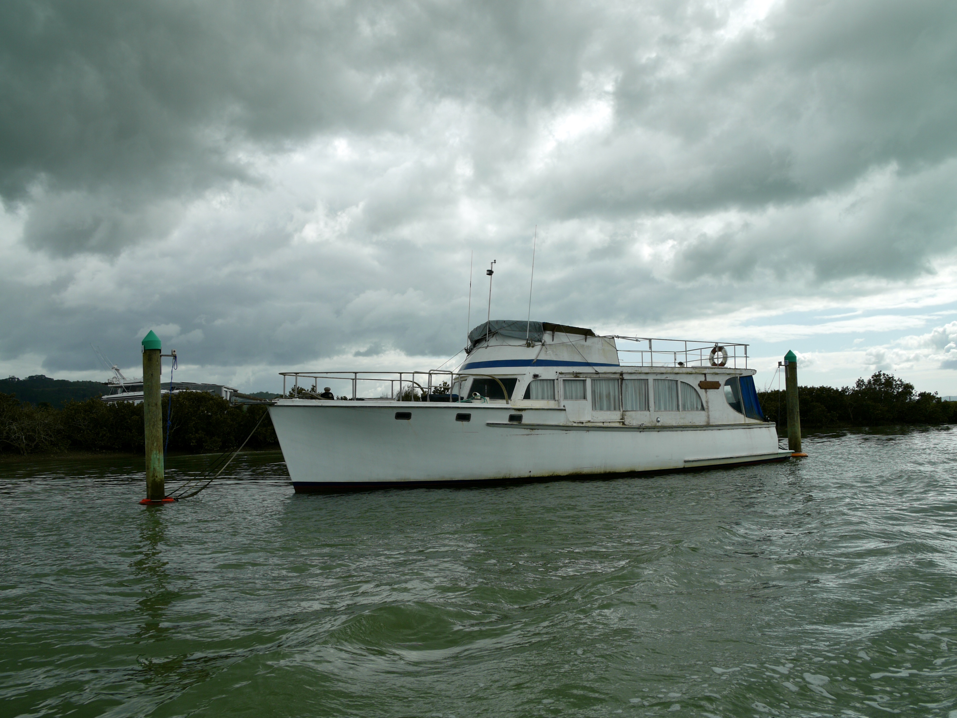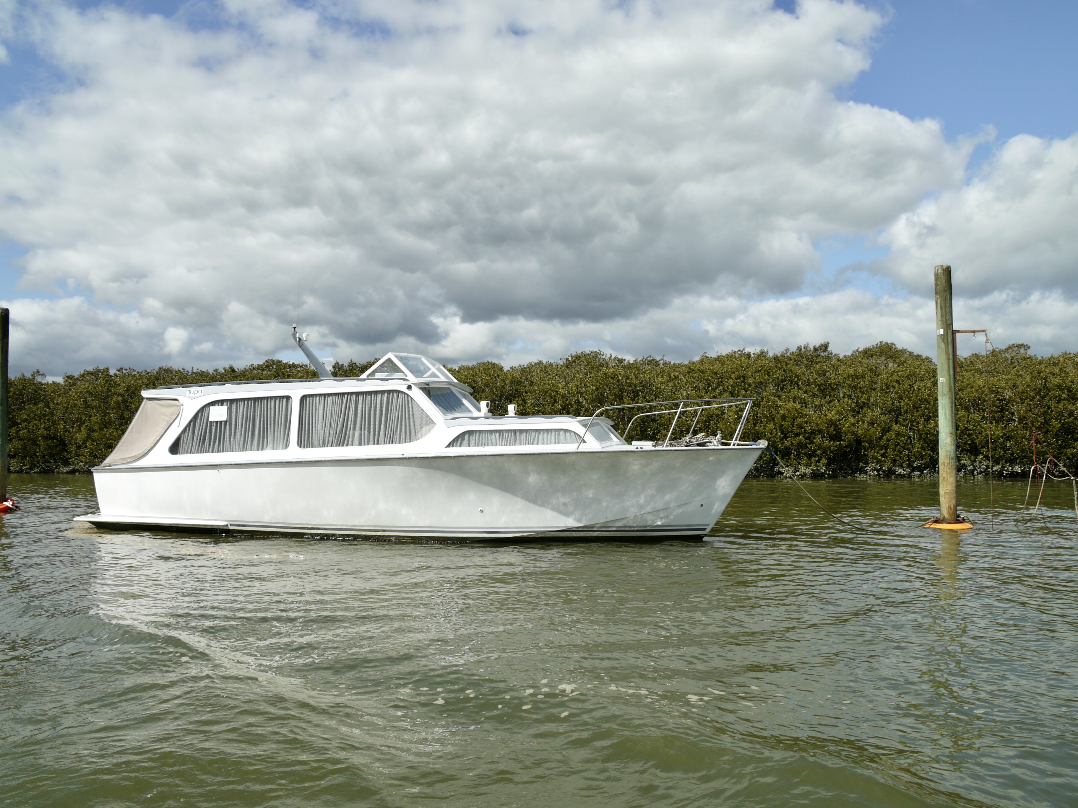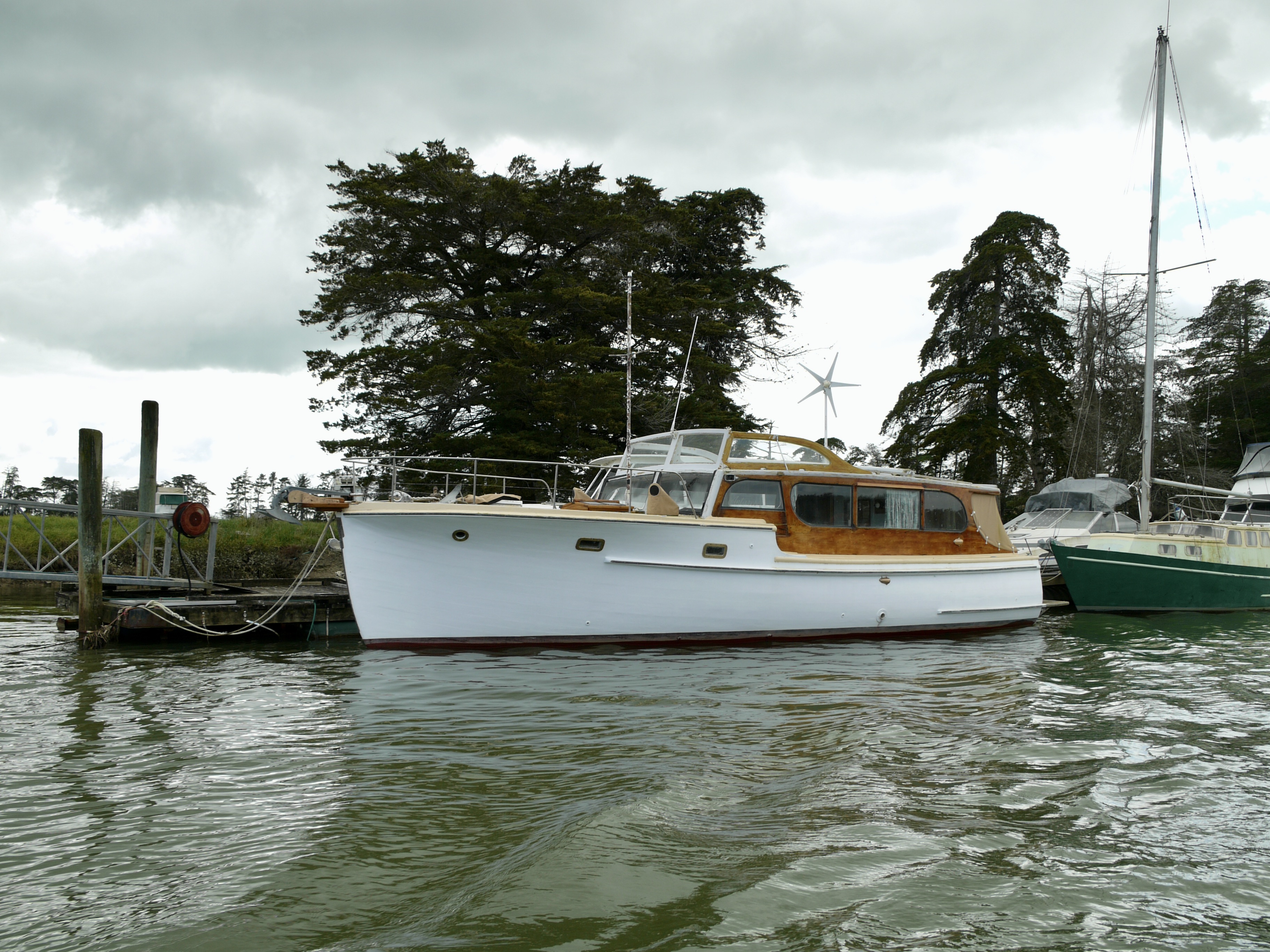 Menai was powered by a flathead Ford V8 with a marine conversion by OSCA, rated at 100hp. Whether that was as a car motor or marine I don’t know. It had a 2 to 1 reduction box and we cruised at 1750rpm on the rev counter. Dad went through about three propellers and numerous re-pitchings and re-cuppings and finally achieved claimed figures of cruising speed of about 6.5 knots and petrol consumption of 1 3/4 gallons per hour. Pushing it up to 7 or 7.5 knots resulted in it squatting at the stern (“digging a big hole in the water” Dad used to say) and consumption soaring to about 4 gallons/hour.