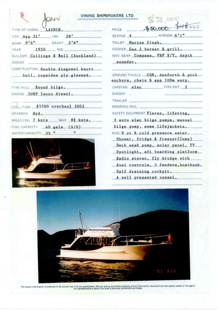 Dad and Arnold were at the time (and for a number of years thereafter) flag officers of the Auckland Motor Yacht Club and were able to organise the various transfers to suit their calendars and cash flow. Dad sold the “Taufale” a 28 footer launch which he had bought in 1944 (I think. May have been 1945.) I was only about 5 at the time so my memory of such details is non-existent.