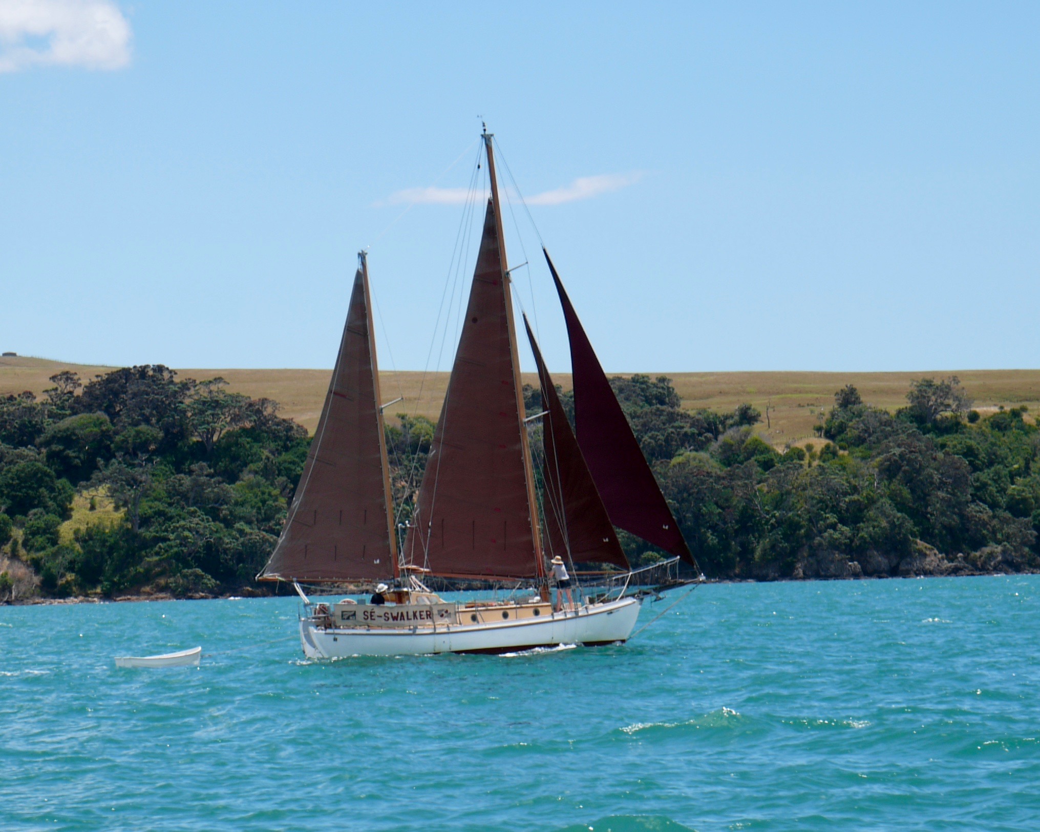 this Se Swalker, launch in Purau Bay, Lyttelton in 1988. Carvel, Kauri built by Geard Kingma. She’s been to the Auckland Islands and cruise Fiordland a number of times. She’s 38′ LOD, 44′ LOA. It’s a William Atkin Ingrid design. Thanks for the pic!! Nick Atkinson.