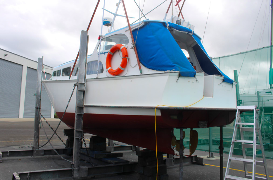 Photos below of Juanita leaving Greg Lees (Sandspit) boat shed after a serious spot of TLC. Link below her time in Greg’s shed.