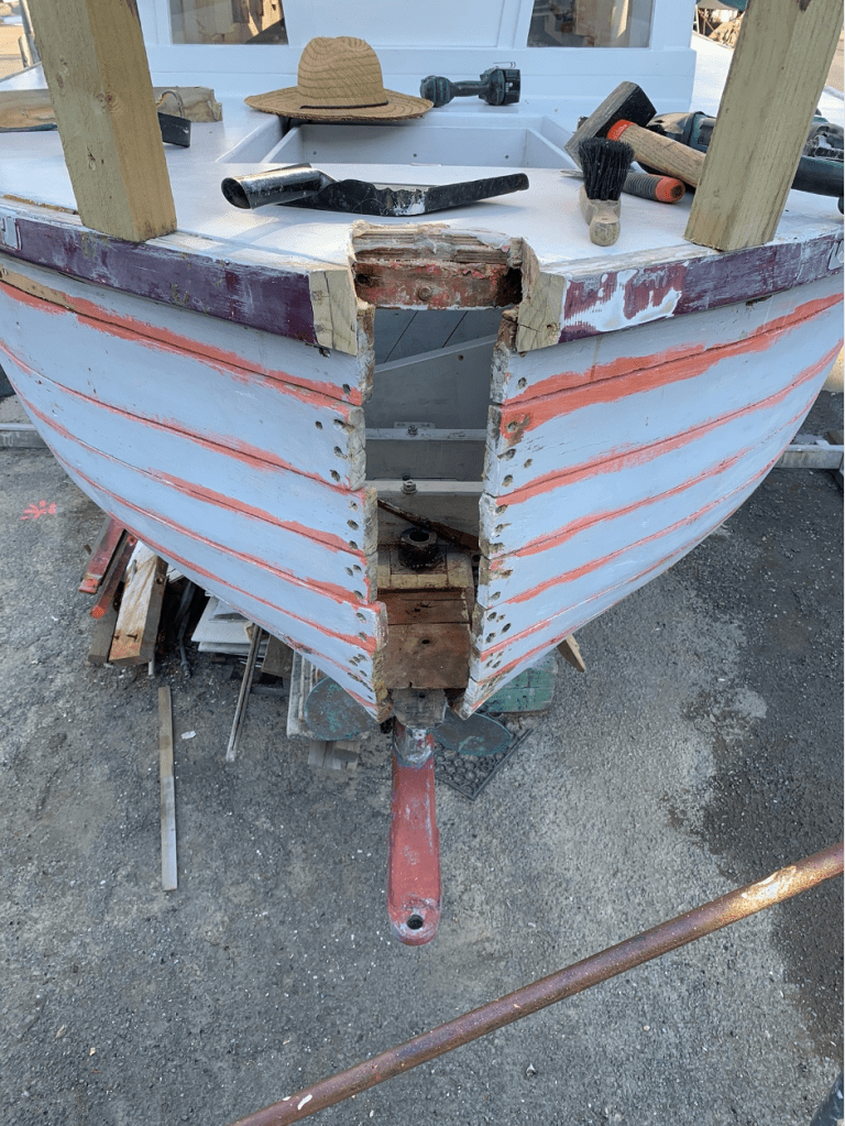 The inner and outer where then bolted with bronze rod to new horizontal knees inside the stern and at the top of the bulwarks. Whew.