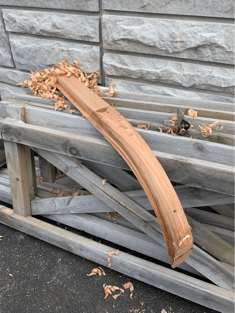 “Now I just had to make a new one and put it all back together. Hummm. My fellow boat owners all came to check out progress and I got the distinct impression that they thought I had killed her. If I am honest I was wondering this myself…. I was going to need lots more kauri. Fortunately Solomon came up with the goods, a couple of large beams that had once been part of a bridge (thanks Mate). One of these was sawn up to make a new inner. I sourced some beautiful bronze screws and fitted the inner back into the boat. I was most relived to see that the stern was now back in shape. All the seams had closed up and she had a nice round bum again. I clearly had done something right. Next up was to make up the new outer. Grown hardwood wasn’t an option so I decided that I was going to laminate one. I made a former and laminated up the new outer.