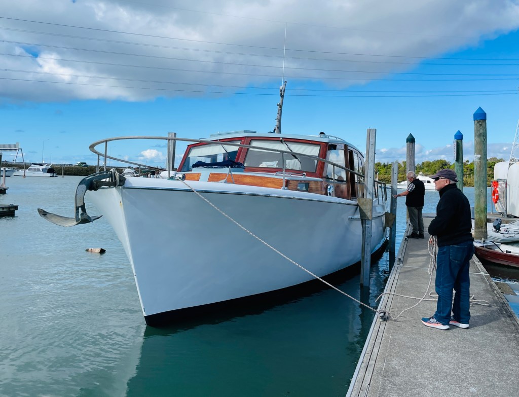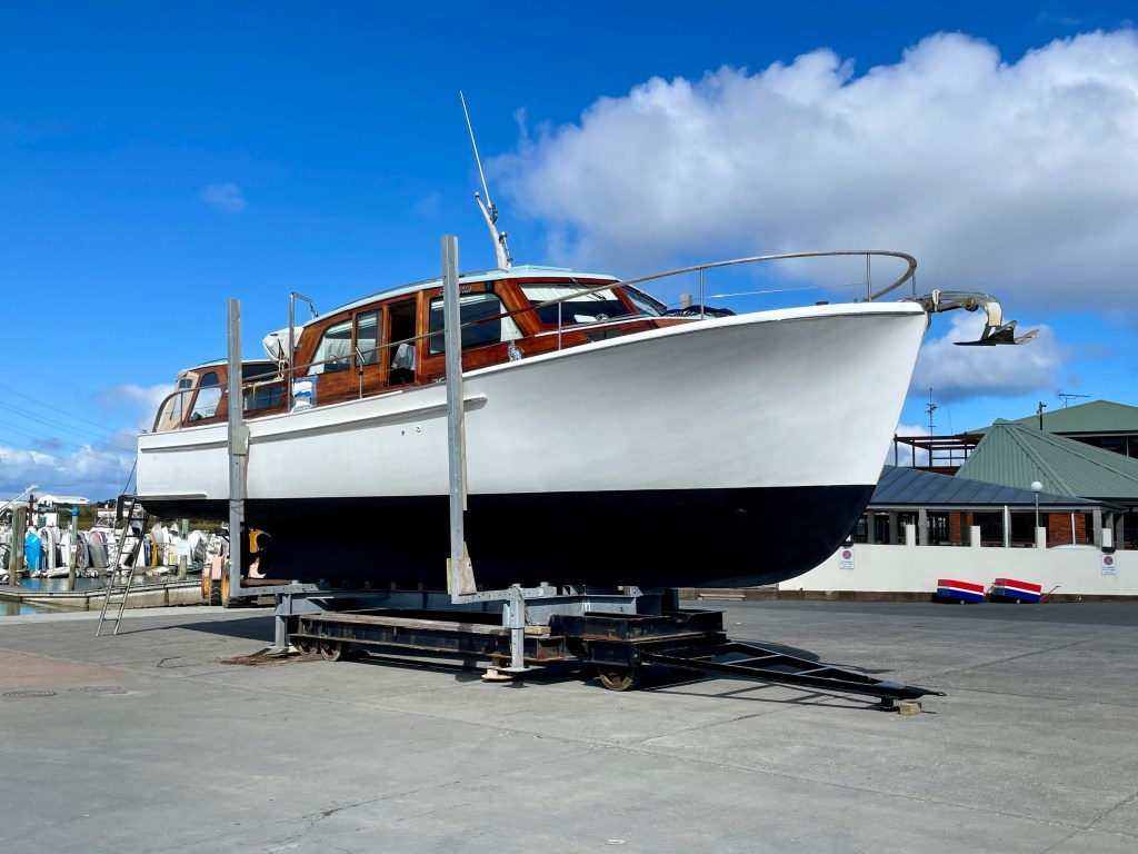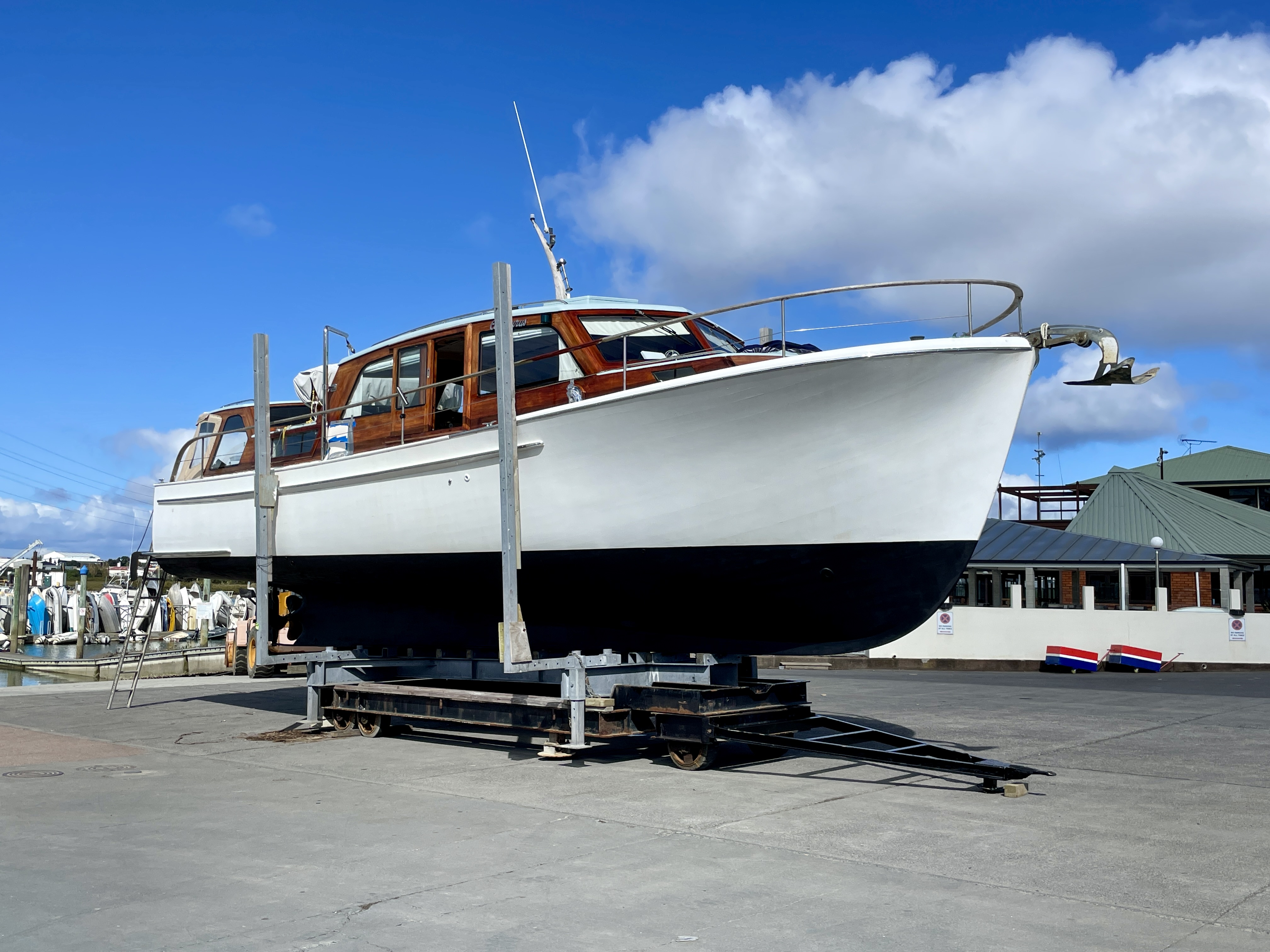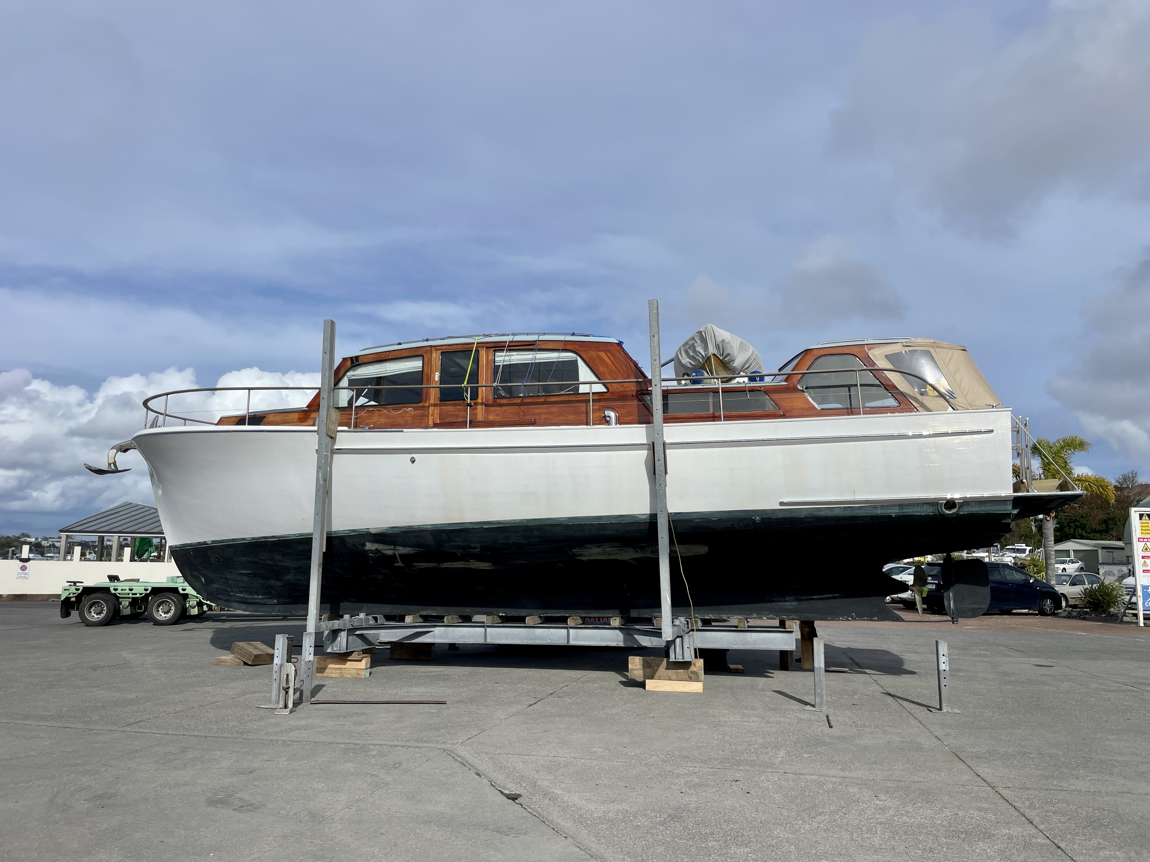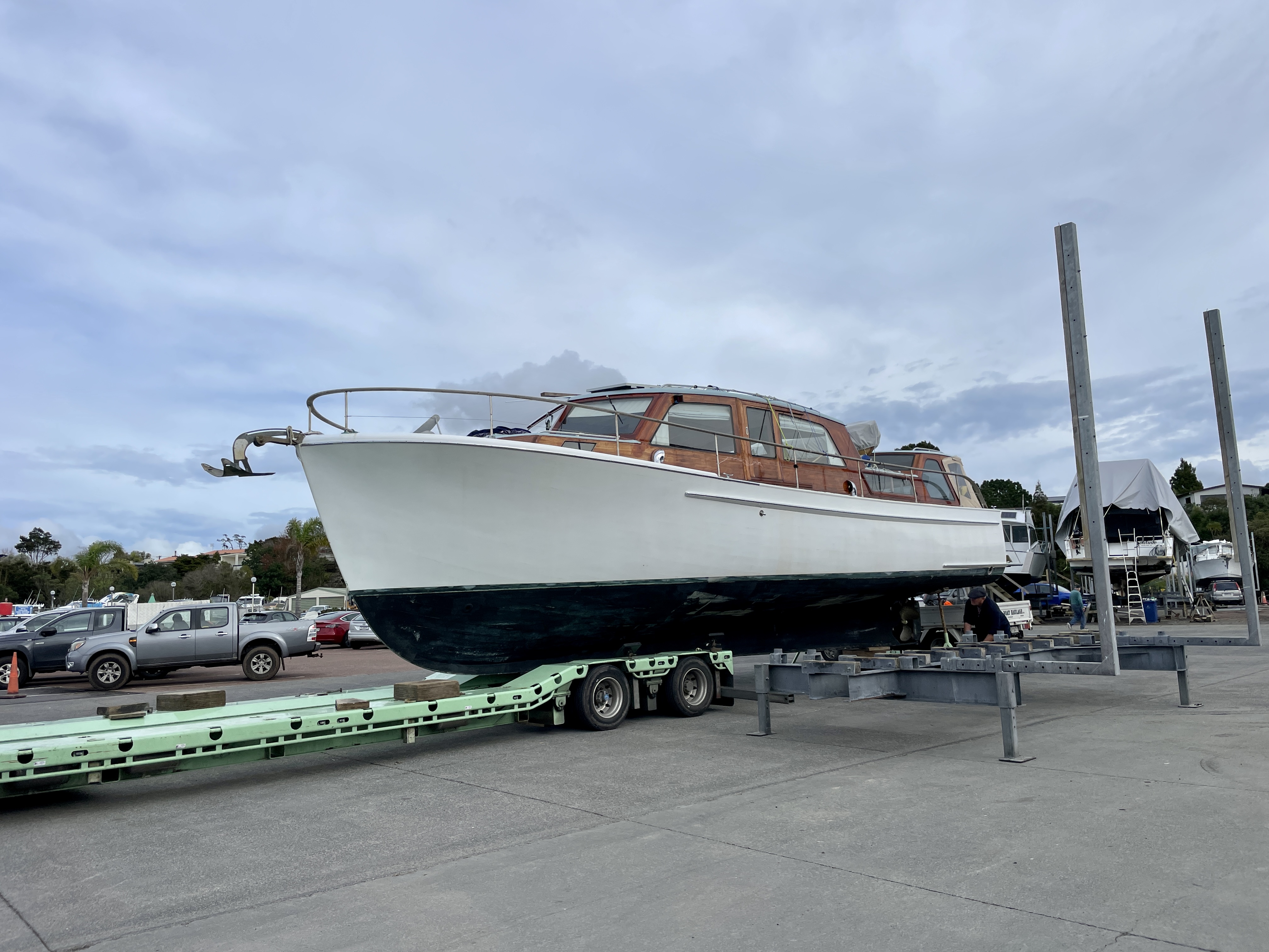 Around The Yards – Centaurus Angus Roger’s 42’ 1967 1968 Bailey & Sons built launch – Centaurus has been tucked away over winter in a shed up the Tamaki River getting a serious serving of TLC to her hull. I understand that there was an accumulation of old anti-fouling removed, back to bare wood, and the process started again. Looks very impressive and back in the water later this week, Just in time for the Woody Riverhead Tavern lunch cruise on the 20th June.
