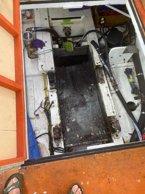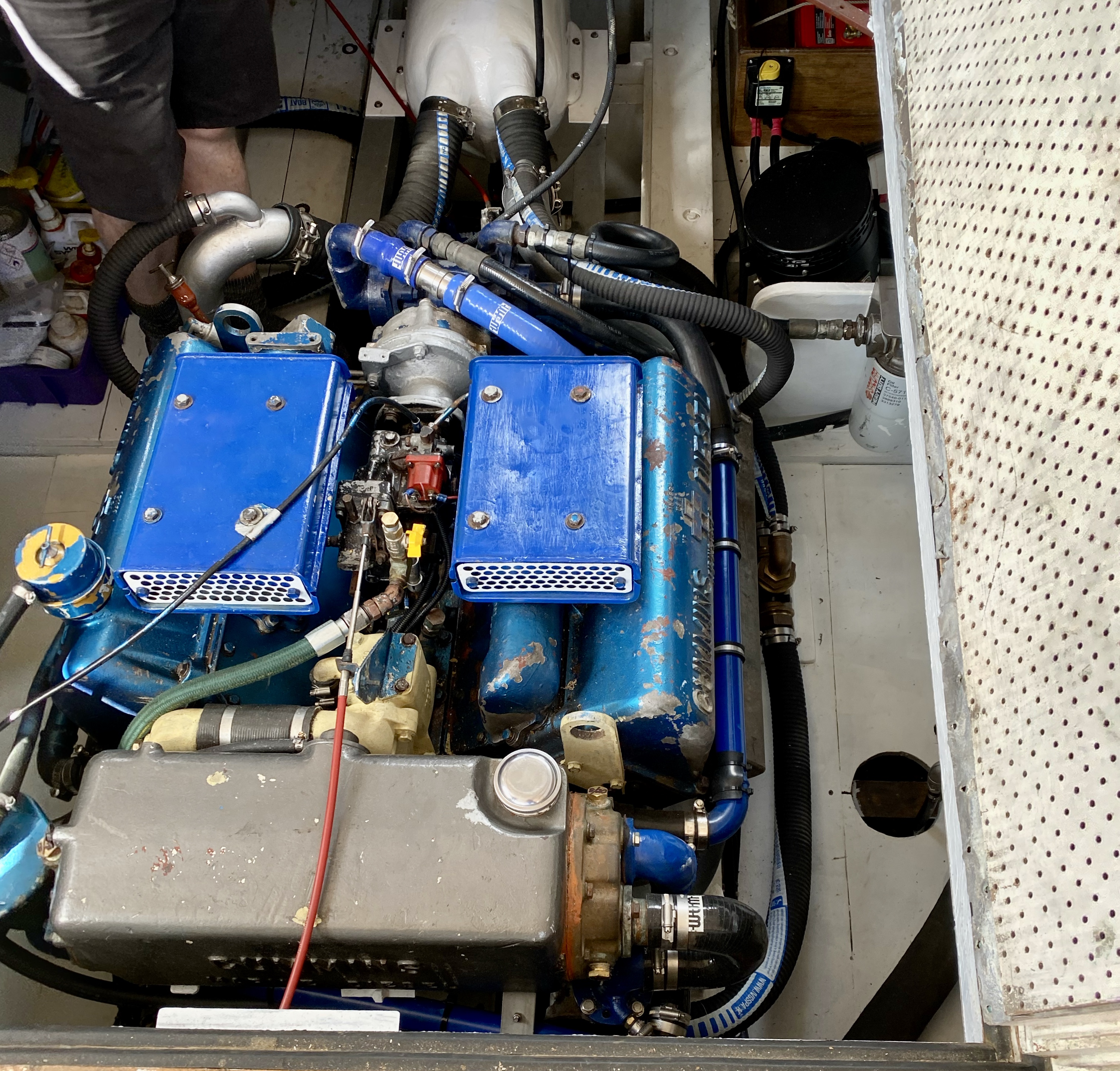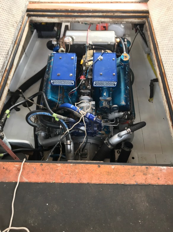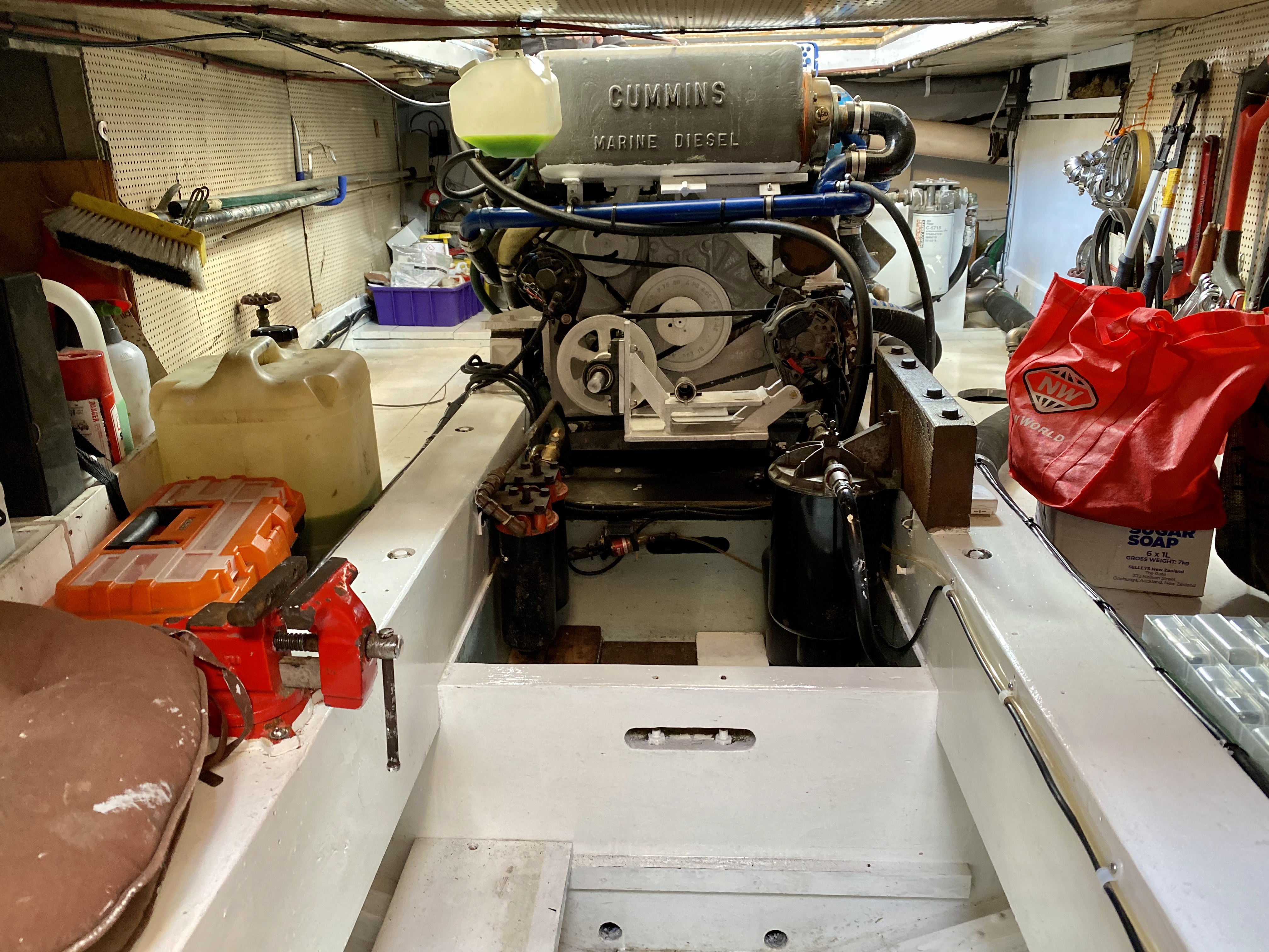 GOOD – Centaurus is off to a new temporary home for the final act of her refit – the installation of a John Deere 6.8L 175 hp diesel. The JD replaces her original engine, which was a monster – a Cumins V6 215hp – photo below. The Cumins had to partially dismantled to get her out.