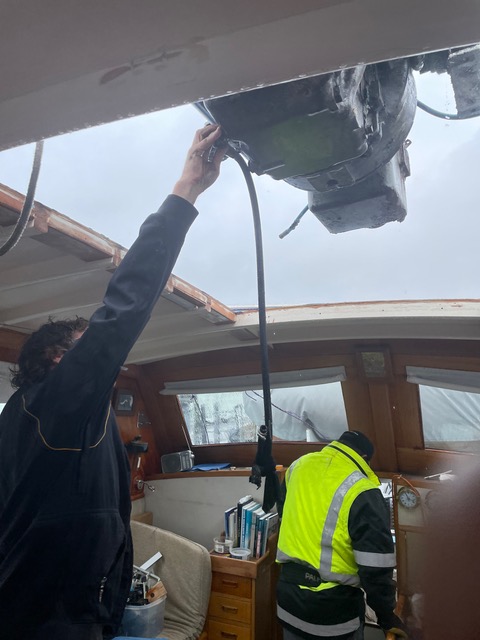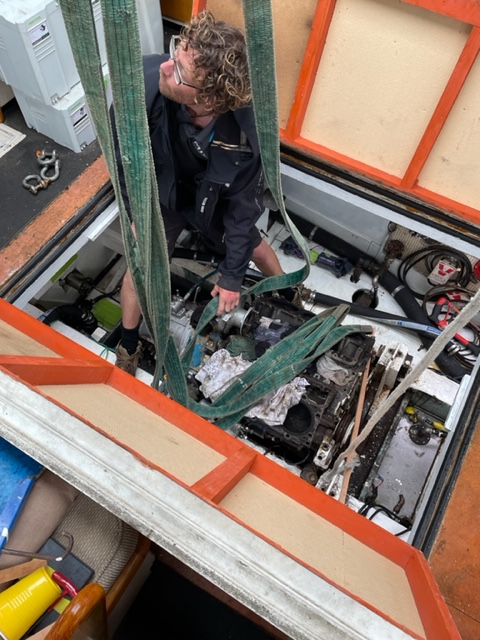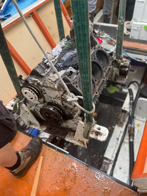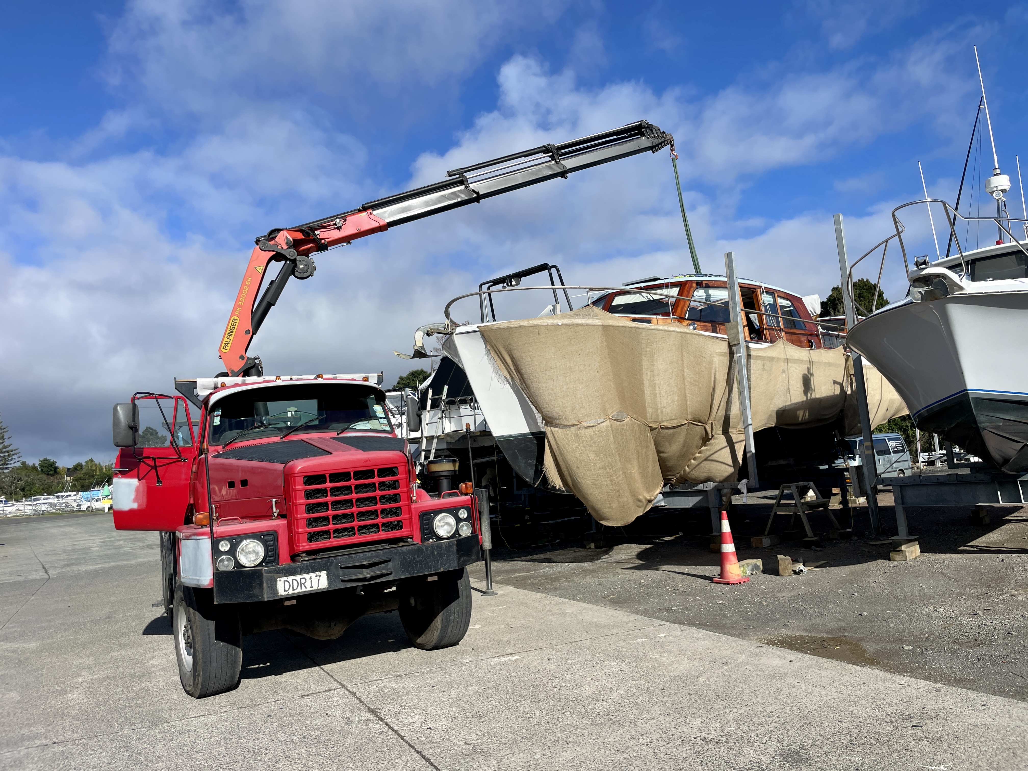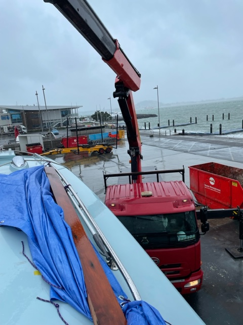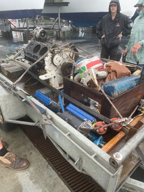 Now we all know what the weather was like in Auckland last Friday (27th), pretty bloody evil – But if you have managed to co-ordinate all the experts needed to remove a massive lump of iron – her original Cummins V6 215hp (photo below) from your boat, you have to push the green button no mater what the weather.