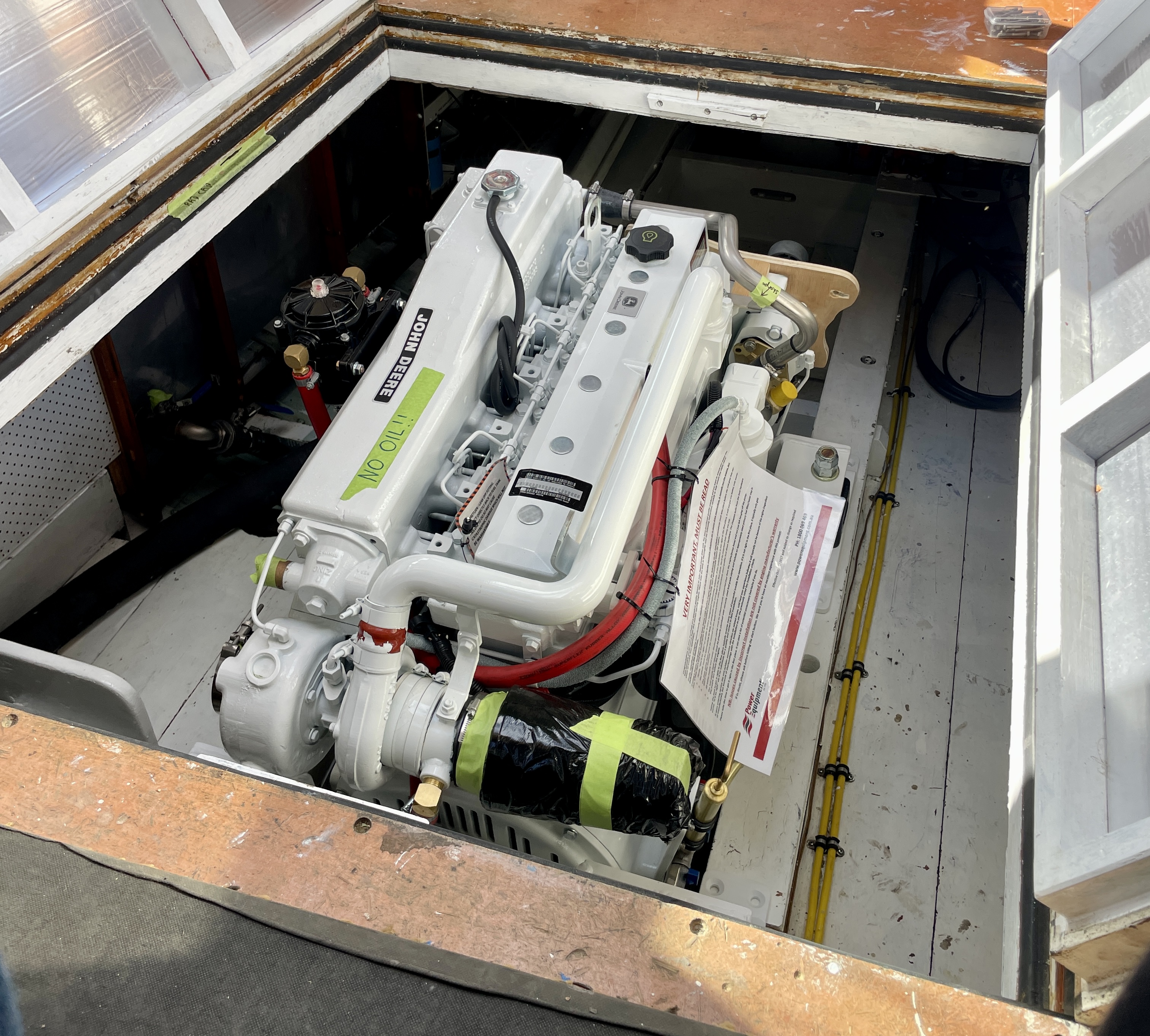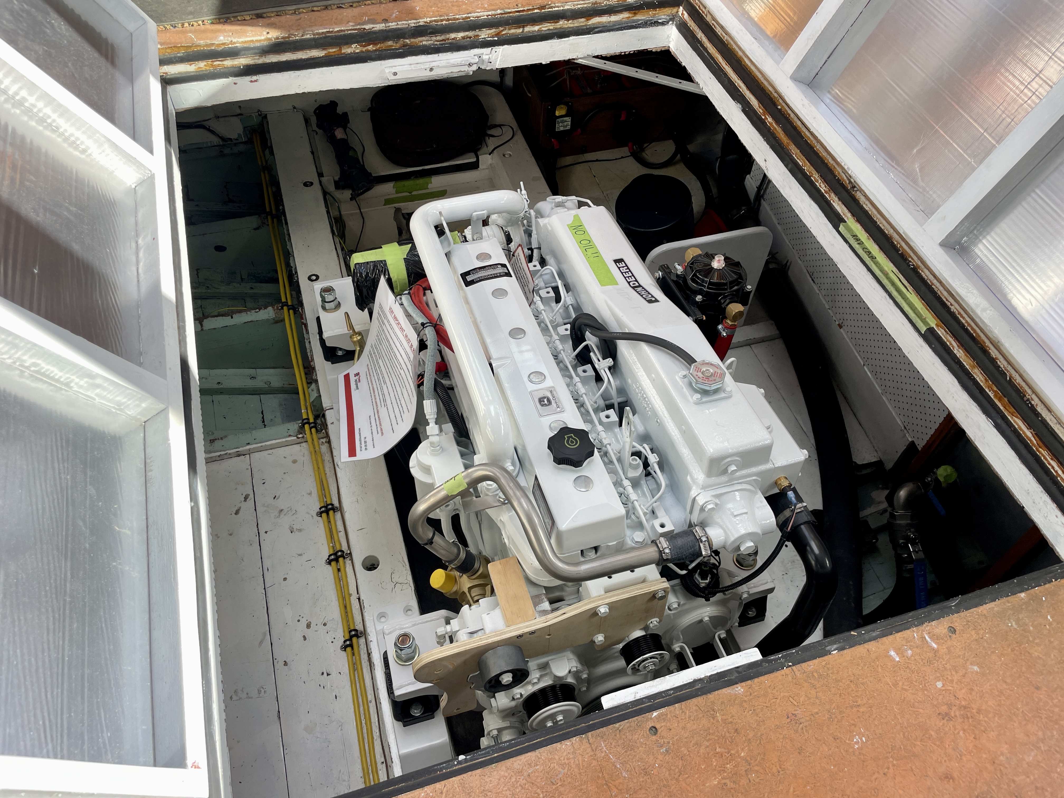 Overview of recent work One new water tank, two new fuel tanks, all new plumbing and valves and fuel filter, fuel and water sight tubes and valves, new fuel breathers, new28x23 inch propellor, new and re-positioned motor water intake and toilet water intake and valves all Truedesign nylon and piping, new toilet outflow valve, new 175hp John Deere with ccv and a second alternator (Balmar 175 amp) engineered onto continuous belt, new 2.5:1 ZF gearbox, new fibreglass exhaust system, replaced exhaust on Webasto diesel heater with genuine Webasto parts, installed SaltAttack injection system for flushing motor, built dorade tubes for the 4 half funnels on the sides of the wheelhouse, created a soft closure hatch in the cabin top for the future when needed, new insulation for engine room hatches and around fuel tanks. Cleaned up all bilges under motor and painted white. Able to use existing shaft, dry seal and jack shaft which were all replaced two years ago. Anti-fouled hull and Propspeed to new prop.