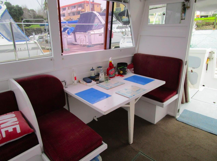 Built from double diagonal kauri (+ glassed….) she was launched in c.1972. A Bill Couldrey design, she measures approx. 34’ in length, with a beam of 11’3” and draws 2’7”. Powered by a 80hp Ford Diesel engine that gives her a comfortable cruise speed of 7.5 knots.