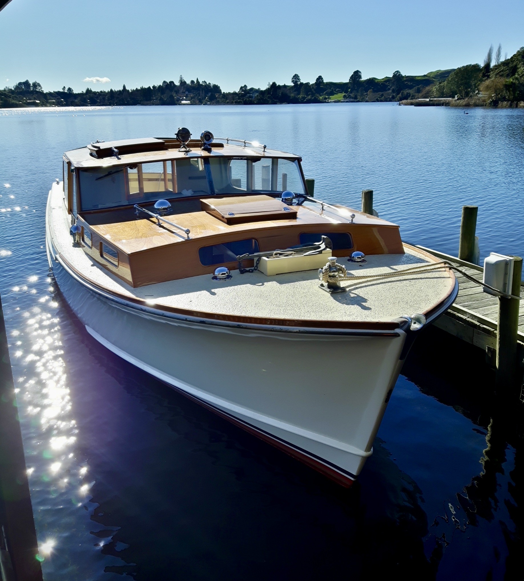 The 1965, Jim (James) Dymock built 38’ launch – Merita, last appeared on WW in June 2016 when Murray Morrissey sent in a great collection of photos from her her launch day at Milford, Auckland. I understand that Brin Wilson had a hand in designing the cabin top. Link here to that story https://waitematawoodys.com/2016/06/06/merita-launch-day/