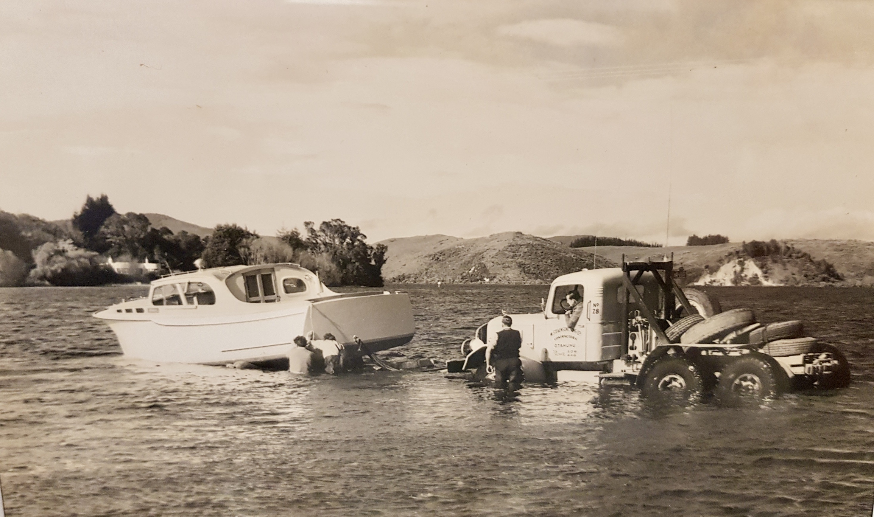 Boat builder Alan Craig (Craig Marine) sent in todays’ gallery of photos of the Brin Wilson designed launch – Colleen owned by Bill Stevenson. We see her being launched at Lake Tarawera where she still resides today. Appears that there were a few challenges with the lake level.