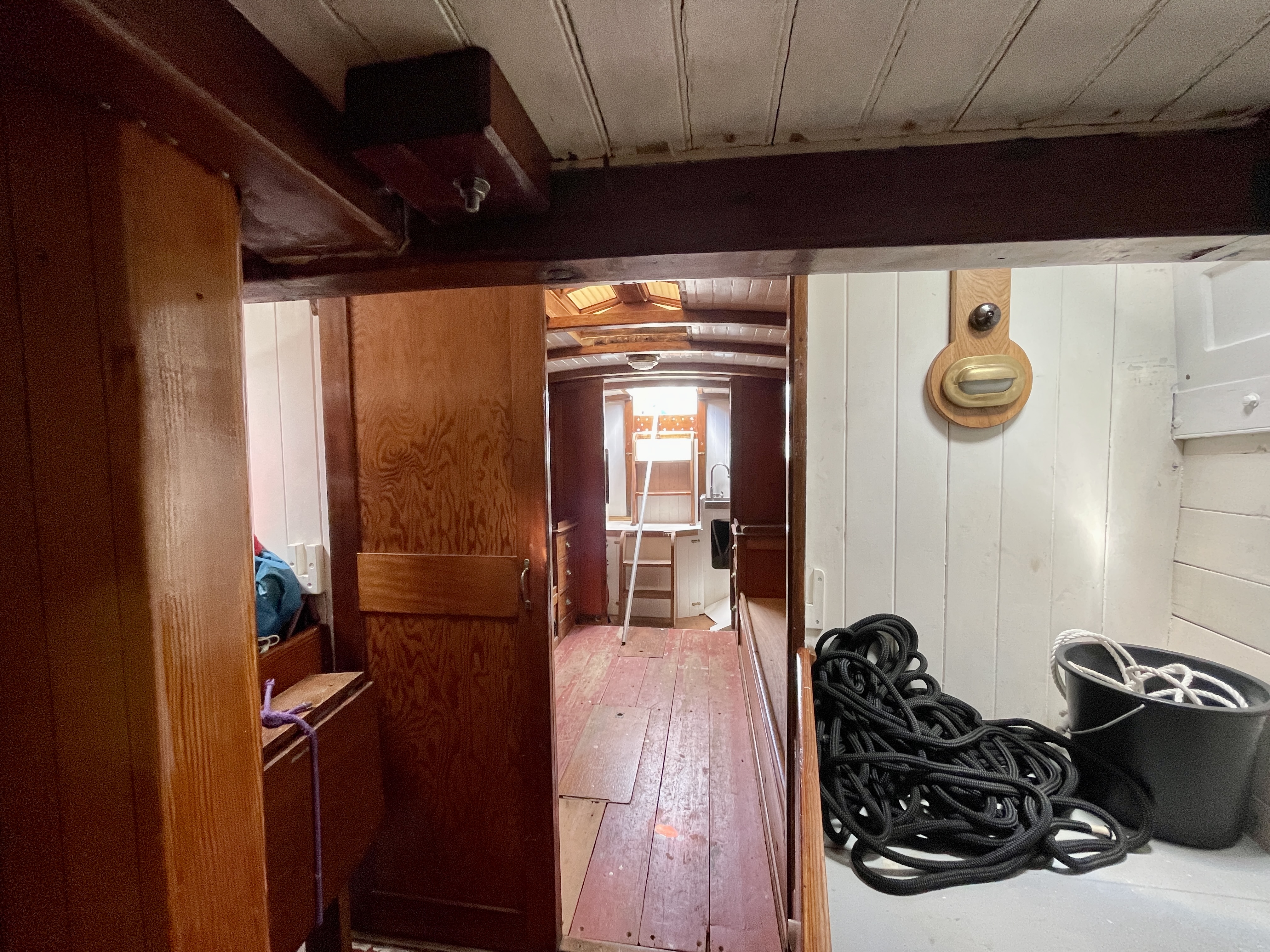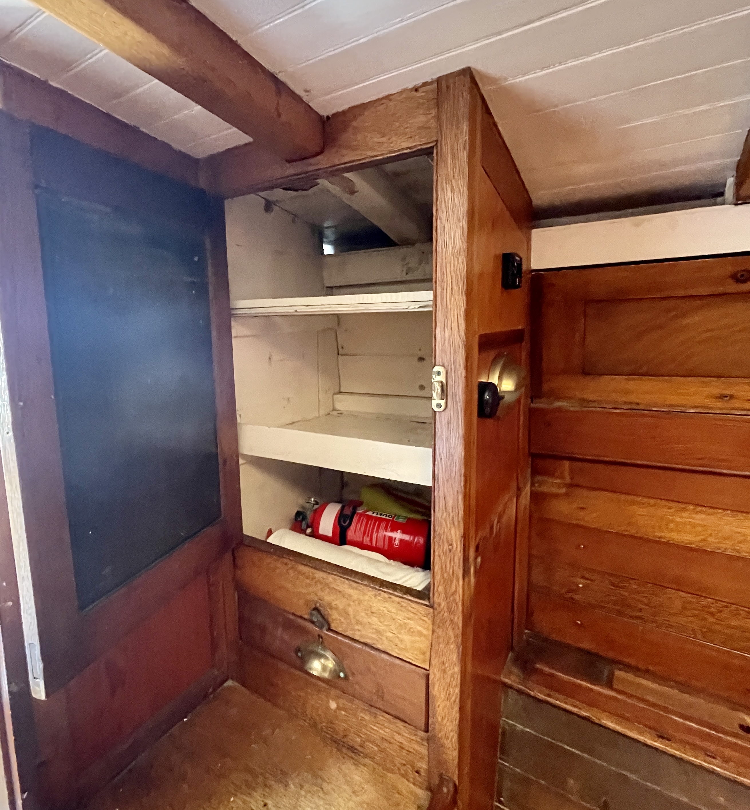 Caplin is built in pitch-pine planks over oak frames with mahogany and teak trim – specs > 35’ length overall, 9’6” beam and draws 5’4”. Power is via a Yammer 3GM30F diesel.