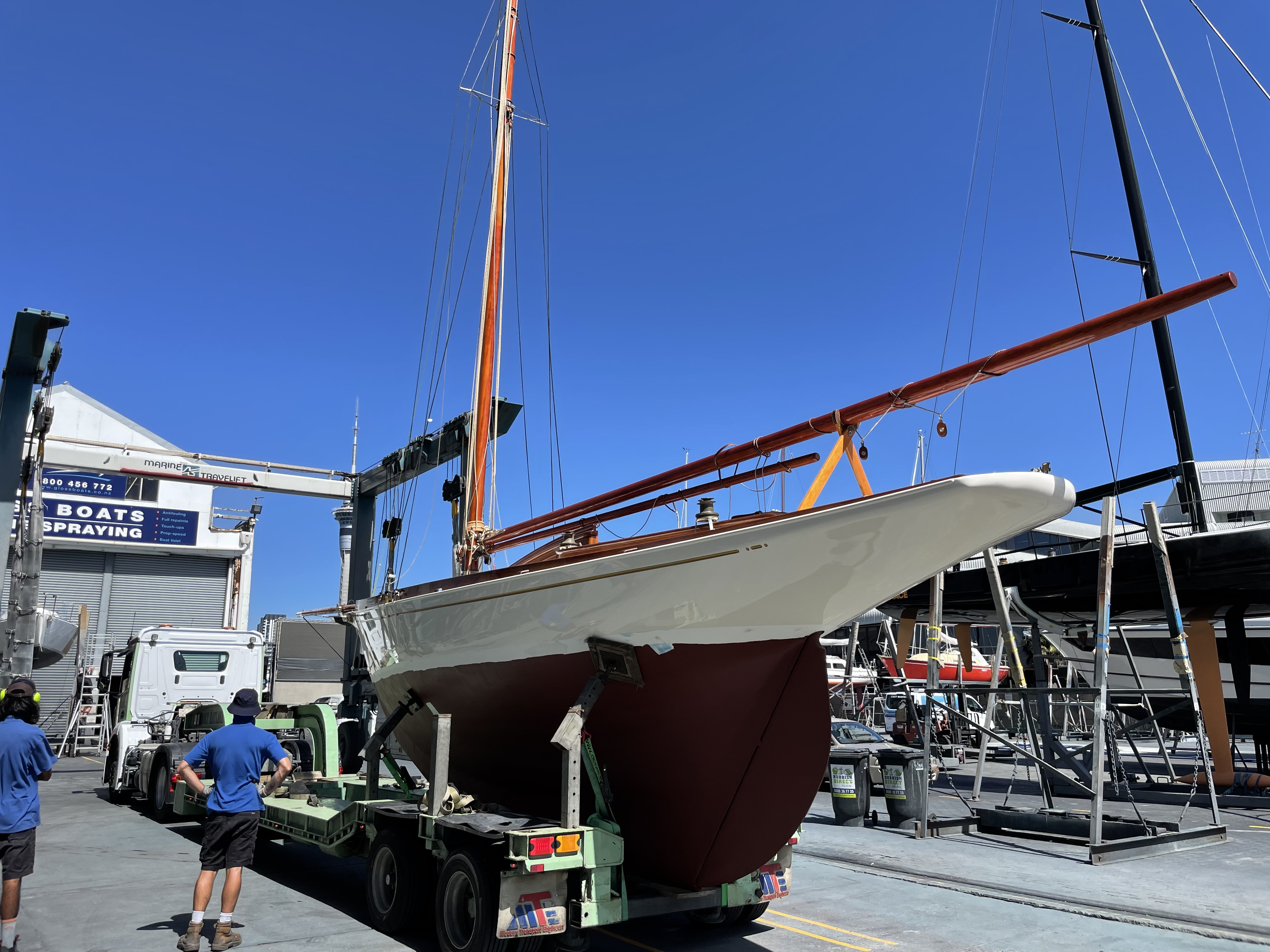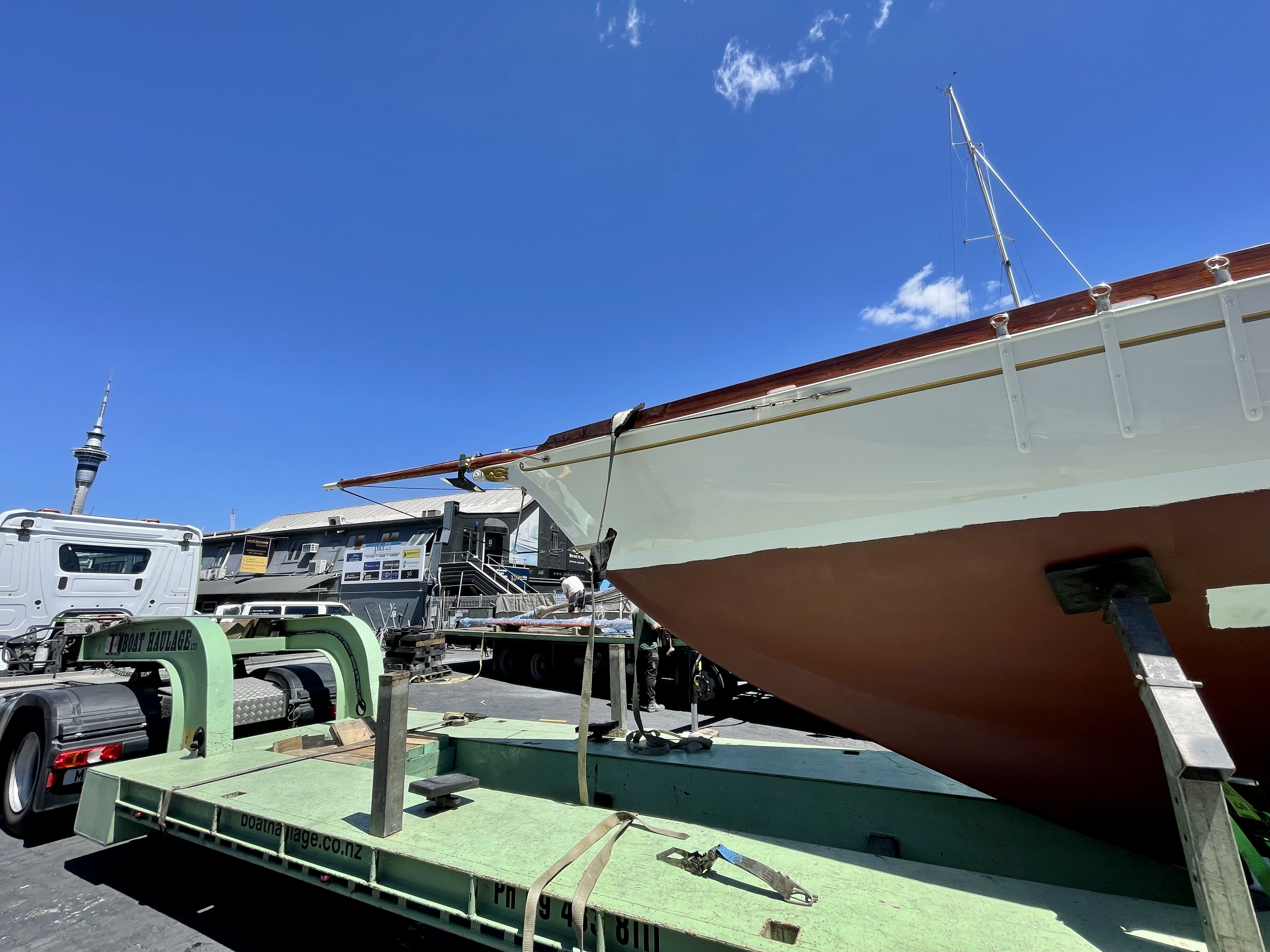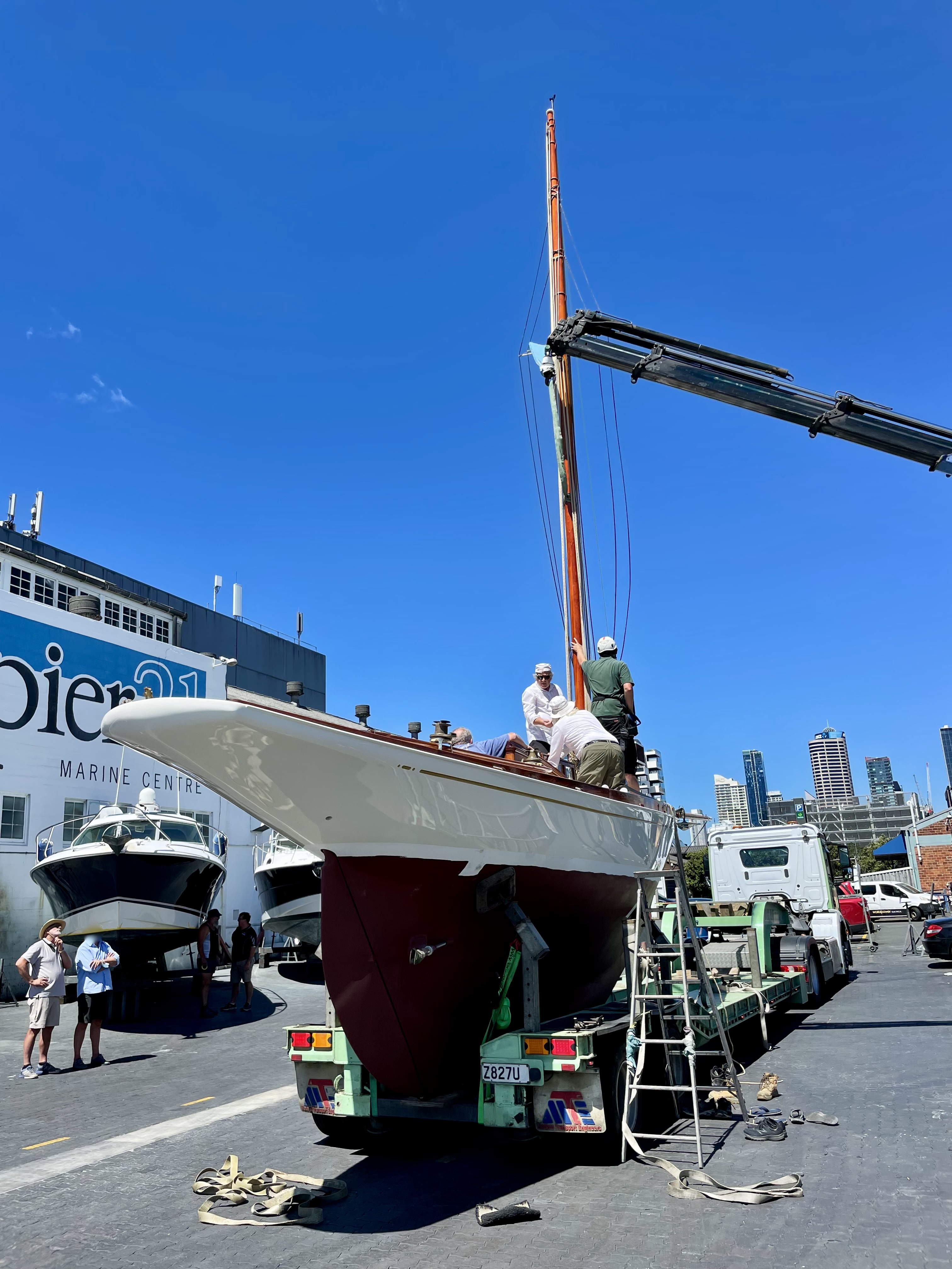 Rather a special afternoon yesterday, got to have a sneak peek at Rogue, the 1892 Chas Bailey Jnr. built gaffer. She slipped out of Wayne Olsen’s shed and headed to the Pier 21 yard at Westhaven, with the intention being to step the mast and do a quick waterline sighting before hauling out for the final coats of paint and commissioning.