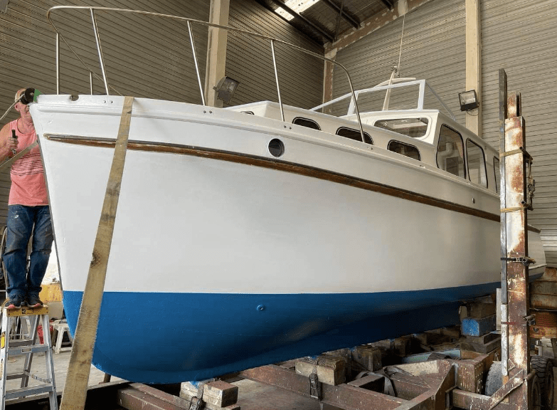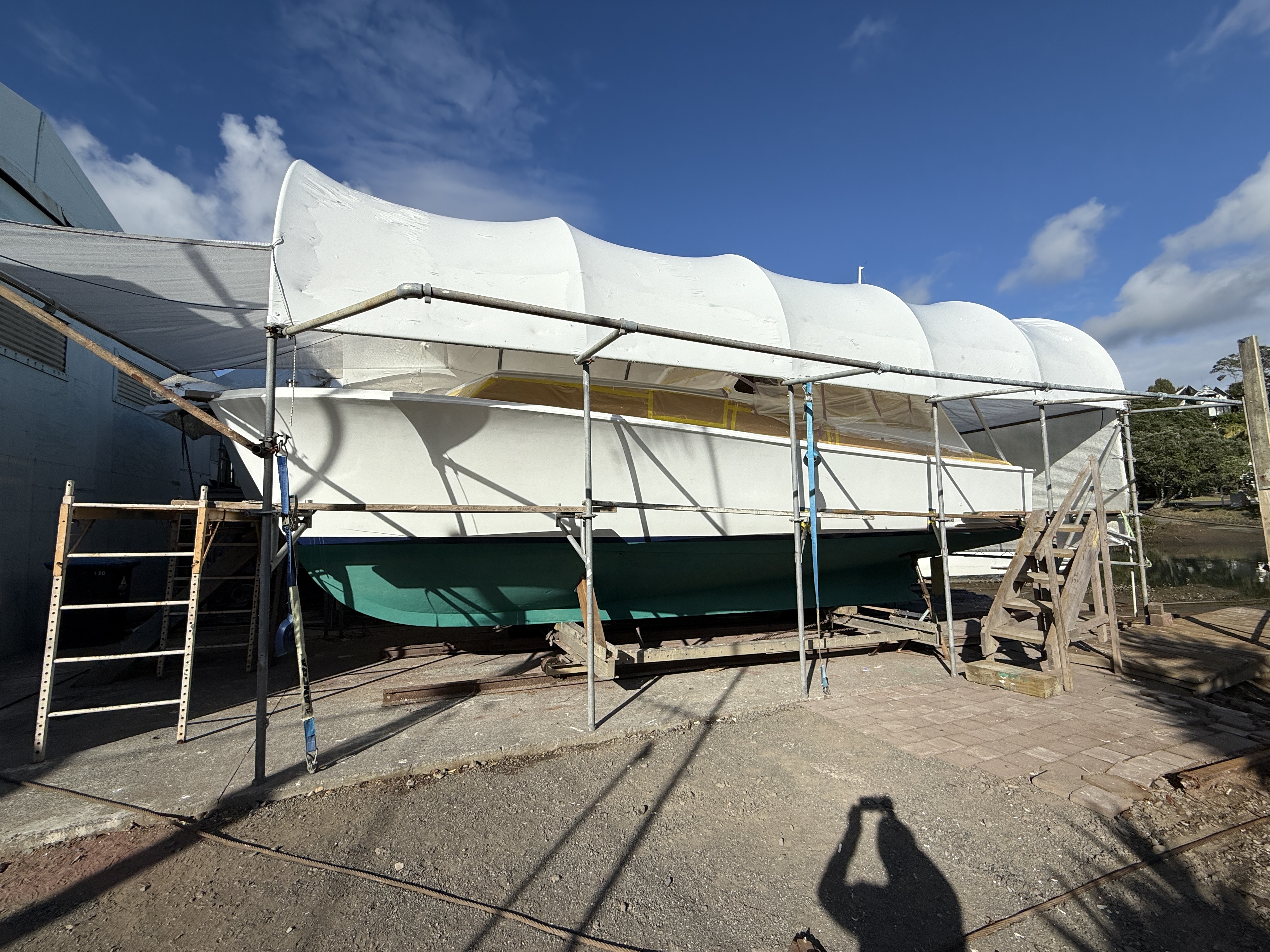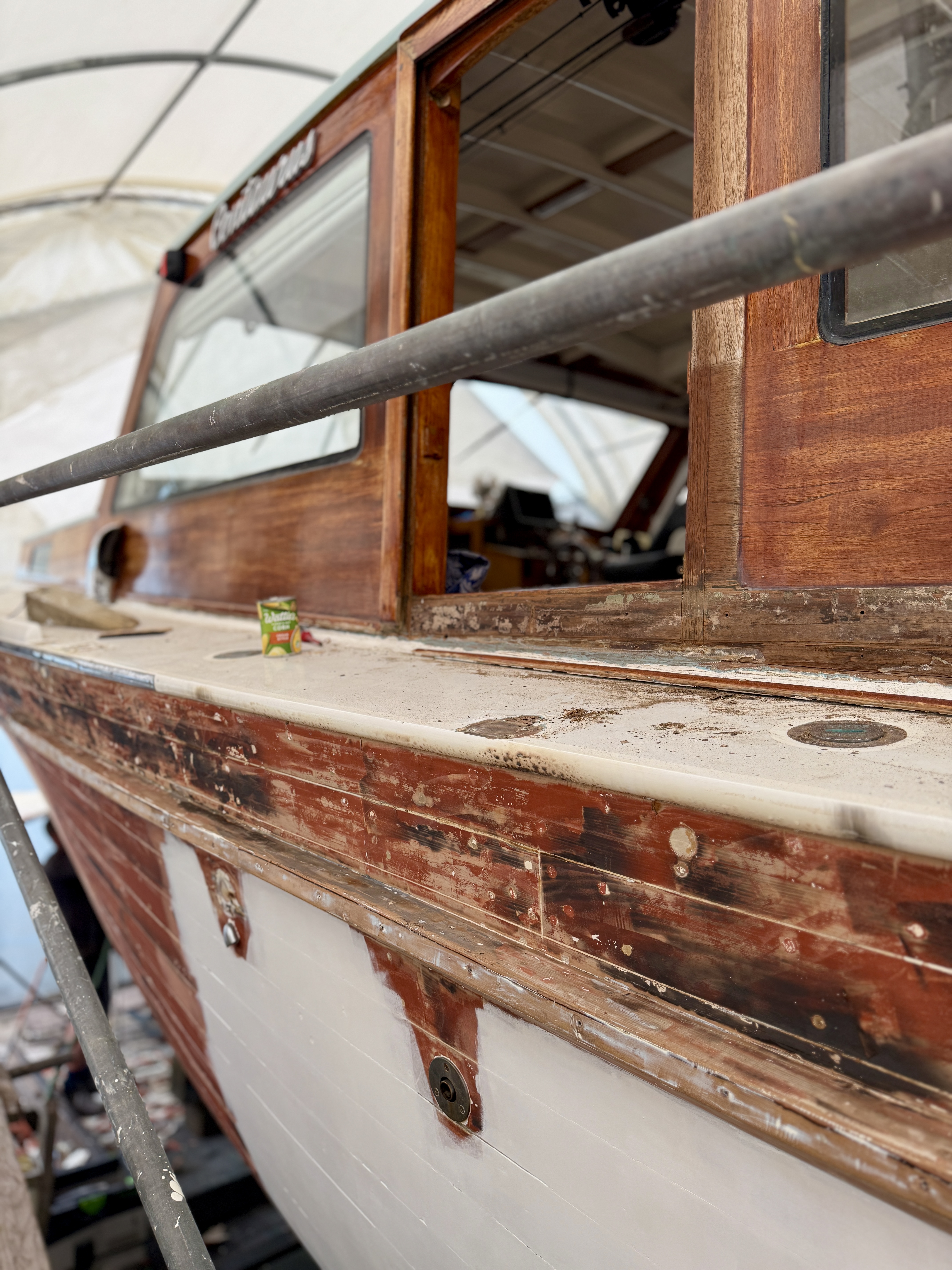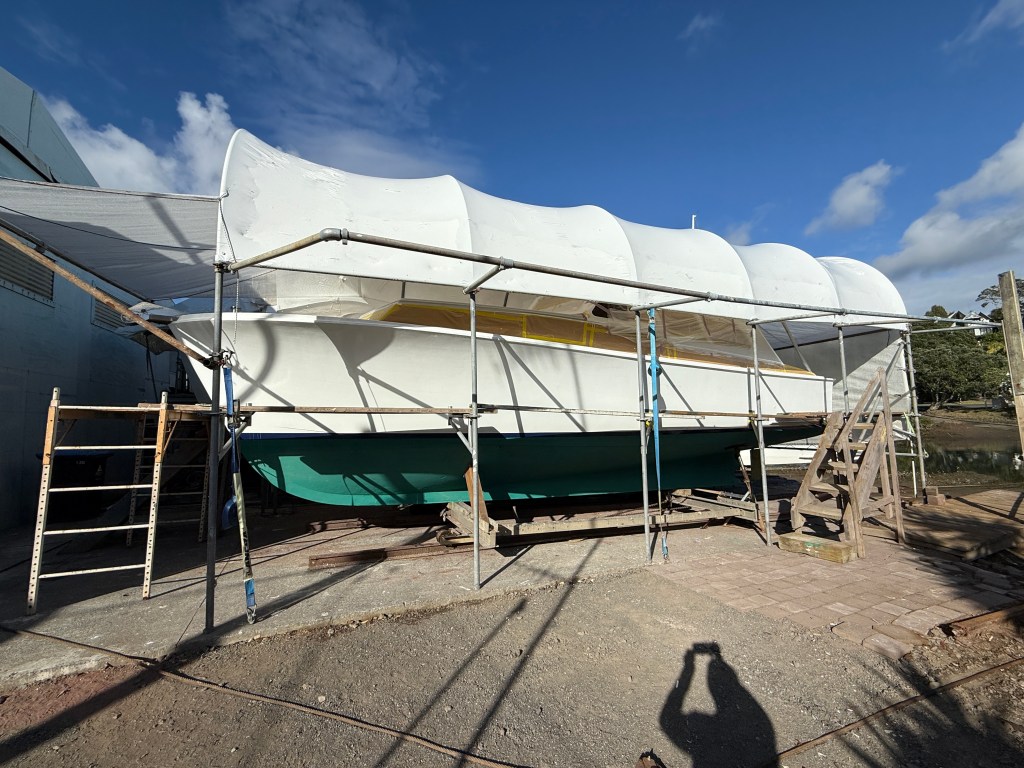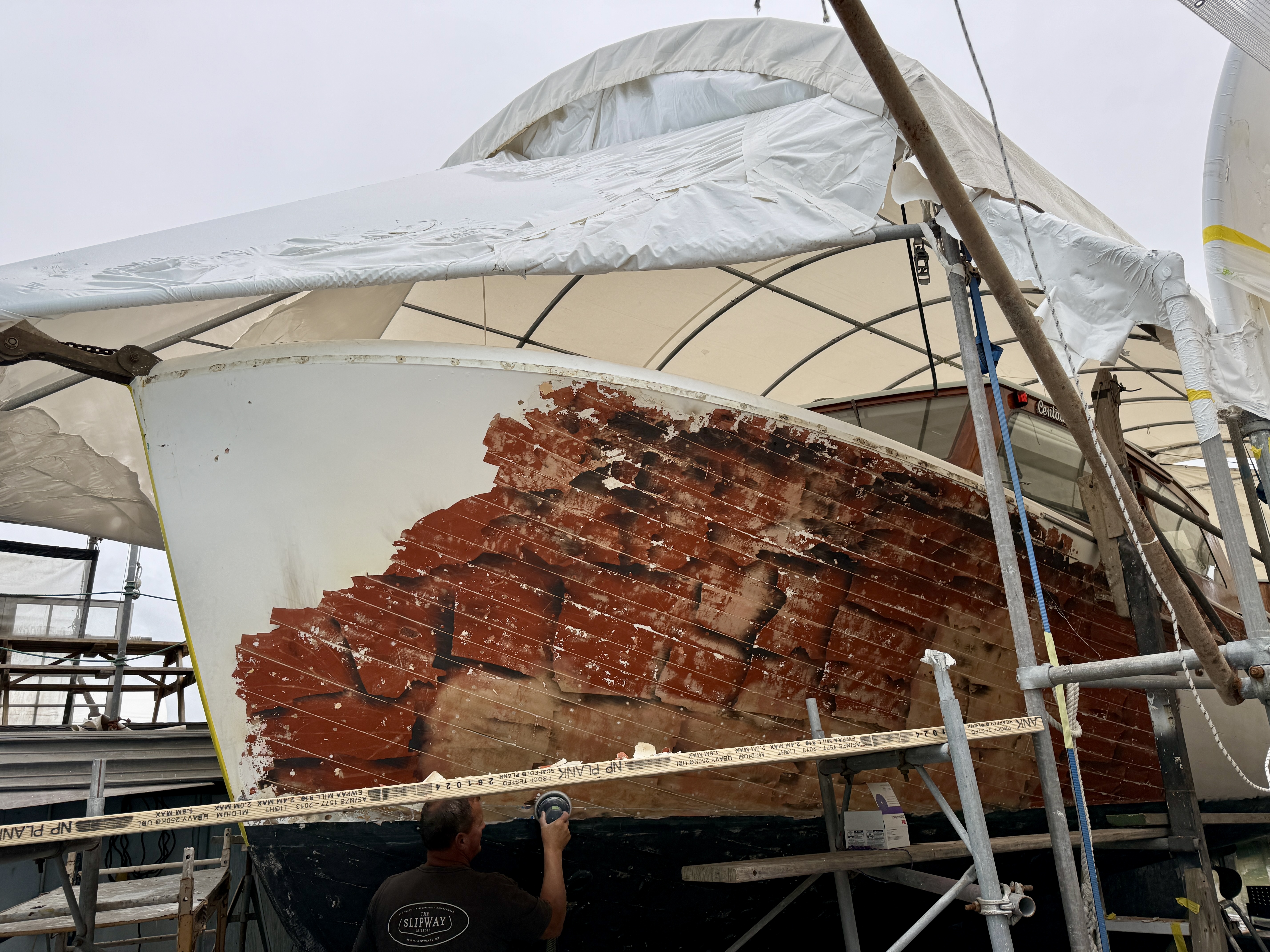 Alongside AWARIKI is the 42’ 1969 Bailey & Sons built launch – CENTAURUS, out for a JPPJ (Jason Prew paint job) that has turned into a back to bare wood effort. The starboard side has one coat on and already looks the bees knees. Owner Angus Rogers is onsite attacking the brightwork, so this old lady will be very regal when she relaunches.