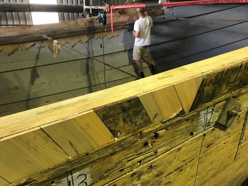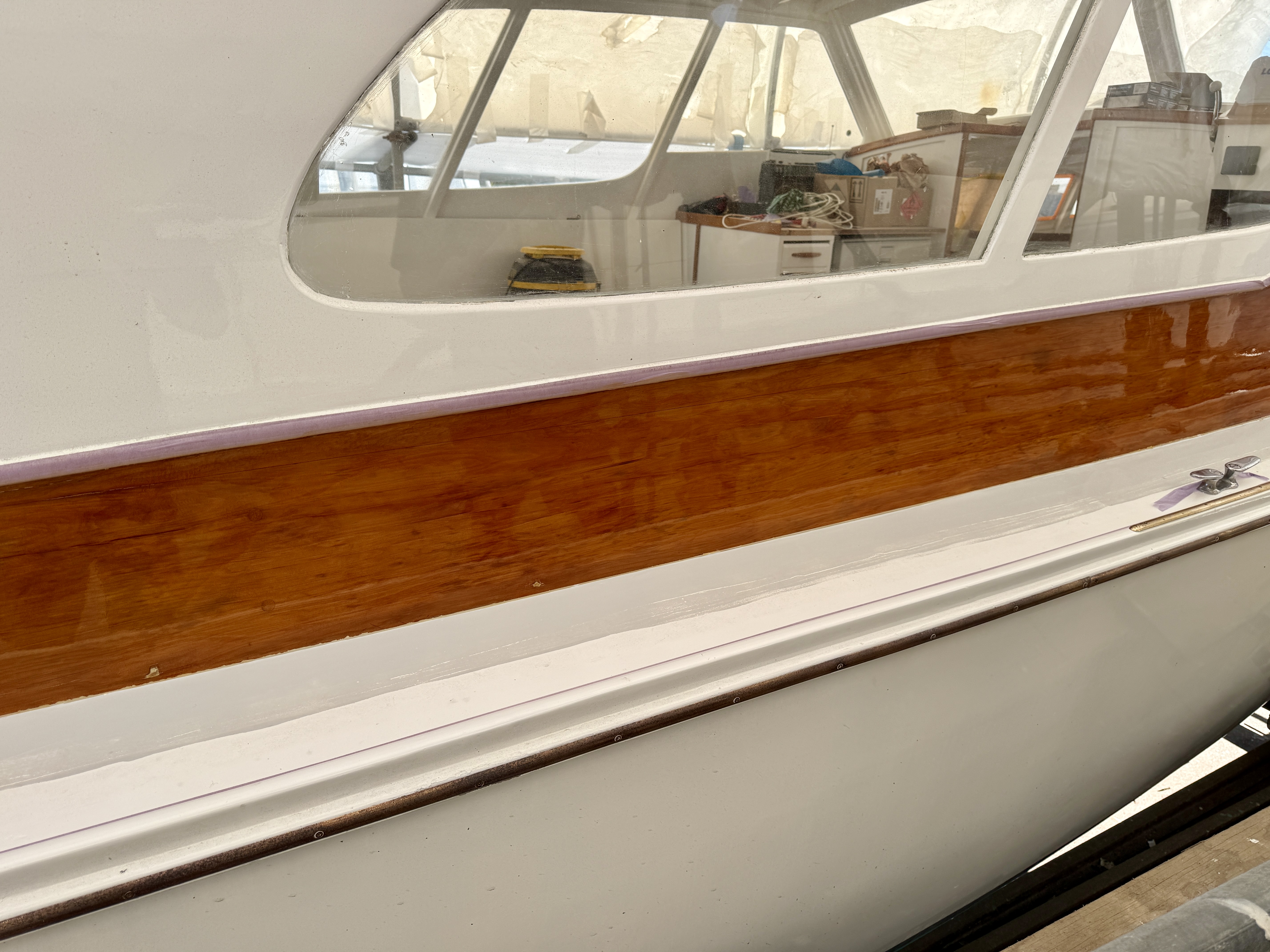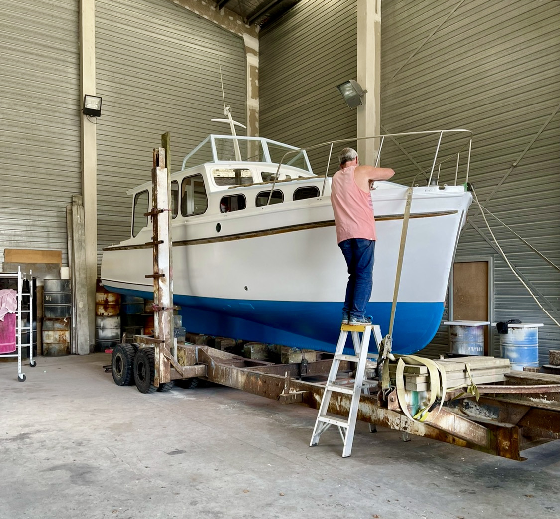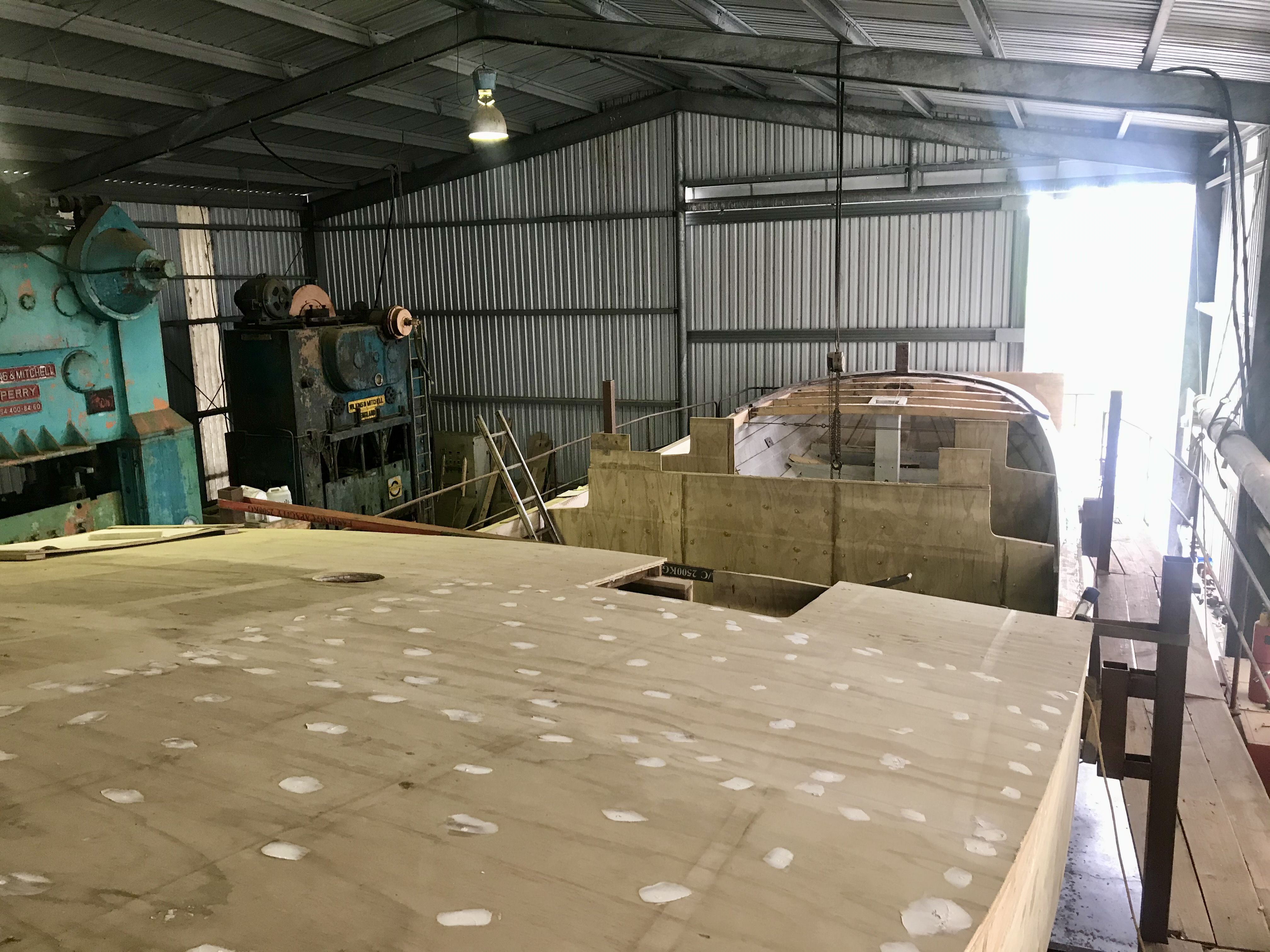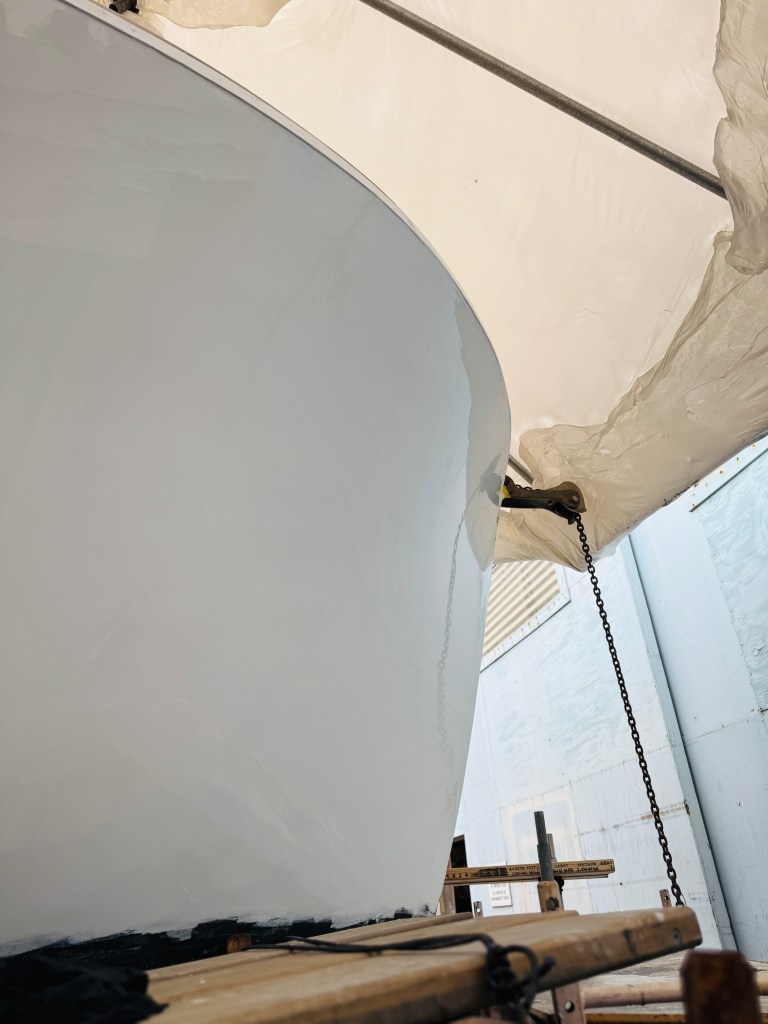 Alongside AWARIKI is the 42’ 1969 Bailey & Sons built launch – CENTAURUS, out for a JPPJ (Jason Prew paint job) that has turned into a back to bare wood effort. The starboard side has one coat on and already looks the bees knees. Owner Angus Rogers is onsite attacking the brightwork, so this old lady will be very regal when she relaunches.