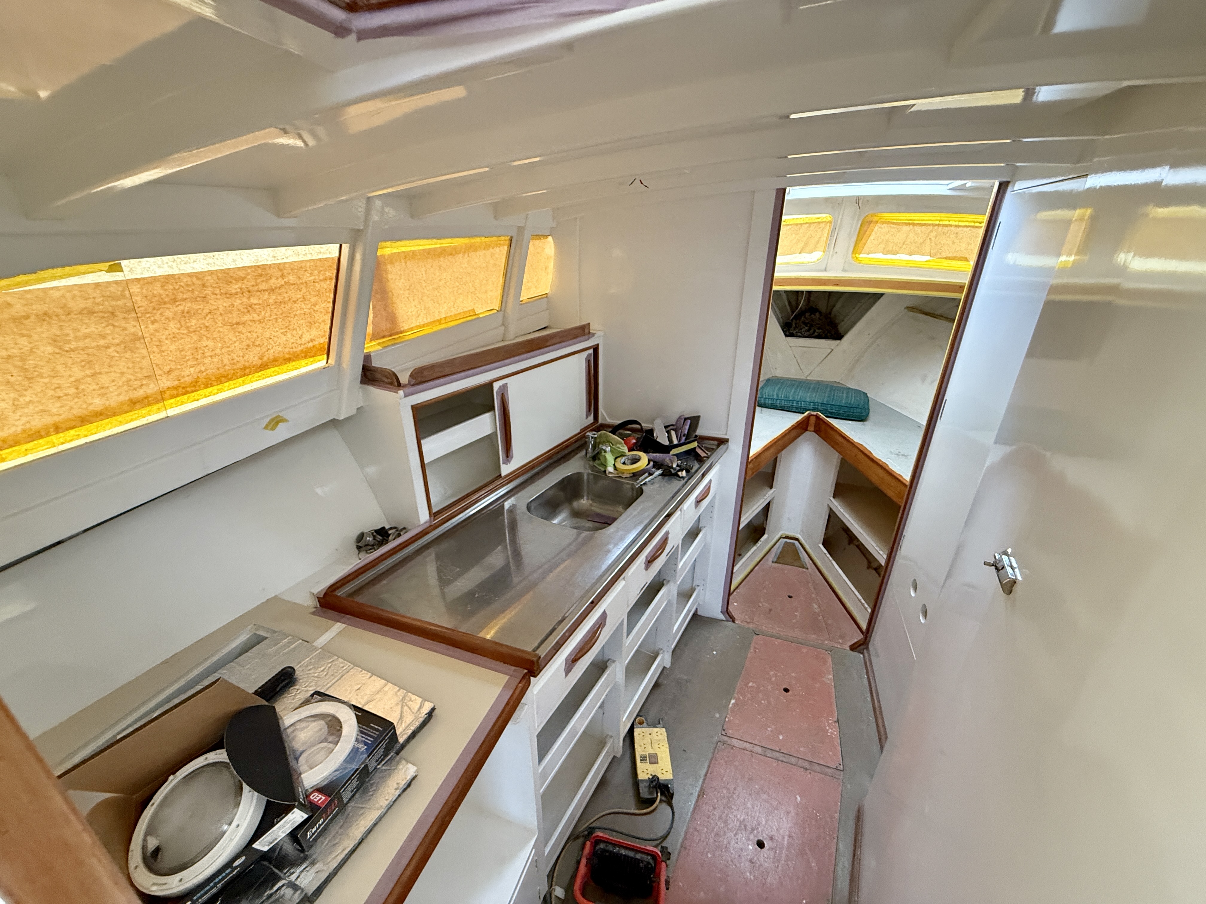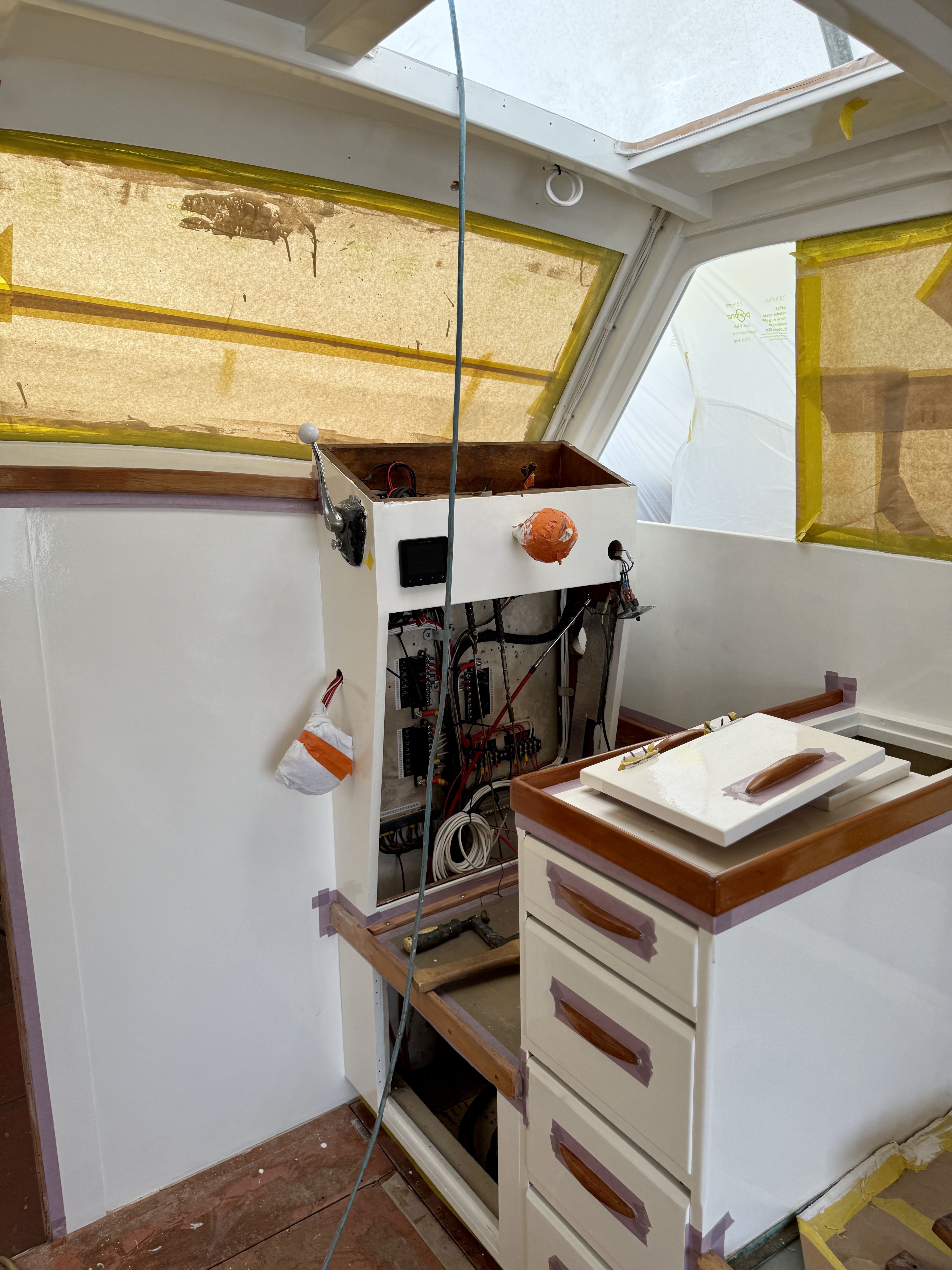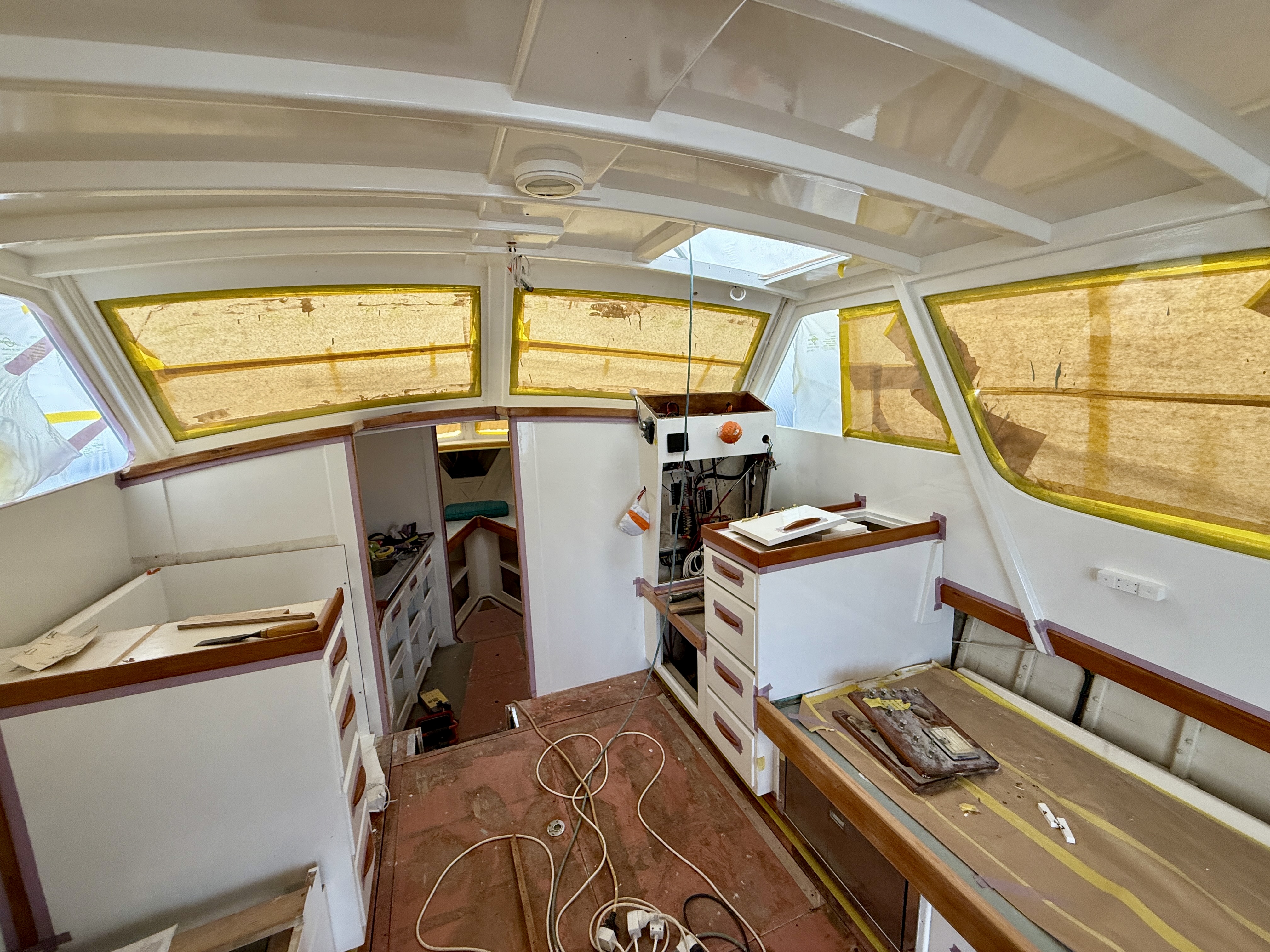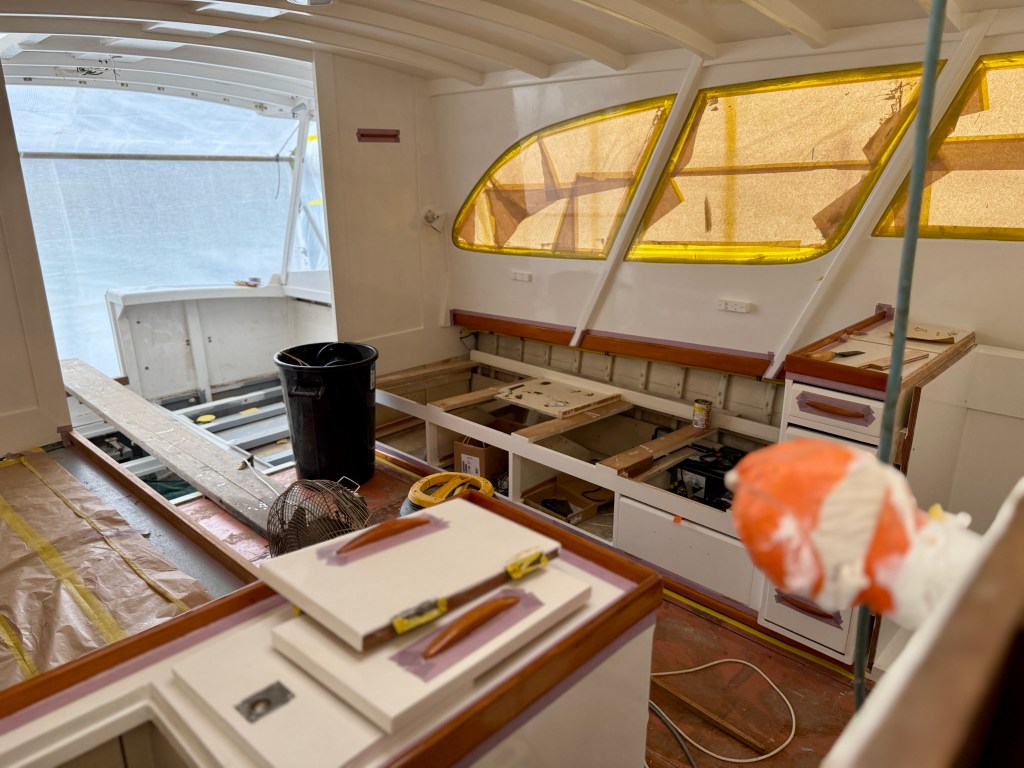 16-05-2025 YARD UPDATE – work continues on AWARIKI, interior looking very sharp + the new varnished coamings are a game changer – love it.