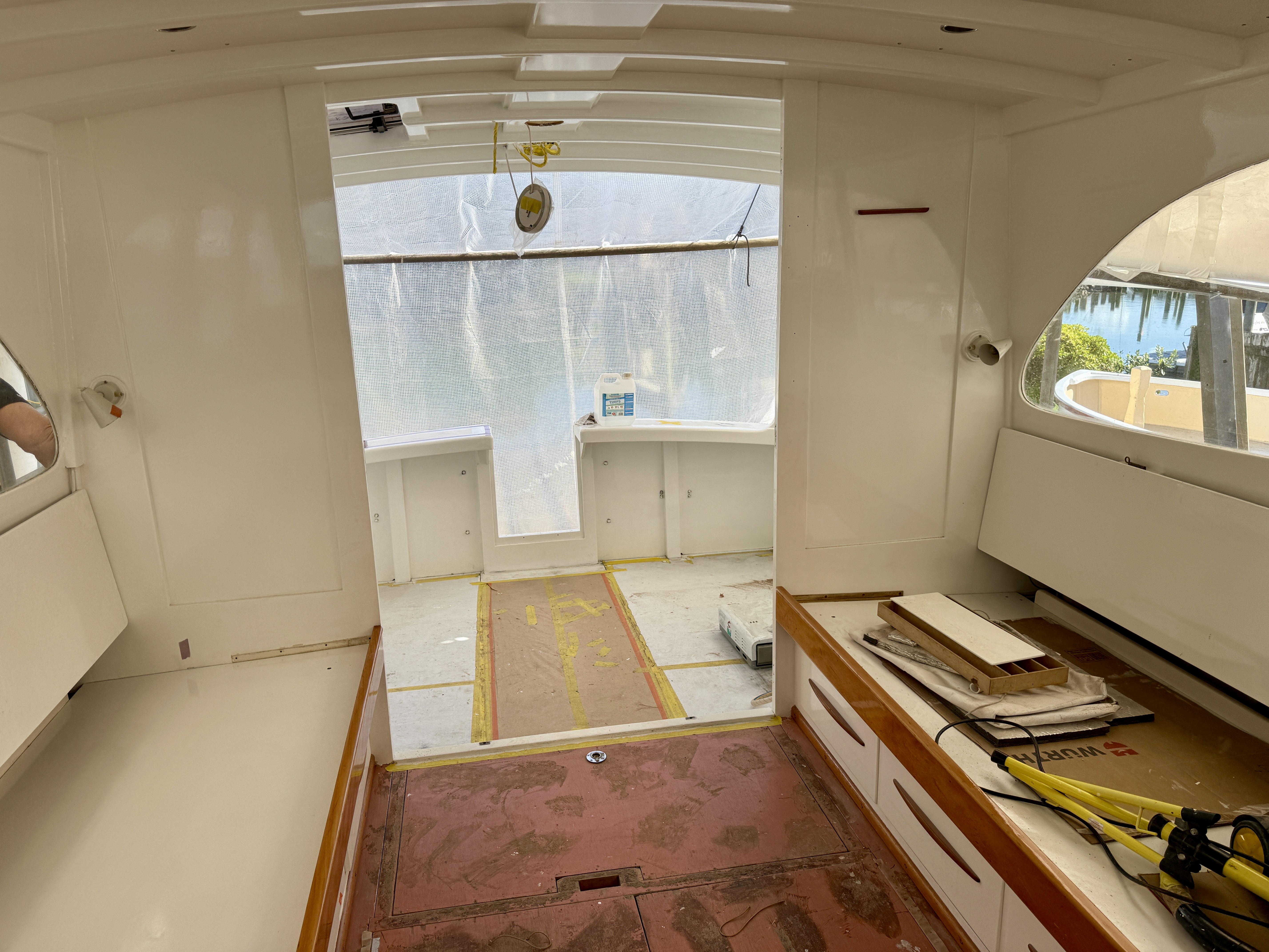 We reported in mid Feb (link below) that the 32’ 1967 Owen Woolley built and designed launch – AWARIKI was in the process of losing her flybridge (✔️), well woodys the work continues, the team are currently refurbishing the interior.