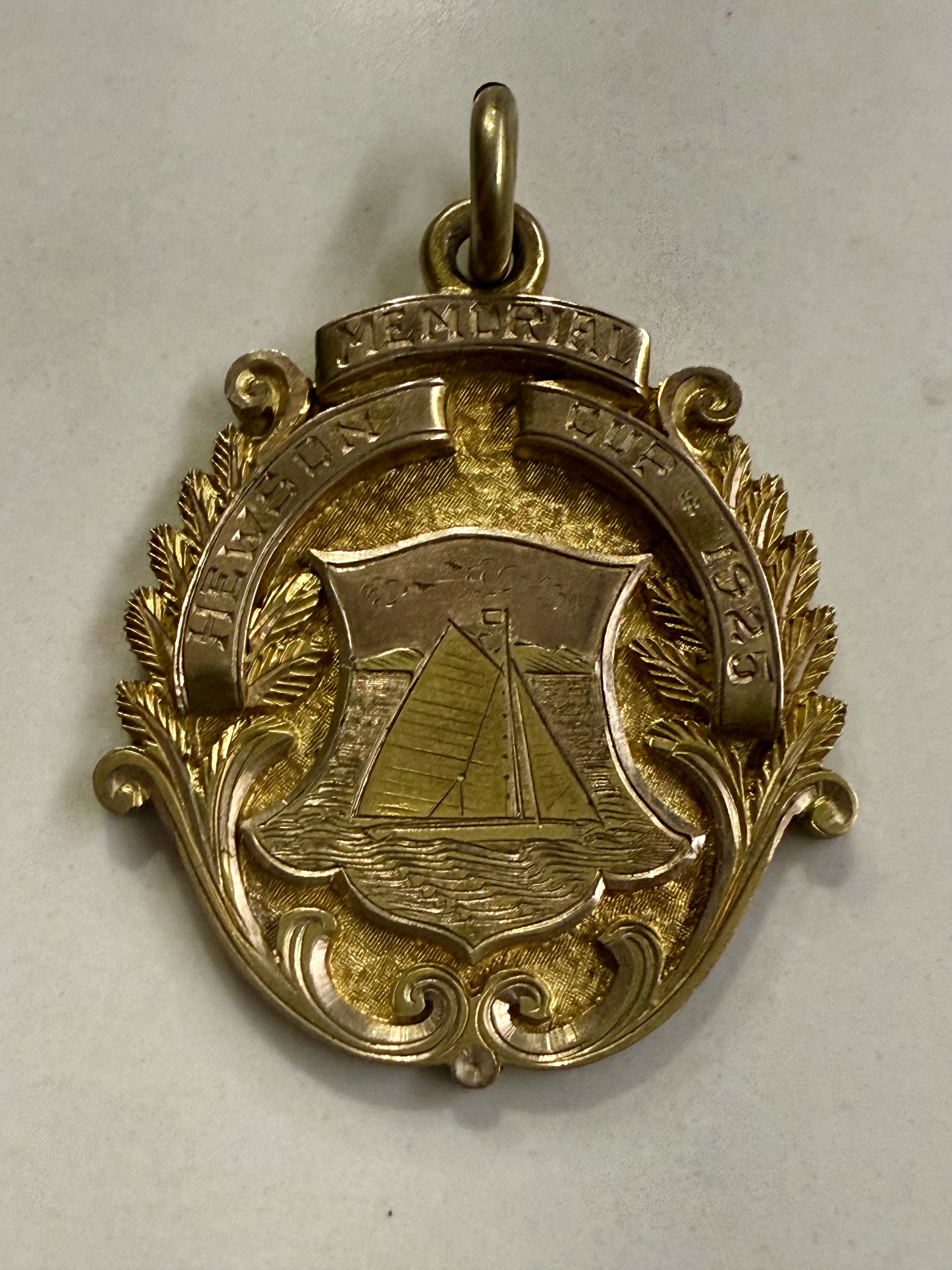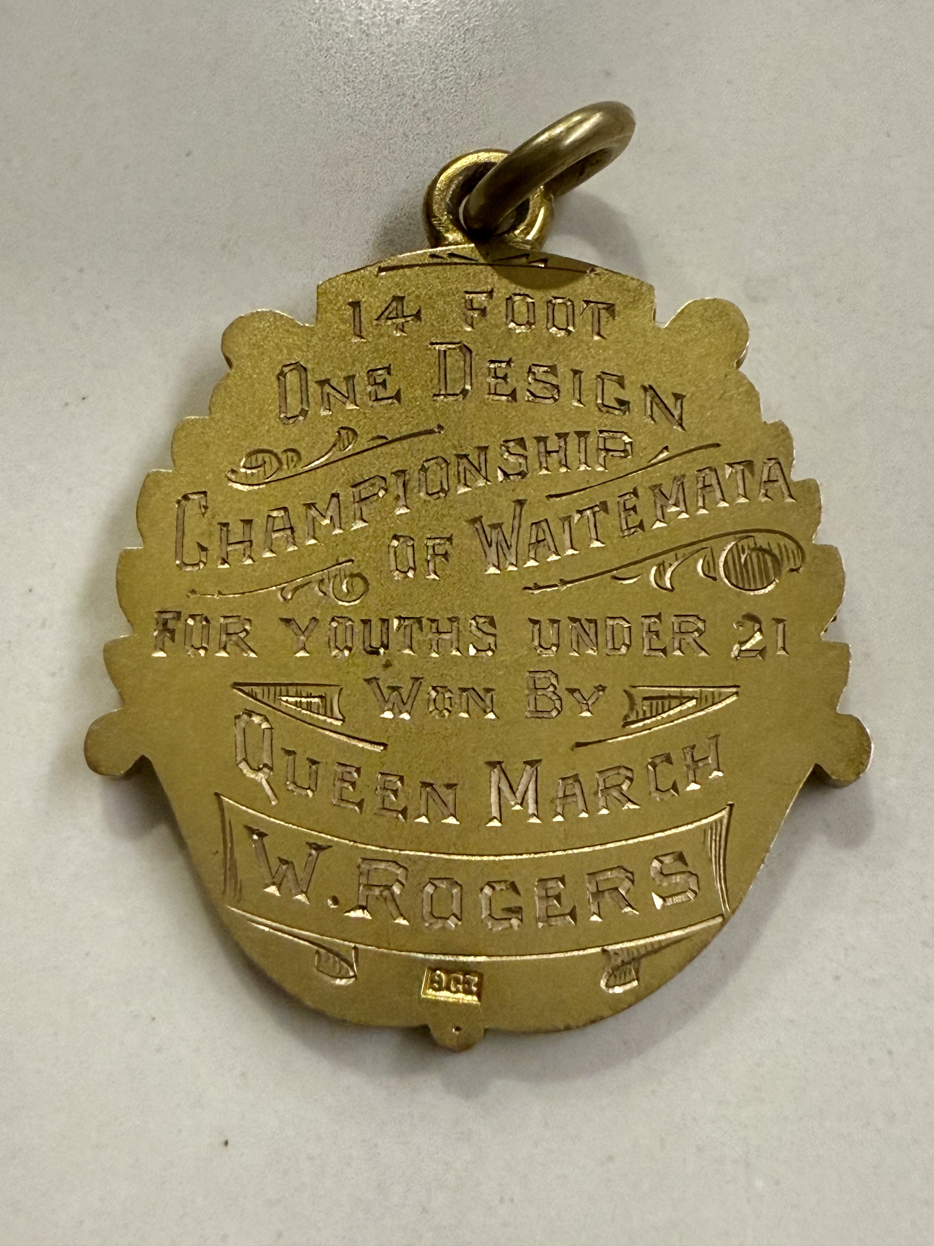 Bumped into a fried who is an antiques dealer and he showed me a recent find – the wording on the front of the gold medal / badge reads – Memorial Hewson Cup 1925, back – 14’ One Design Championship of Waitemata For Youths Under 21 – ‘Queen March’ – W. Rogers’. I bet W. Rogers had no idea the value of their medal in 2025.