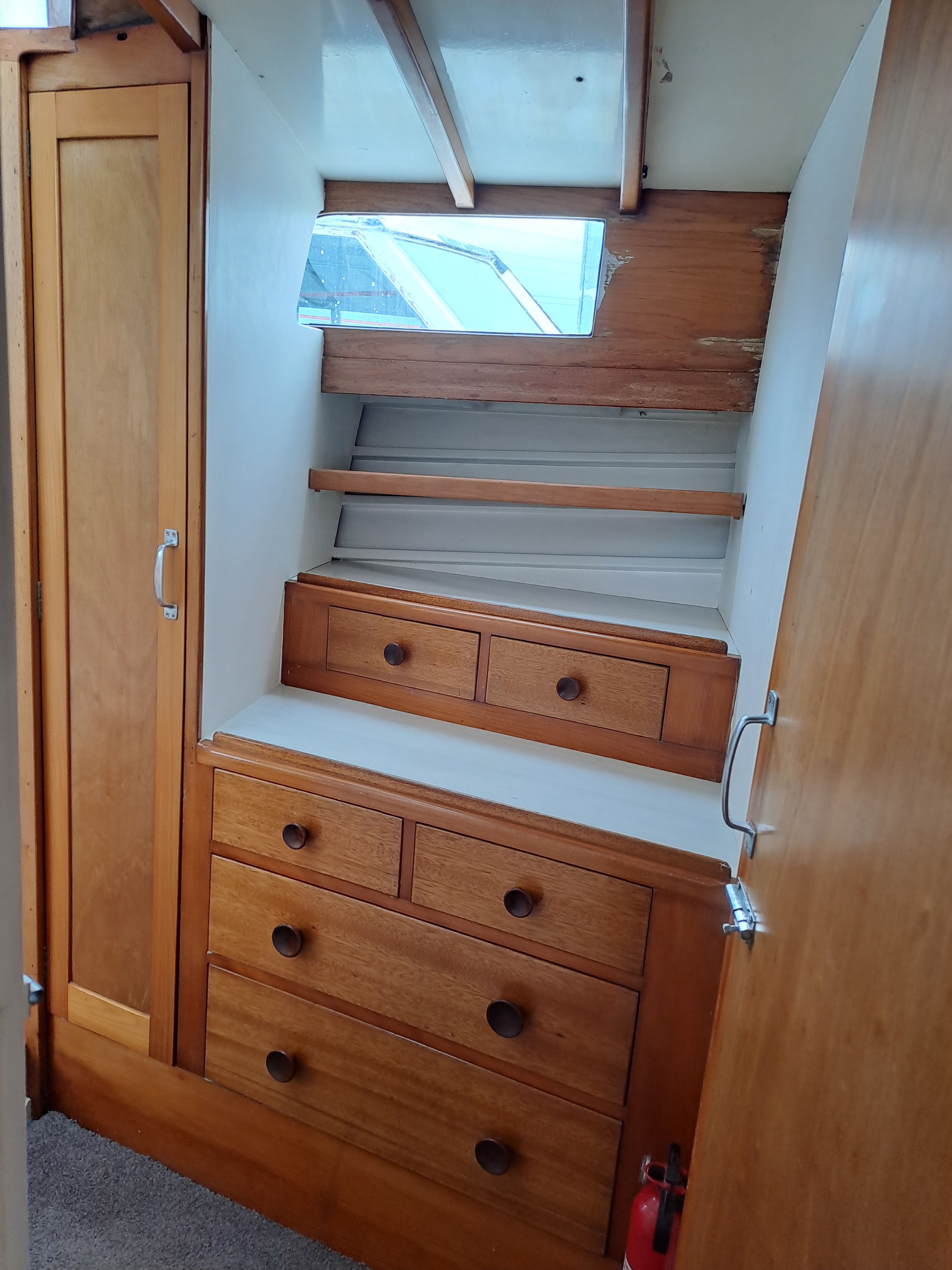 Construction was twin skin diagonal heart kauri planks. Her specs were 32’ x 11’ beam x 3’10” draft.