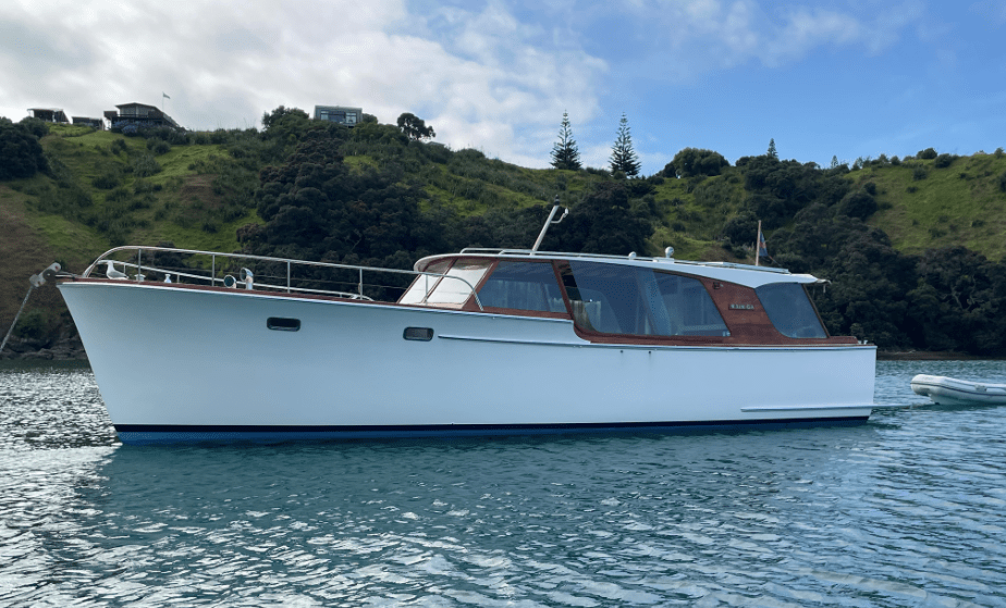 Todays woody is the classic wooden launch – KAREMOANA, designed and built by Chris Robertson and launched in 1968. She was one several craft referred to as the ‘ Chris Robertson Fast Cruisers’. And fast she was in her day, a 135hp Commer 3D215 diesel engine saw her topping out at 17 knots.