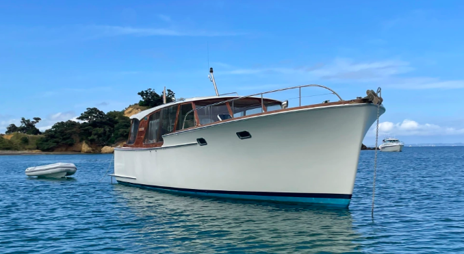 Todays woody is the classic wooden launch – KAREMOANA, designed and built by Chris Robertson and launched in 1968. She was one several craft referred to as the ‘ Chris Robertson Fast Cruisers’. And fast she was in her day, a 135hp Commer 3D215 diesel engine saw her topping out at 17 knots.