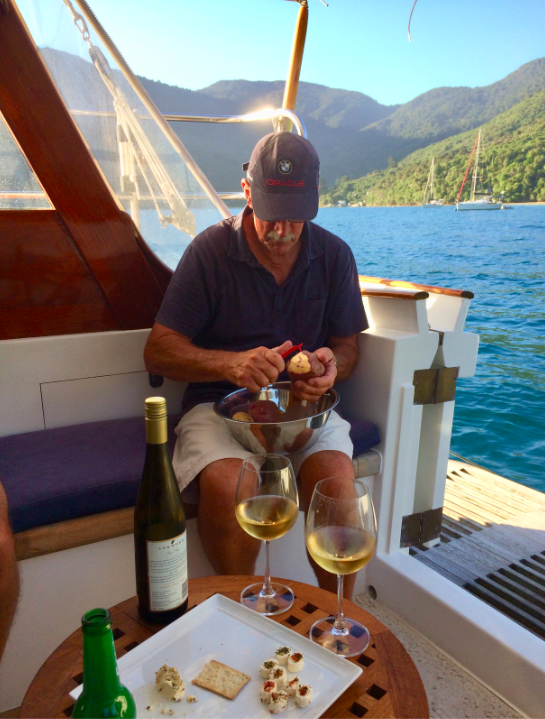 The photo above of David aboard his motor launch – TRINIDAD was taken in the Marlborough Sounds in February 2018 , the Cookes had invited myself and Jamie Hudson to share the Whangaroa > Picton leg with them on their circumnavigation of New Zealand. Probably the best time afloat I have had. This photo is David in his happy place – peeling the spuds for dinner, a glass of chardonnay nearby and tray of snacks.