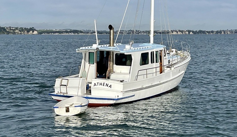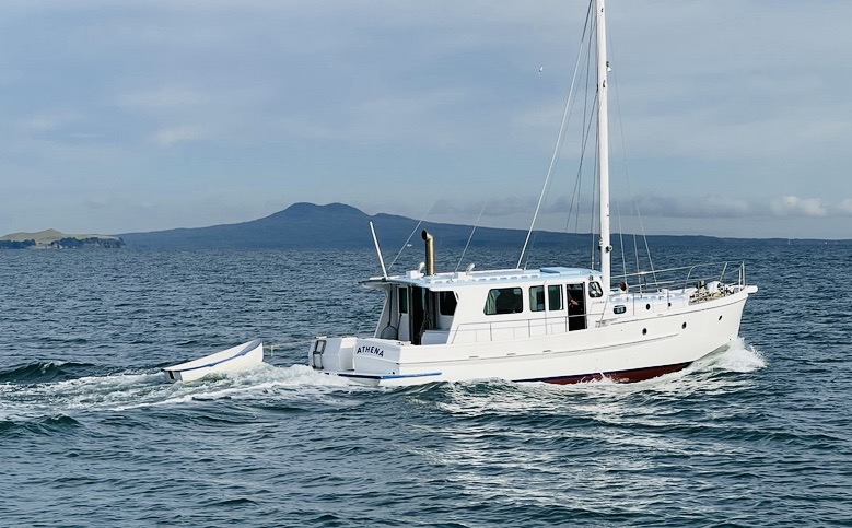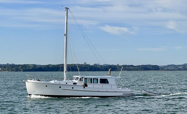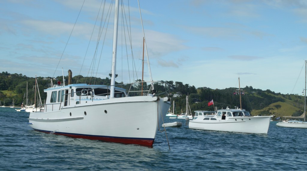 Marguerite was built by Des Donovan for Ken McLeod in Auckland in 1948. Ken owned McLeod’s bookshop in Rotorua which he started in the 1930’s and which still exists to this day, currently owned by the son of the guy Ken sold it to (so in all these years it has had only three owners). Ken was also the President of Hamilton’s St Andrews golf club. In his 20’s (1920’s) he was a book salesman for Gordon & Gotch in Northland, visiting Northland customers for days at a time on horse-back as the roads in Northland were frequently impassable by car in those days. Marguerite was named after his wife … Marguerite McLeod (known as Rita). She was 42 feet long and all planks were full length Kauri, no joins. She was originally equipped with twin Mercury gasoline car engines but Ken later fitted twin Fordsons. Her interior was Island mahogany and she slept six. He kept her at Tauranga and his favourite cruising ground was Great Barrier Island but he took her up to the Waitemata and into the Hauraki Gulf on occasions. Ken sold the boat to someone near Wellington in the early to mid 60’s who later on-sold it to a chap who stripped all the brass, engines and anything of value from her and sank her north of Rangitoto (I believe). The insurers found the wreck missing it’s internals and the culprit prosecuted. To say Ken was heart-broken when he heard the news is an understatement. So that is the story of that Marguerite. The above photo of her is from around 1955, at extreme right is Christoph’s grandmother, Marguerite McLeod (behind the chap in black). Christoph has promised to send in the NZ Herald article on the story of the sinking and the fraud discovery. Its at their bach in the Bay of Islands so next trip he will dig it out & send it. Should be an interesting read 🙂