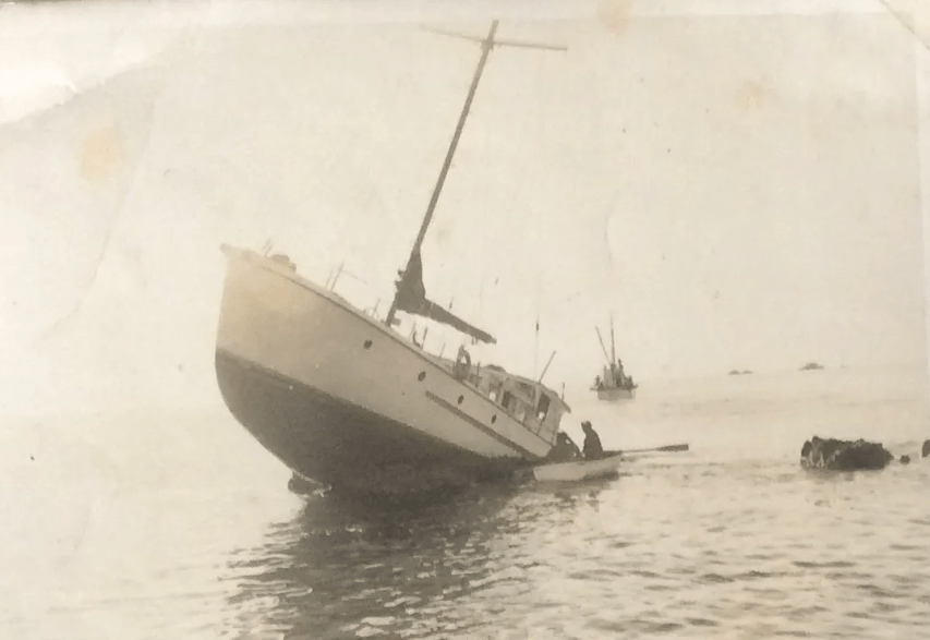When suddenly Ken & his parents heard a huge crashing noise, from the other side of the bay. They rushed on deck to have a look & then rowed over, to see what had happened & saw this huge launch, which was being lowered on a trolley, from one of the cream painted sheds on railway type rails, to the water, which was 6 feet below it, at its position on the rails at that time, with the tide well out, & it had fallen sideways off the trolley & down about 4 to 6 ft sideways, on its side to the water below, & she was lying on her side just touching the water with the side of her hull.