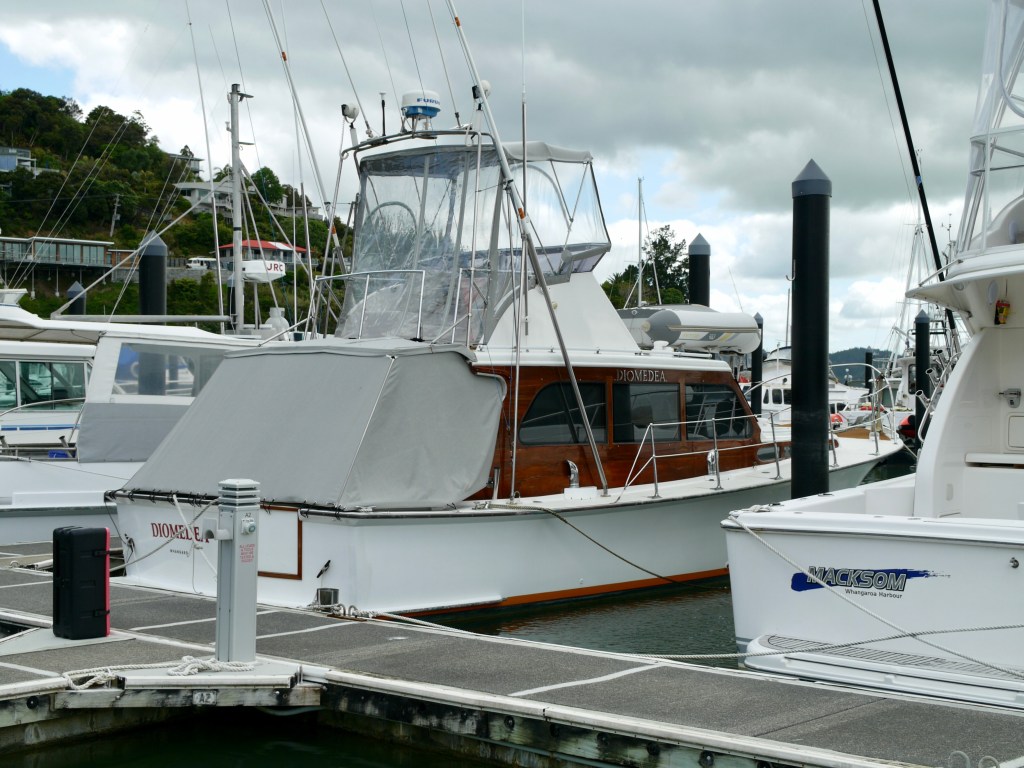 Back in 2016 I photographed the 1965 built launch DIOMEDEA on two visits to Whangaroa, back then she was starting to look a little tired, so on a visit last weekend to Whangaroa Swordfish Club marina I was very pleased to see that someone has been sharing the love on her and she was now back to her finest condition.