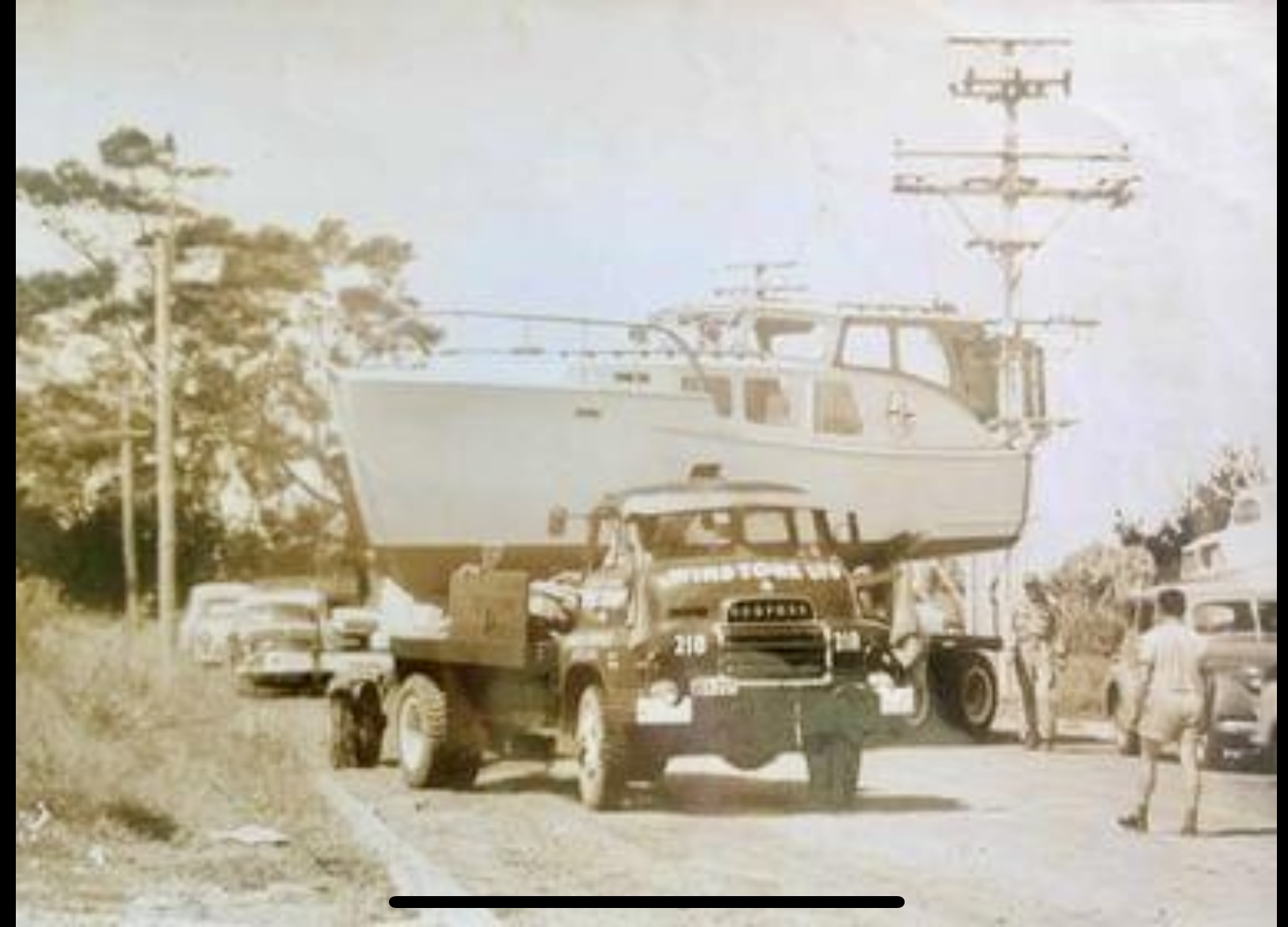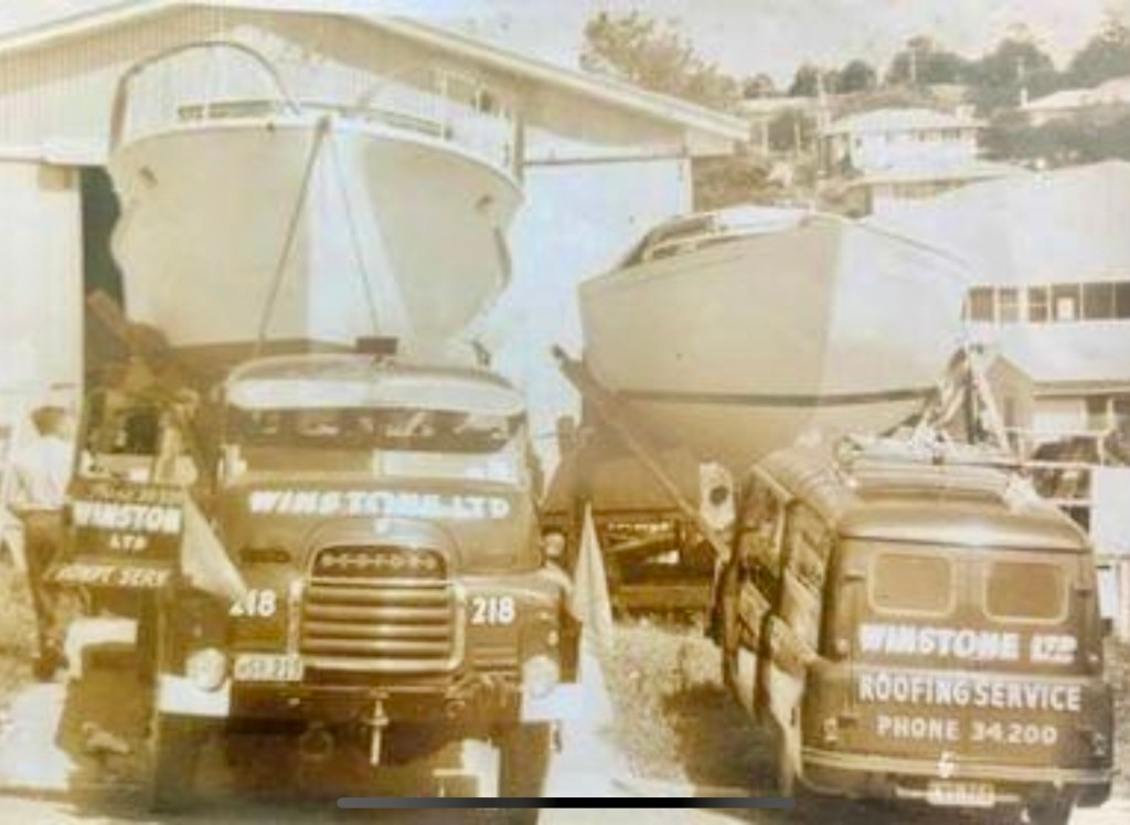John Dawson wrote in earlier in the week that while sniffing around fb he came across the above photos. In them we see a c.1960’s launch built by John Lidgard at this West Auckland yard on a Winstone Ltd transporter on route to launching.