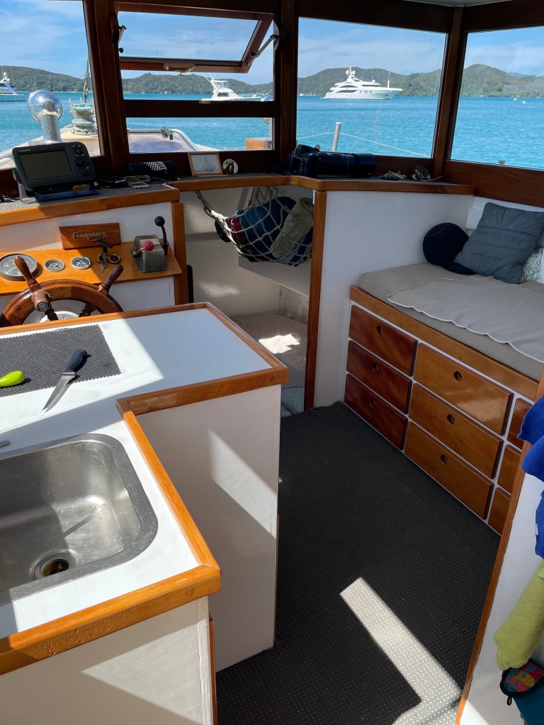 The couple own one of his 30′ boats ‘Faith’ built in 1968, they bought Faith in 2006 and trucked up from Careys Bay, Dunedin. These days she swings off a mooring at the bottom of their garden in the Marlborough Sounds where they live. They met Phil Lange briefly a few years ago. Faith has very similar lines to Phil’s other launch, Tui, but without the flybridge.