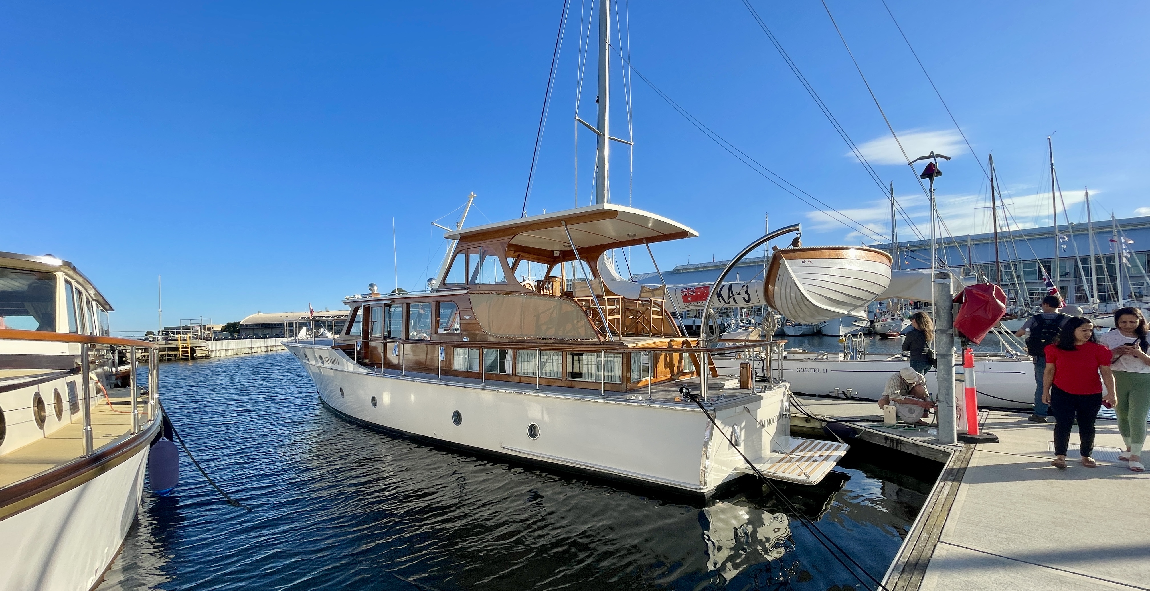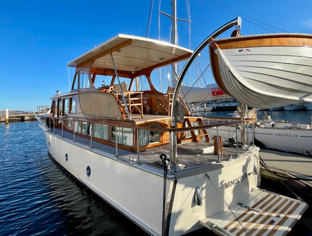 Built by the famous Sydney wooden boat building family – Halvorsen, she was later modified by extending the flybridge roof after more Shae in summer (major consideration in Aust).