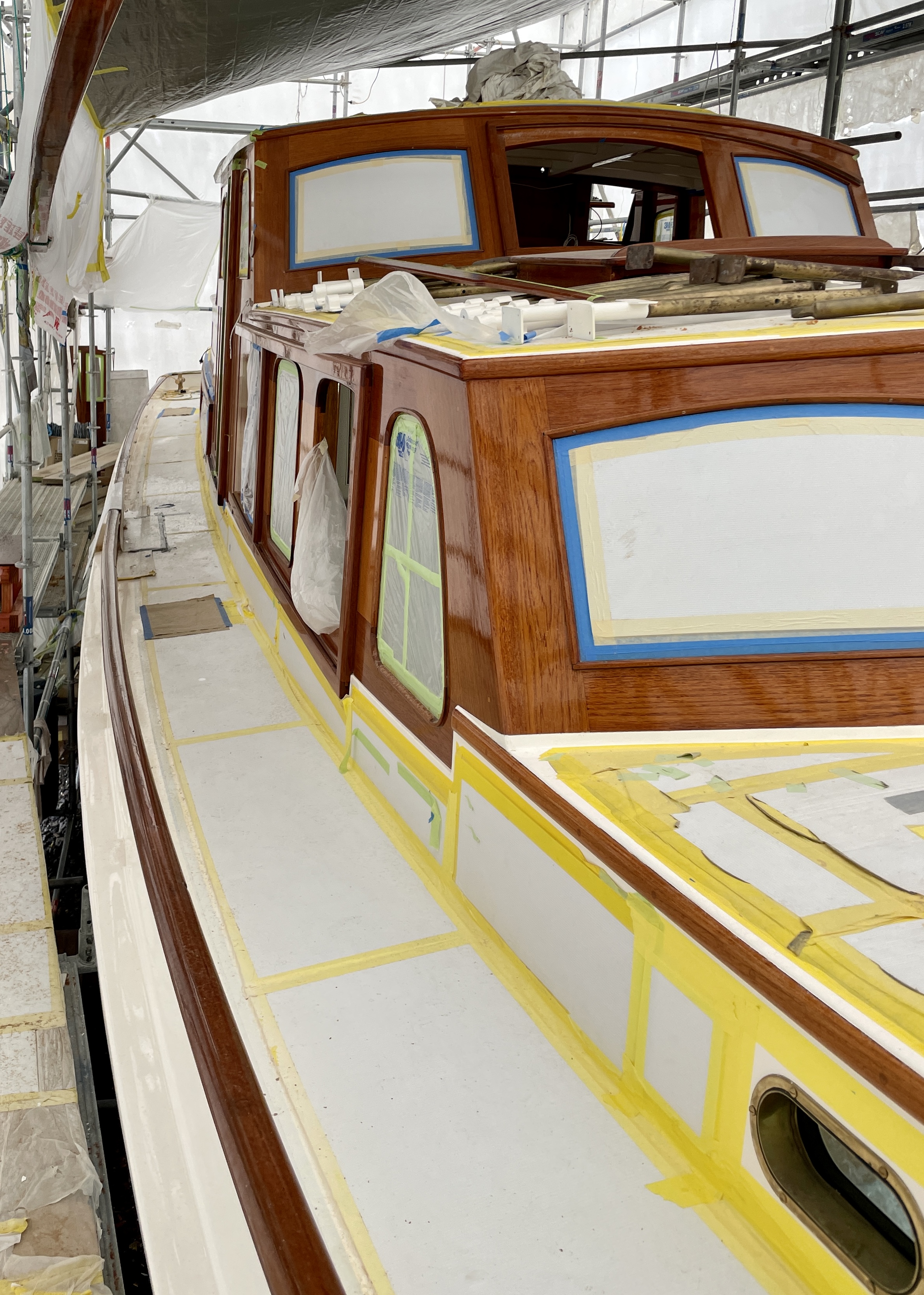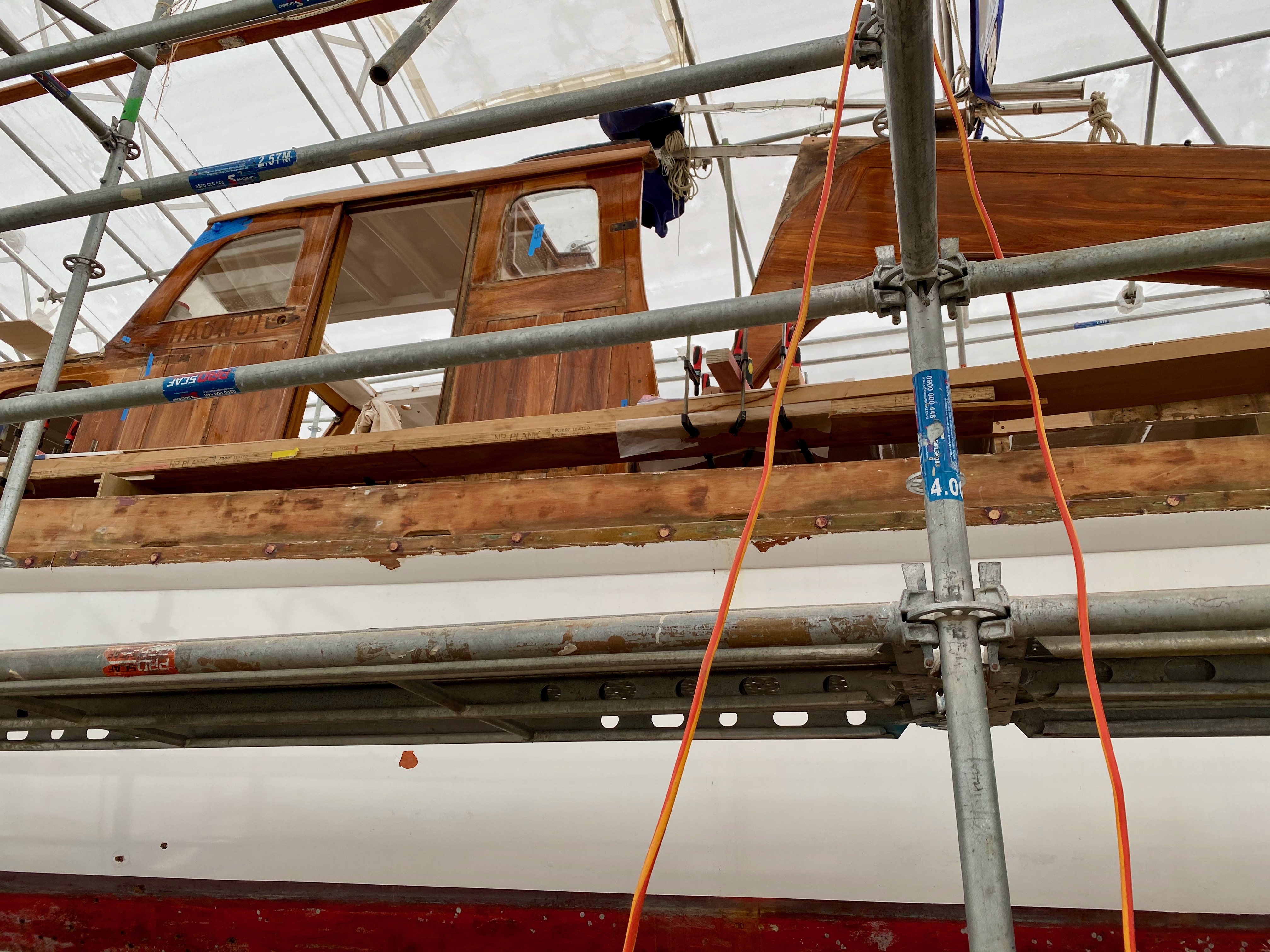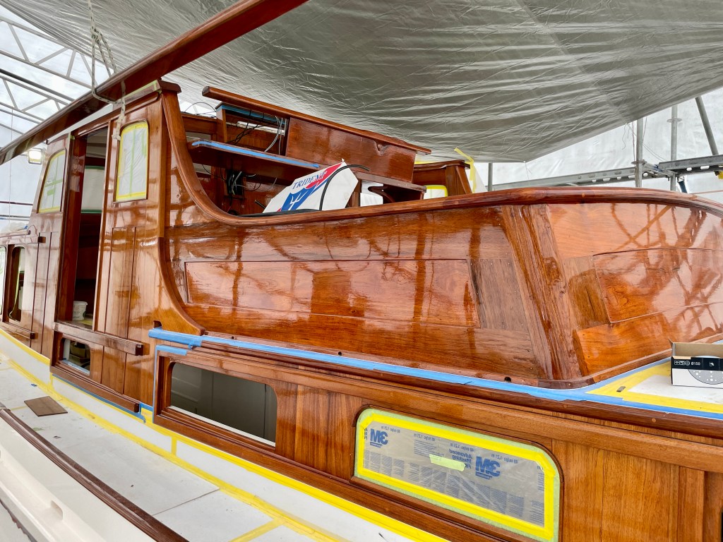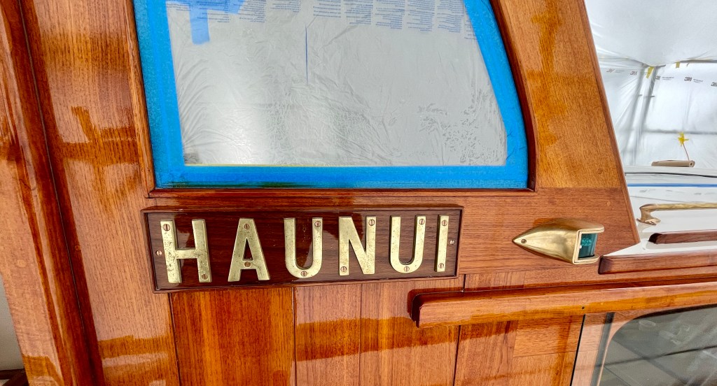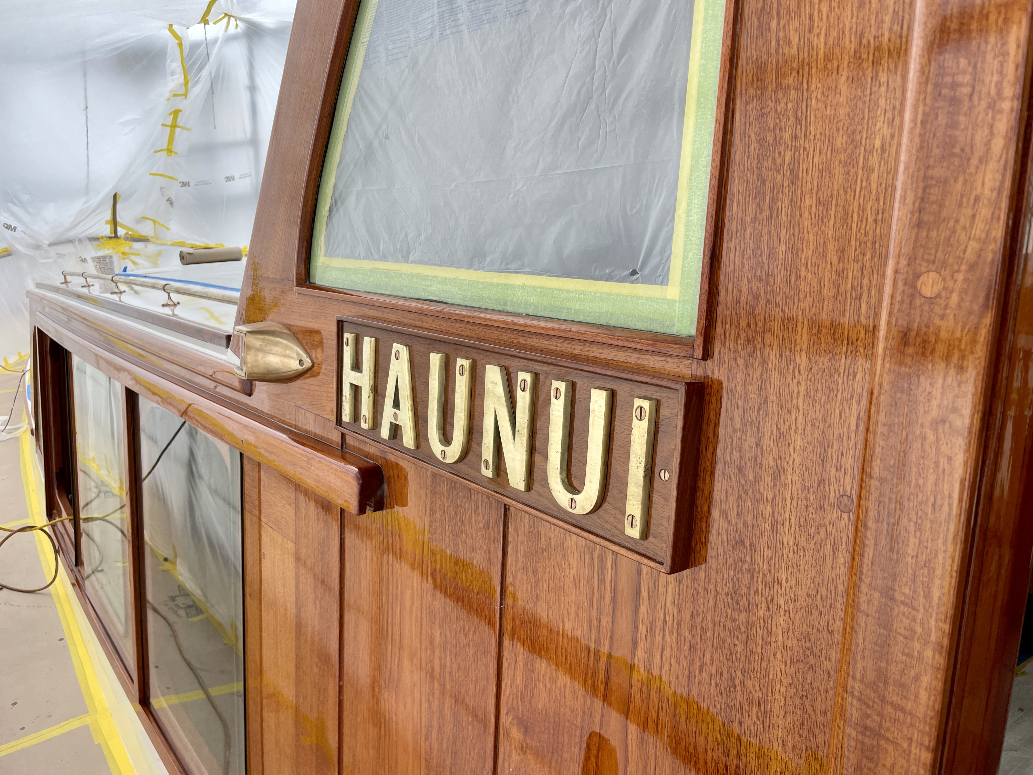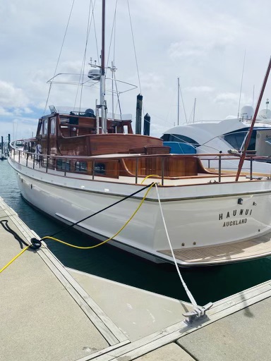 HAUNUI – RESTORATION In between the CV-19 lock-downs one of Auckland’s most beautiful classic wooden motor launches changed ownership – the Colin Wild designed and built 1948 launch – Haunui was sold by Owen Cashmore. In a previous life Haunui was owned by Harry Julian. Haunui was almost immediately hauled out at a private yard and master wooden boat builder Paul Tingey was engaged to return Haunui to her glory days. I showed her new owners over her ‘cousin’- Trinidad and they accepted the challenge to equal her presentation.