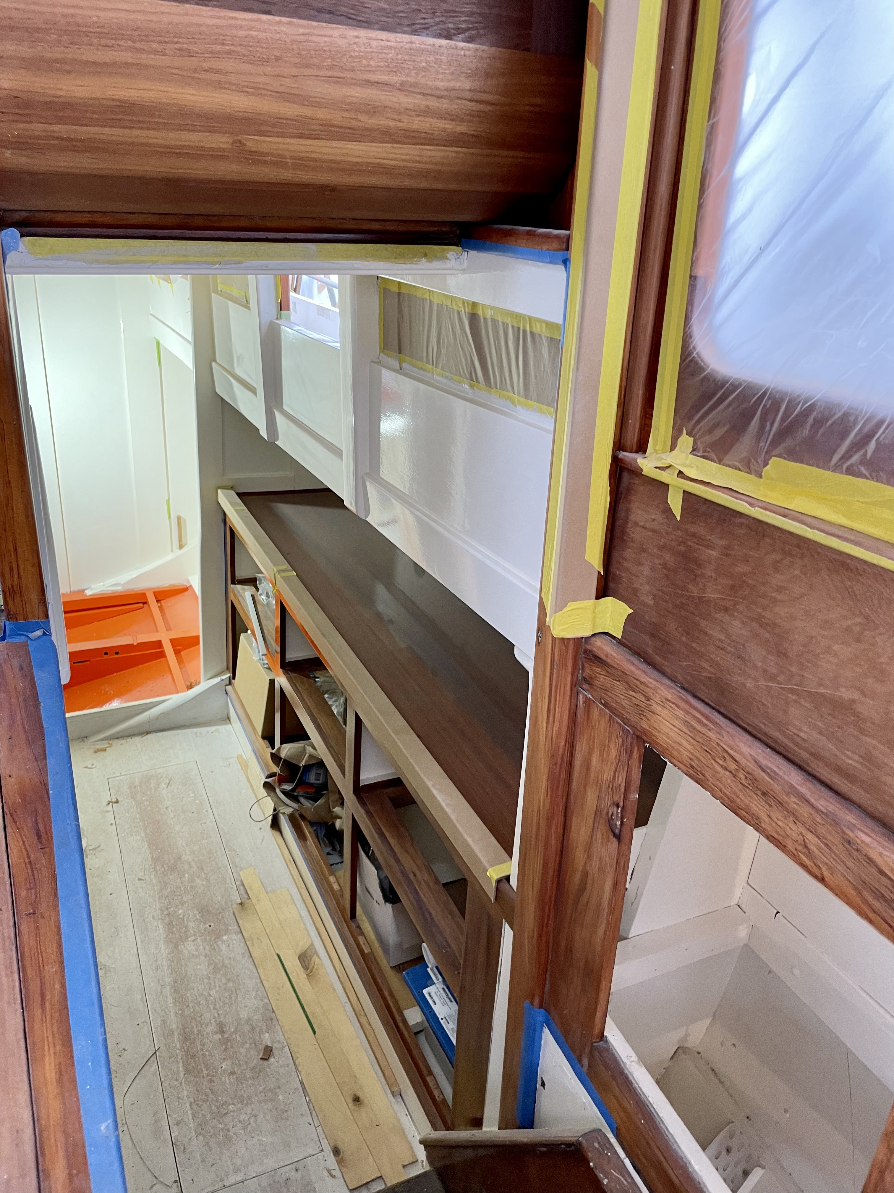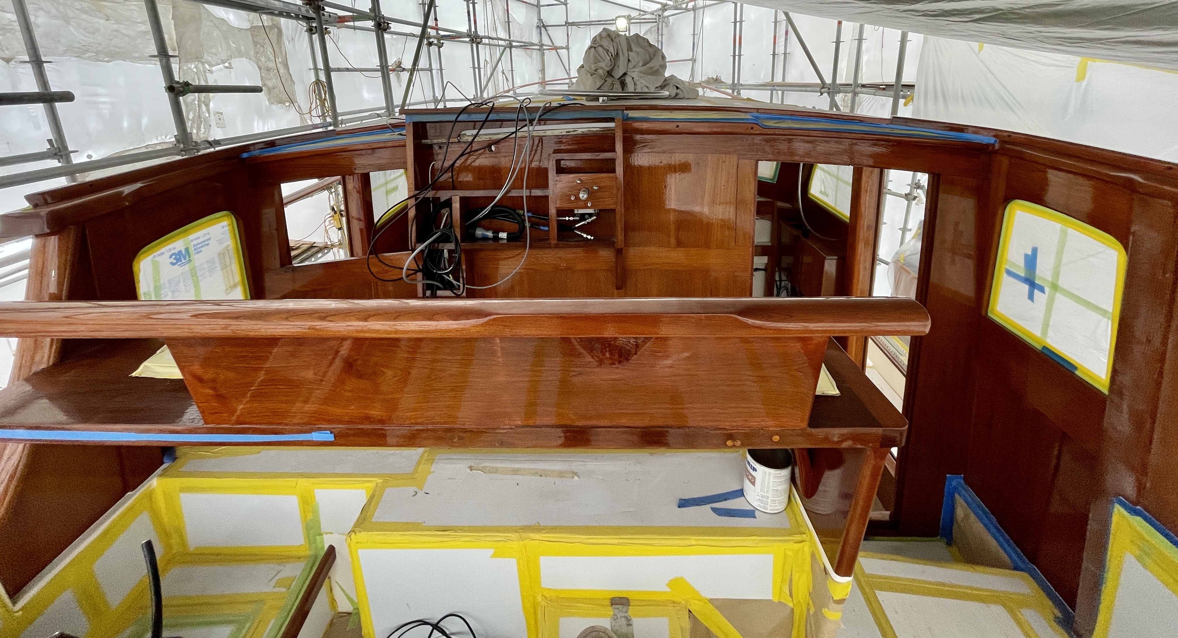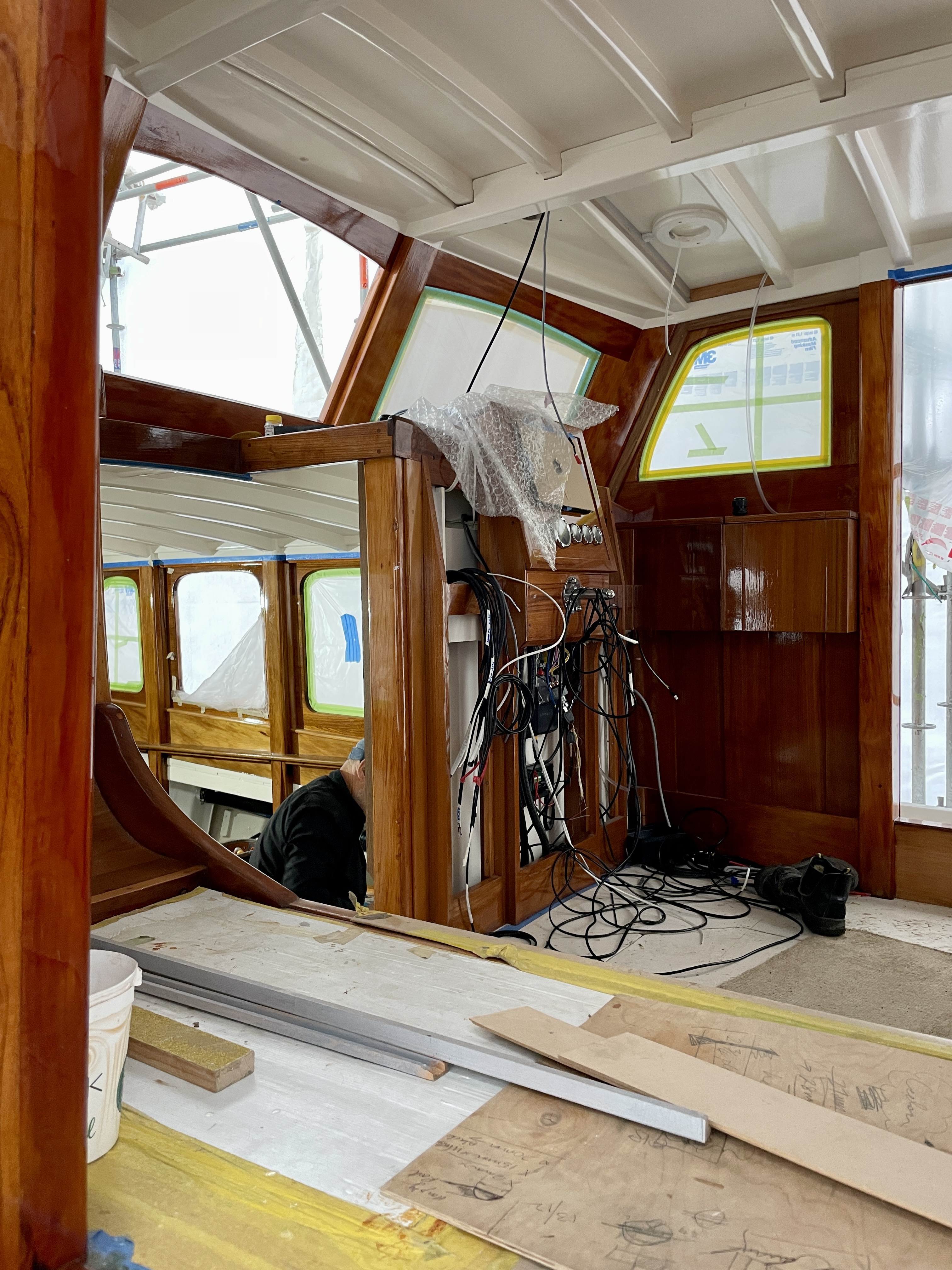 In the interest of keeping you all abreast of the process of the restoration of 1948 Colin Wild built launch – Haunui, last week I paid a visit to master craftsman Paul Tingey. It has been 8 months since my last visit (where does the time go) and Paul and his team have made big advancements on the project. At first glance – lots of glowing timber either on display or peeking out from behind masking tape, but oh boy the focus is on systems, and the team are performing magic in terms of the available space and keeping it out of sight.