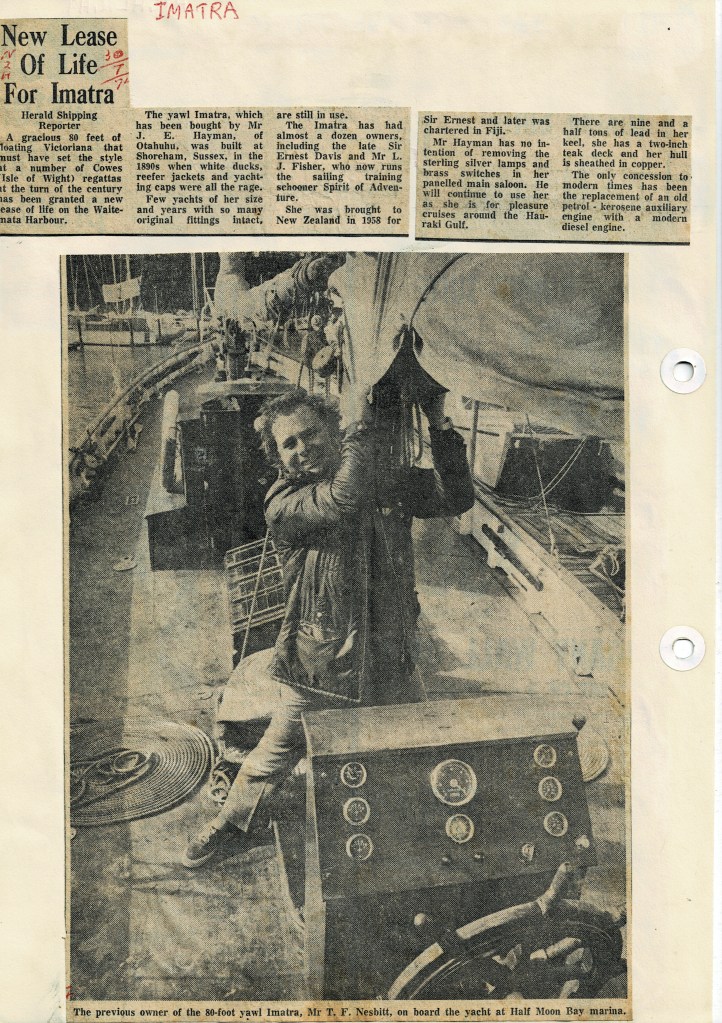 Input From Harold Kidd – IMATRA left England for NZ in December 1948. Ernie Davis bought her in 1949. L.J.Fisher owned her later then A.M. Jenkinson (1964) then Jack Hayman. SOMEONE’S GOT TO DO SOMETHING!